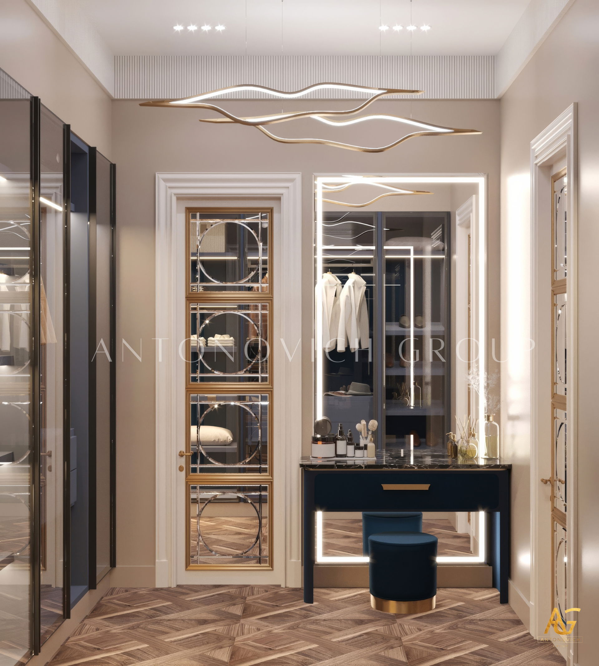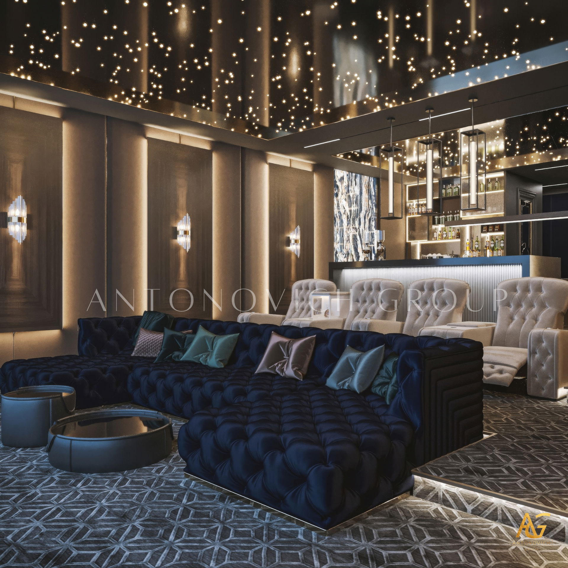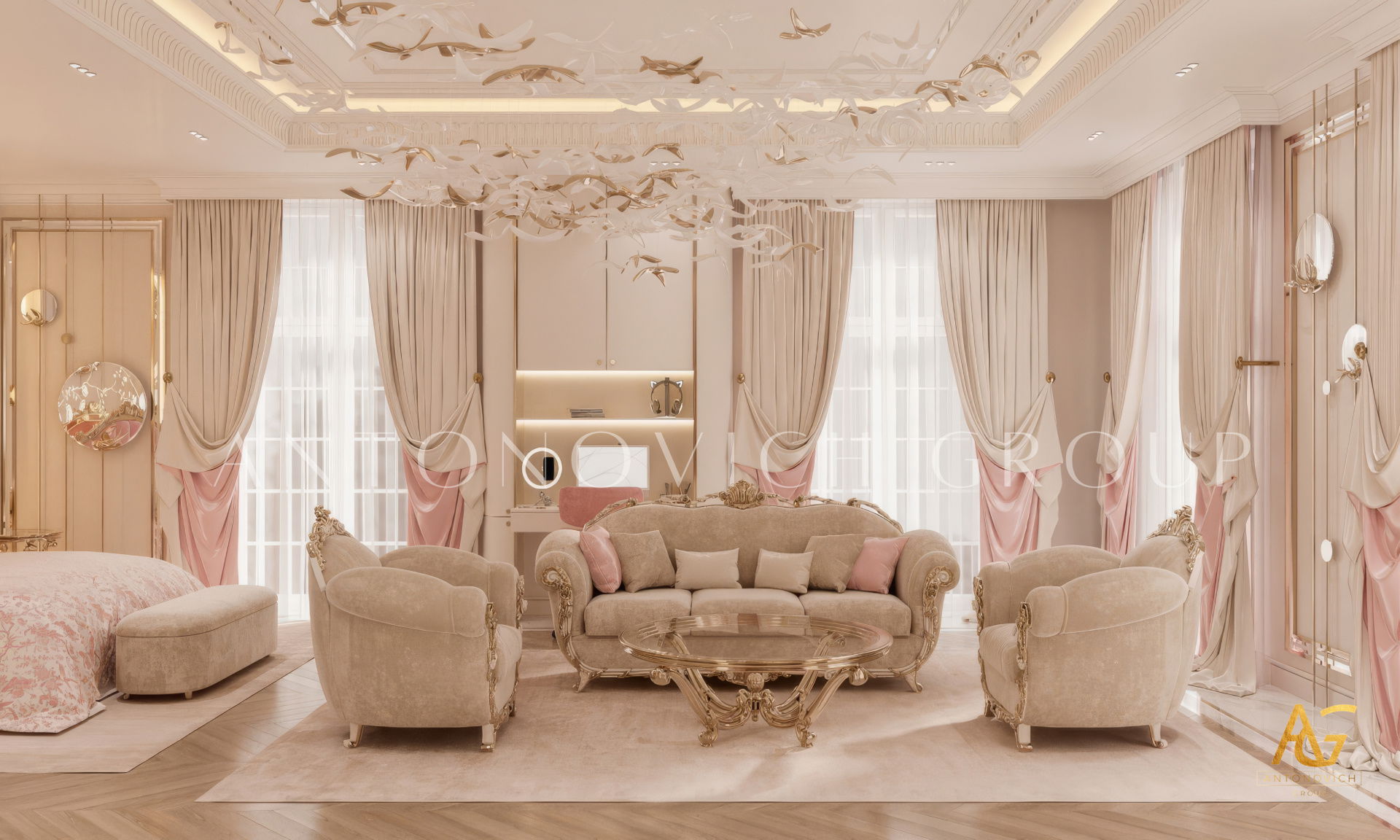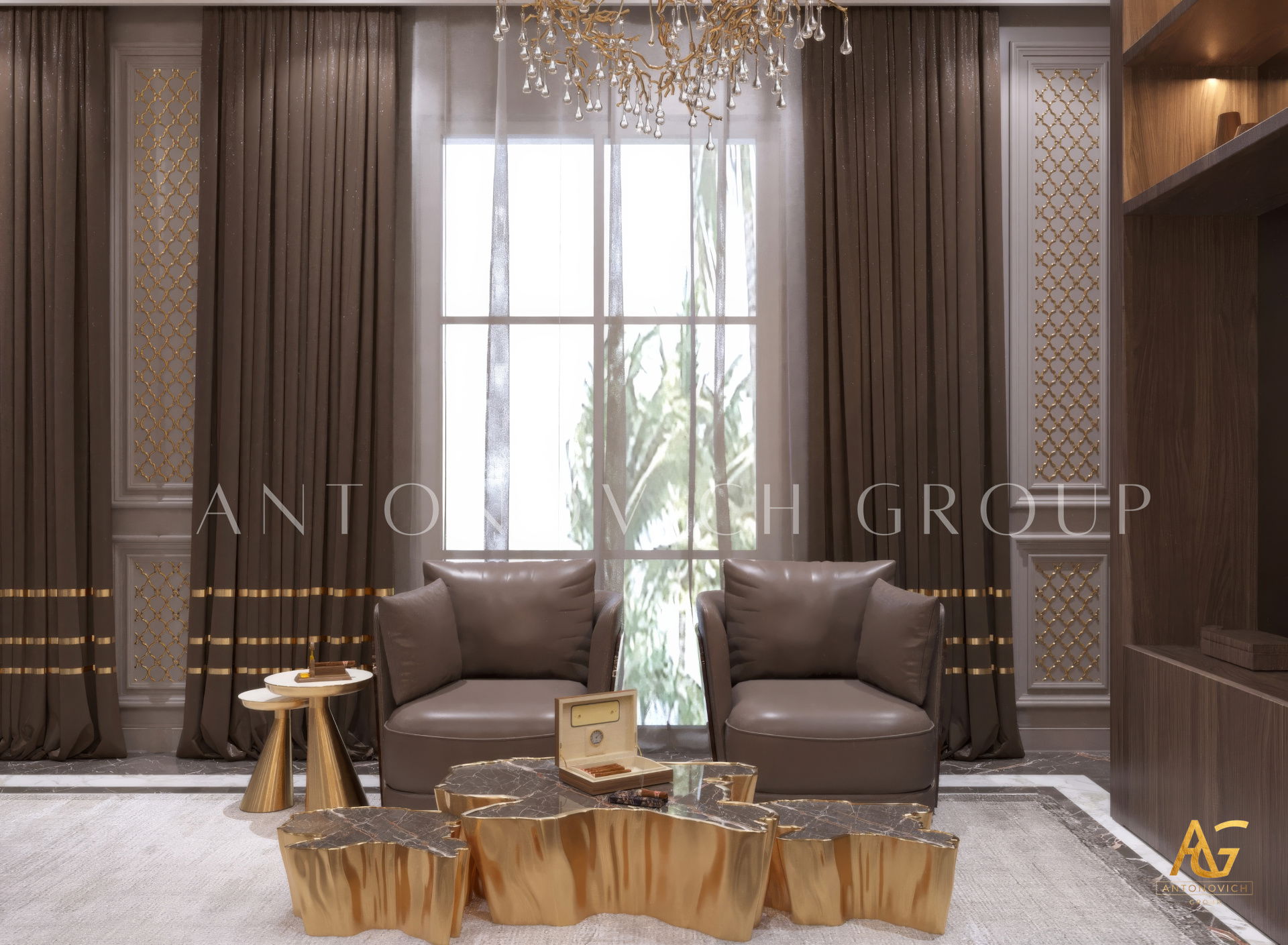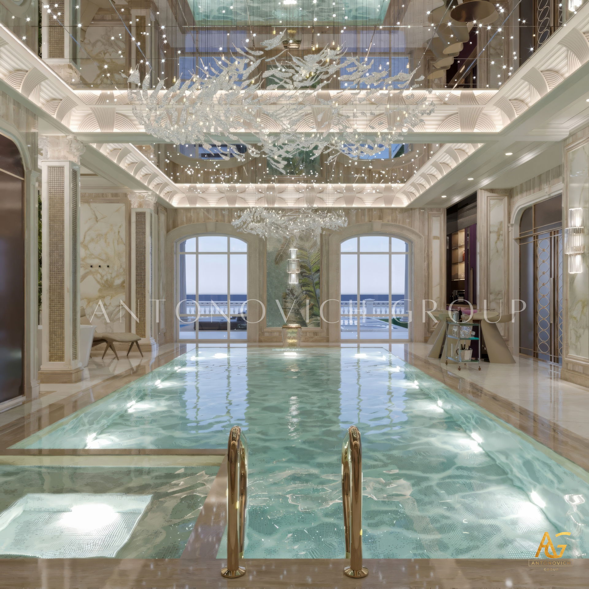 The grand and majestic villa project in Abu Dhabi is a masterpiece of creativity of talented interior designers from design studio Luxury Antonovich Design. The interior, which can be enjoyed forever. The interior, which gives a sense of aesthetic pleasure. The interior, about which you can write a poem or a symphony. A large and close family with aristocratic roots is lucky to have such a luxurious villa interior Abu Dhabi. Interior designers skillfully twist the classical style, Baroque and Rococo, complementing the subtle hints of Oriental style. The floor is made of natural marble with carved patterns, like a painting of a great artist. Thr floor on the ground floor can be admired from the height of the balustrade of the second floor. A delightful fireplace composition looks luxurious. Majestic image of the interior is complemented with rich decor of walls and ceilings. Interior designers perfectly organized a large spaceof the house, emphasizing the benefits of the architectural plan. The interior design combines stunning grandeur of the palace with the warmth of contemporary comfort. Furniture upholstered in noble creamy velvet and luxurious drapes of silk in soft blue hues look home-warm and cozy. Massive crystal chandelier fills the interior with festive mood. Noble status of respectable apartment is perfectly emphasized with the art of painting in the decoration of the walls and ceiling in the best traditions of the Renaissance. The interior design from the studio Luxury Antonovich Design is a fine art that will go in history and will delight more than one generation.
