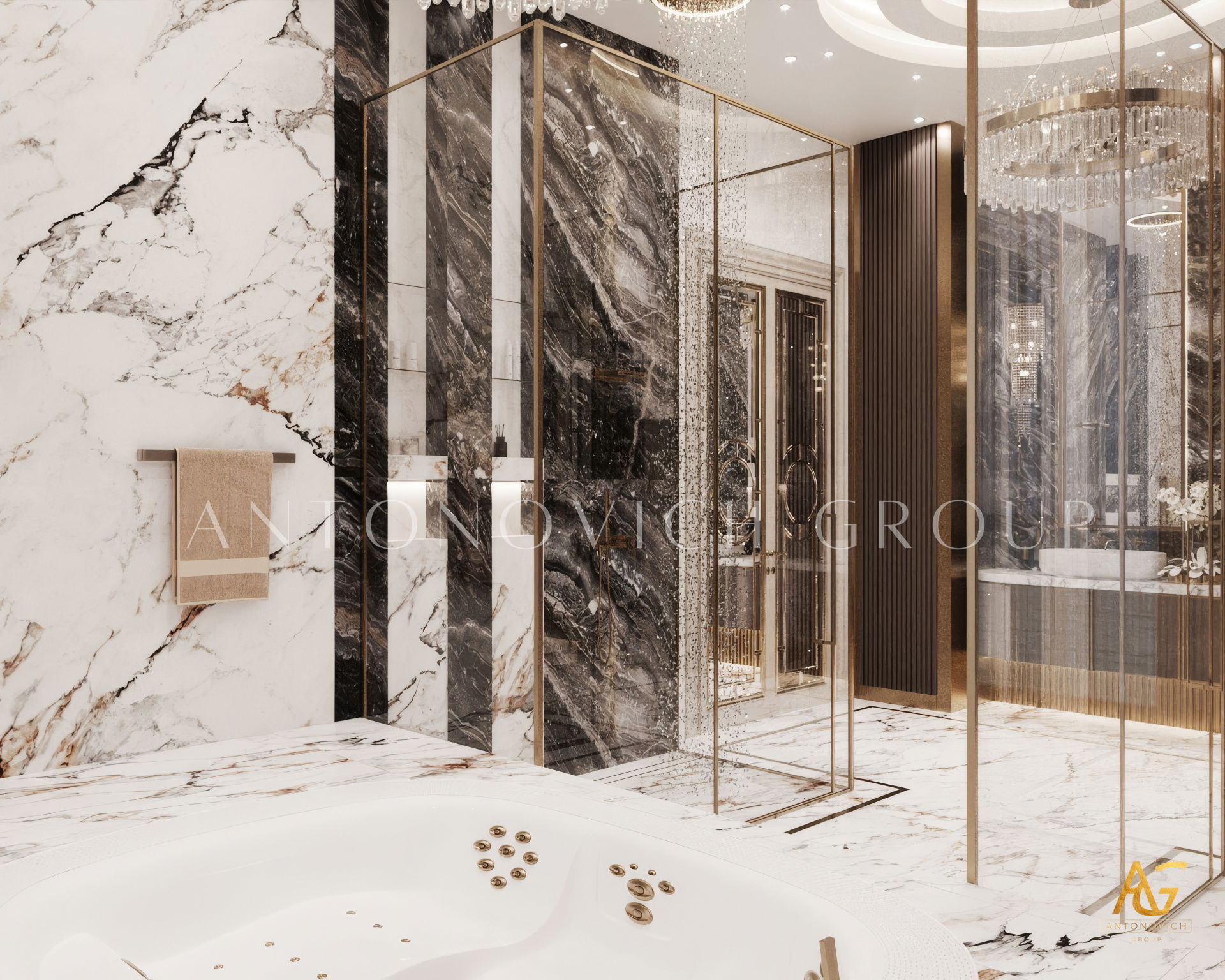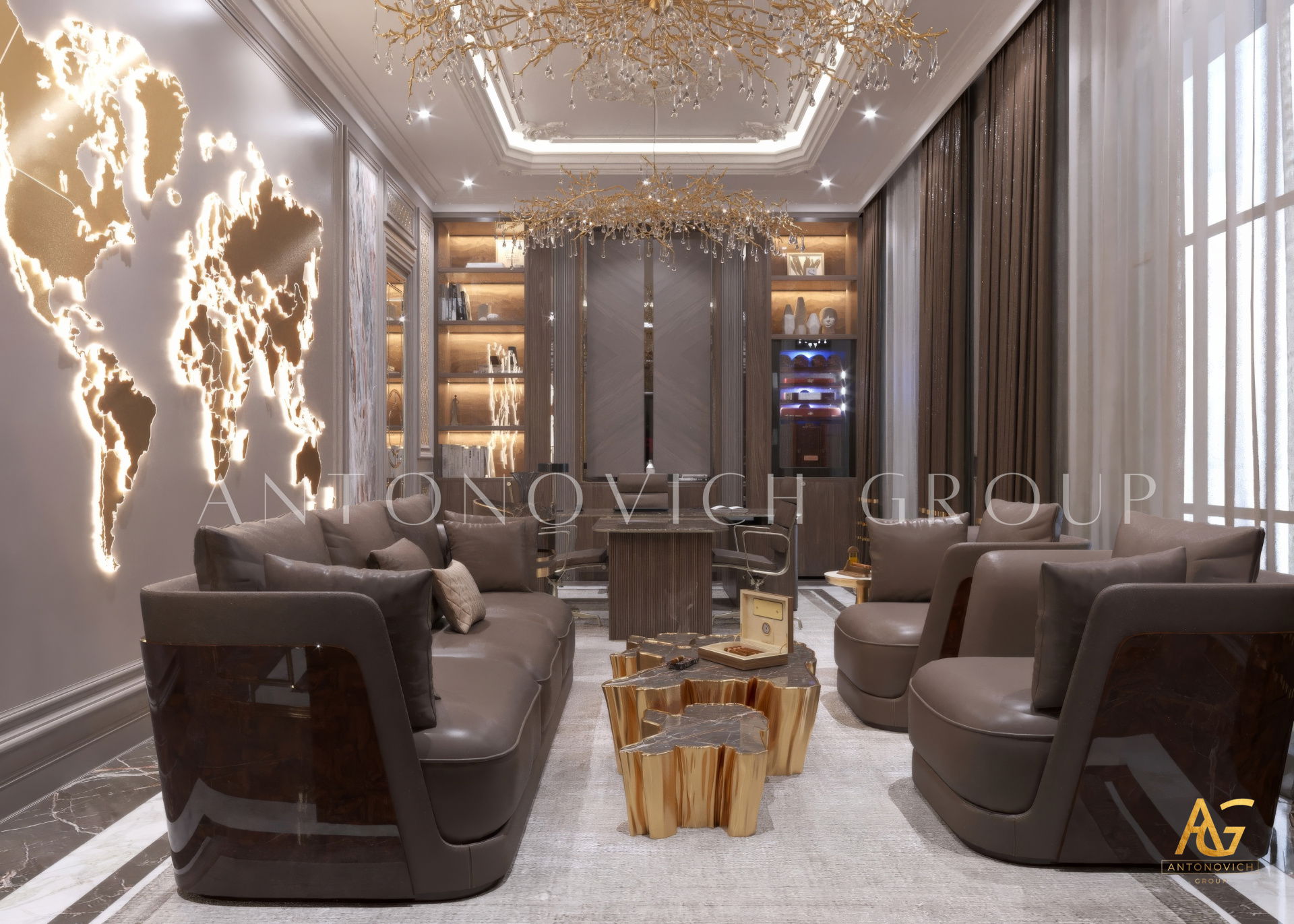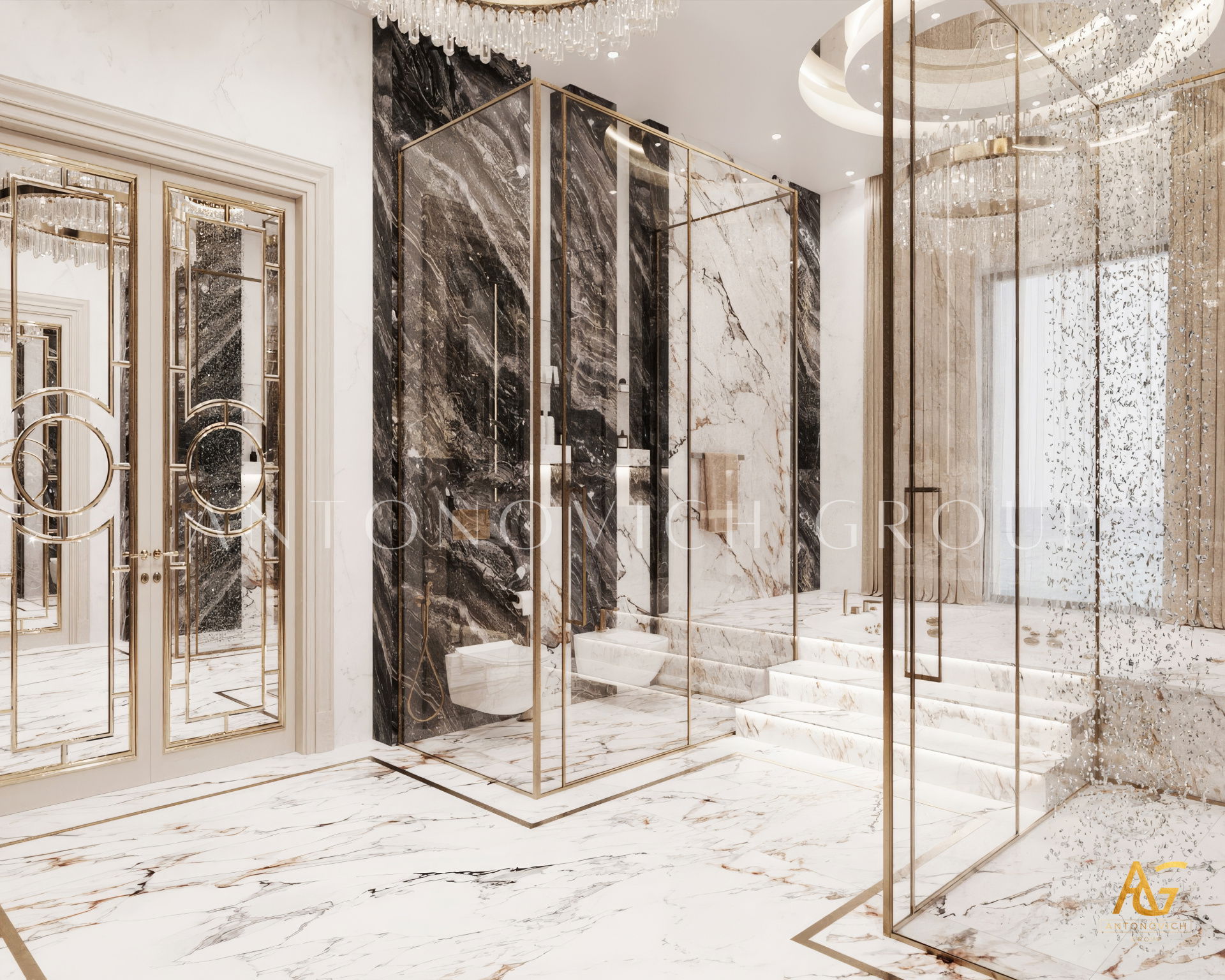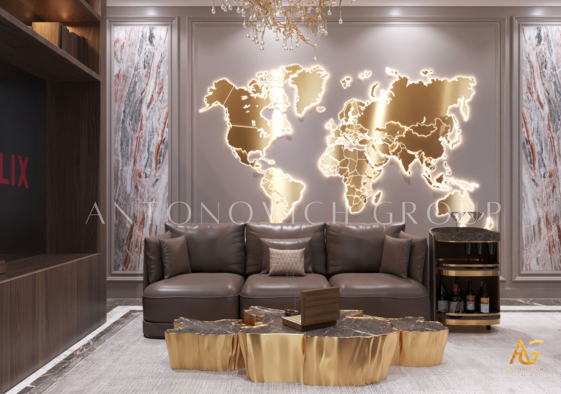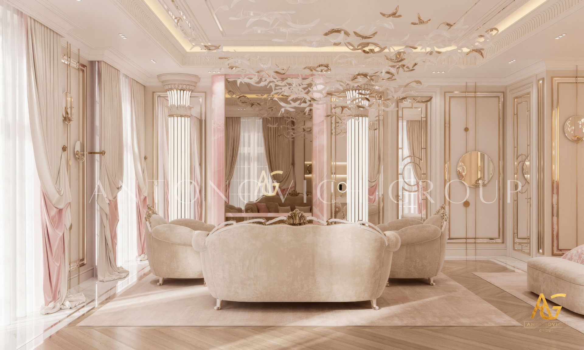 The grand and majestic villa project in Abu Dhabi is a masterpiece of creativity of talented interior designers from design studio Luxury Antonovich Design. The interior, which can be enjoyed forever. The interior, which gives a sense of aesthetic pleasure. The interior, about which you can write a poem or a symphony. A large and close family with aristocratic roots is lucky to have such a luxurious villa interior Abu Dhabi. Interior designers skillfully twist the classical style, Baroque and Rococo, complementing the subtle hints of Oriental style. The floor is made of natural marble with carved patterns, like a painting of a great artist. Thr floor on the ground floor can be admired from the height of the balustrade of the second floor. A delightful fireplace composition looks luxurious. Majestic image of the interior is complemented with rich decor of walls and ceilings. Interior designers perfectly organized a large spaceof the house, emphasizing the benefits of the architectural plan. The interior design combines stunning grandeur of the palace with the warmth of contemporary comfort. Furniture upholstered in noble creamy velvet and luxurious drapes of silk in soft blue hues look home-warm and cozy. Massive crystal chandelier fills the interior with festive mood. Noble status of respectable apartment is perfectly emphasized with the art of painting in the decoration of the walls and ceiling in the best traditions of the Renaissance. The interior design from the studio Luxury Antonovich Design is a fine art that will go in history and will delight more than one generation.