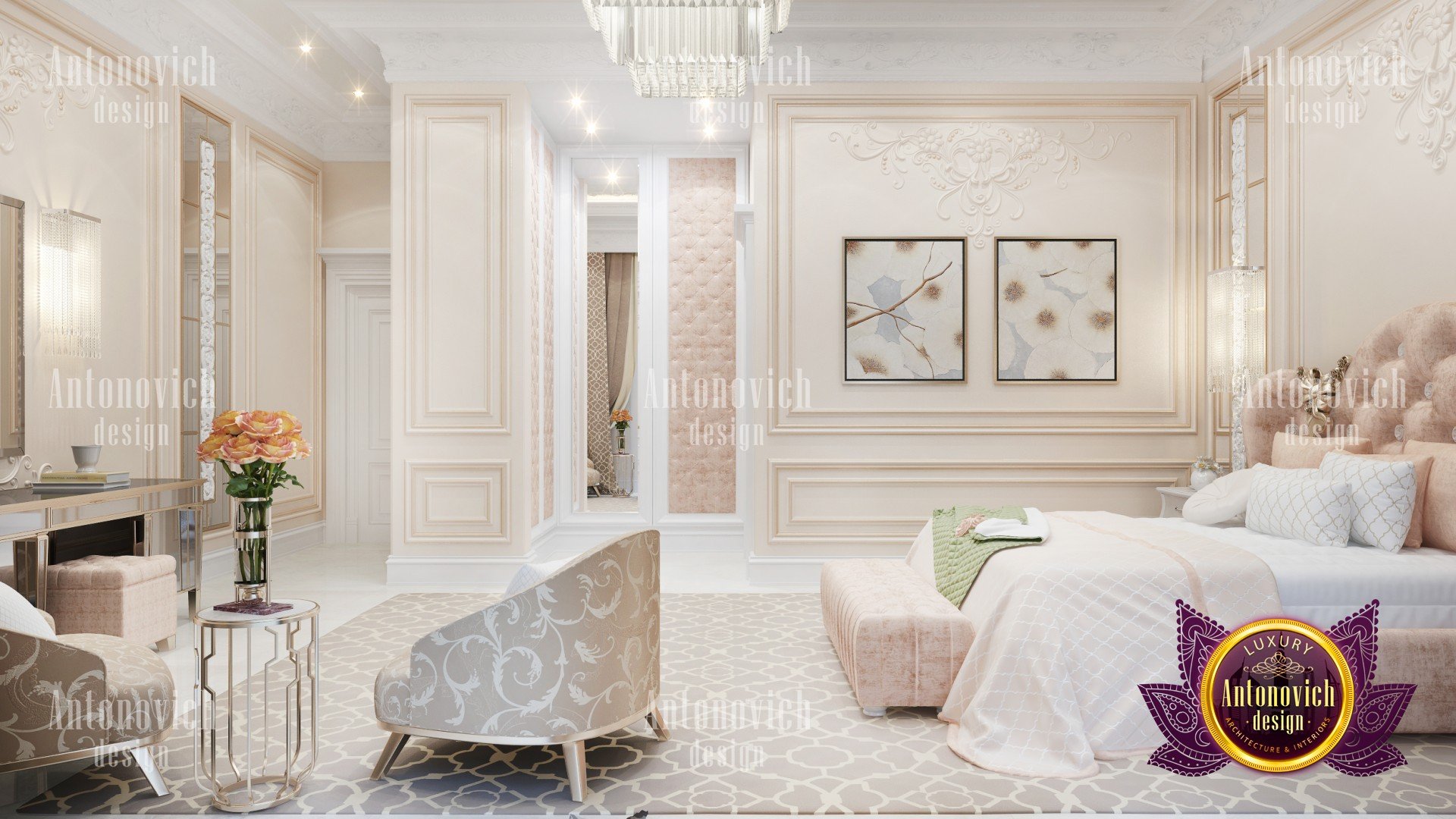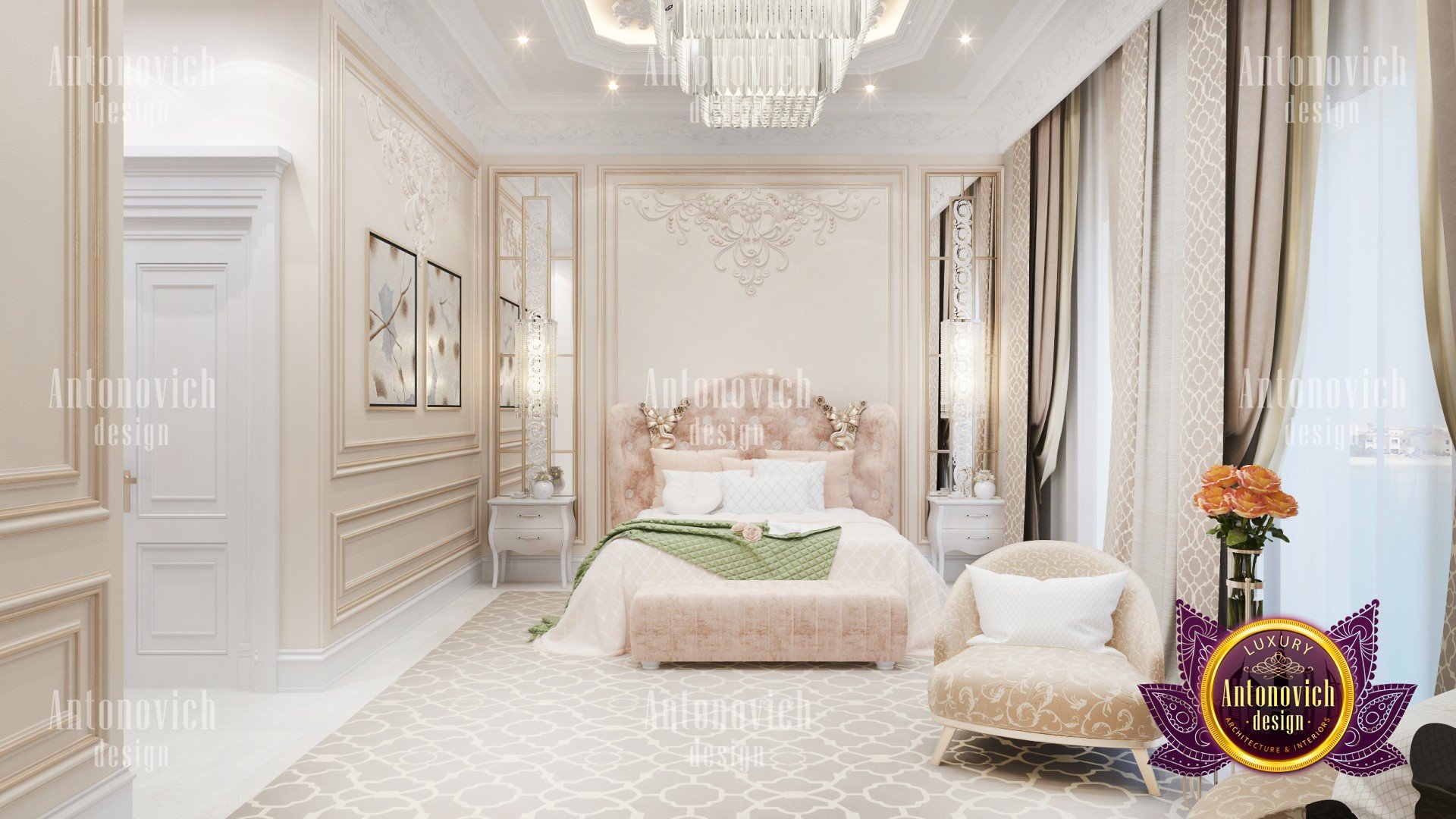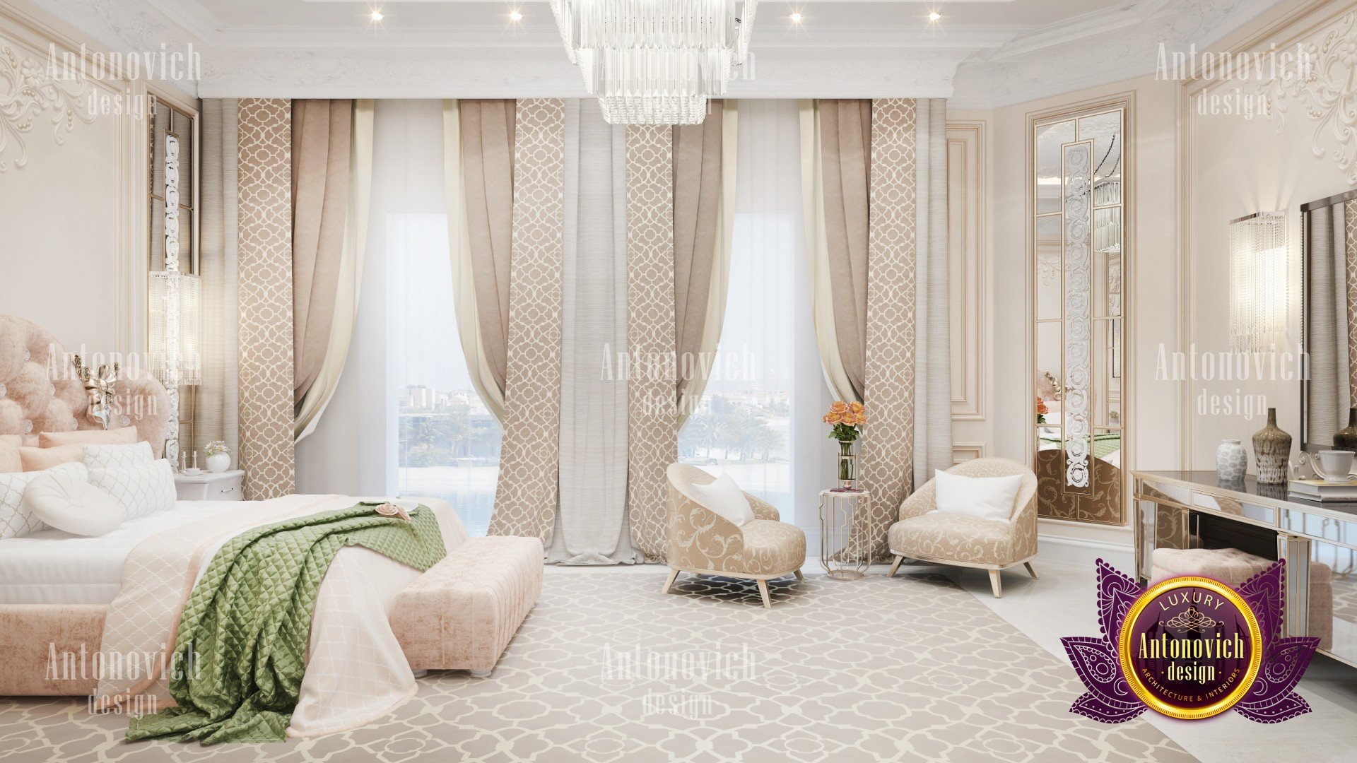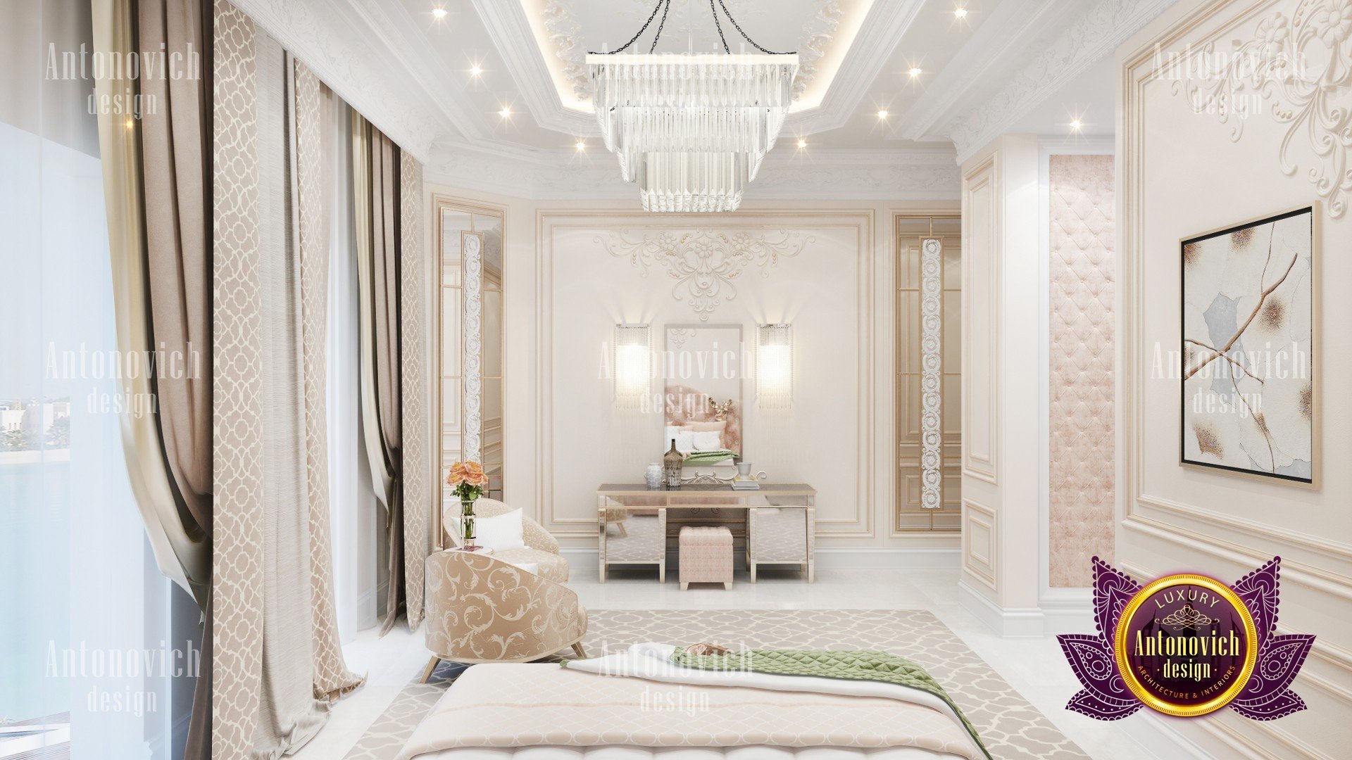 Sweet bliss invisibly poured into a luxurious bedroom. Bedroom interior design is somewhat different from other areas of interior design. Its all about relaxing and cozy moment with seductive accents. Interior design Dubai by studio Luxury Antonovich design continues to offer their customers unique and extraordinary projects. And the character of the interior necessarily becomes thin reflection of the character of the owner of a house or apartment. We make every accent, every square meter dedicated comfort for our customers. Villa Design in Dubai is in the Art Deco style. And if in the interior of the living room and hall everything sparkles and shines of holiday luxury. So the bedroom interior in art deco style gained a unique romantic and "delicious" hue. Interior Design Dubai corresponds to the fashion trends. Noble materials, established traditions miraculously infused with innovations and innovative design ideas. Technology affects almost every aspect of modern interior, adding luxury and comfort of intelligence shade. Bedroom interior design has a bright character, thanks to the emphasis in the form of spectacular decor elements. High ceiling decorated with an original ornament that plays with wonderful light, thanks to the elegant chandeliers and more lighting. Lines of mirrors complement the ceiling decor and reflect luxury bedroom interior. Floor of dark wood looks warm and cozy. Luxurious silk bed complements the bedroom interior decoration with light and gentle mood.