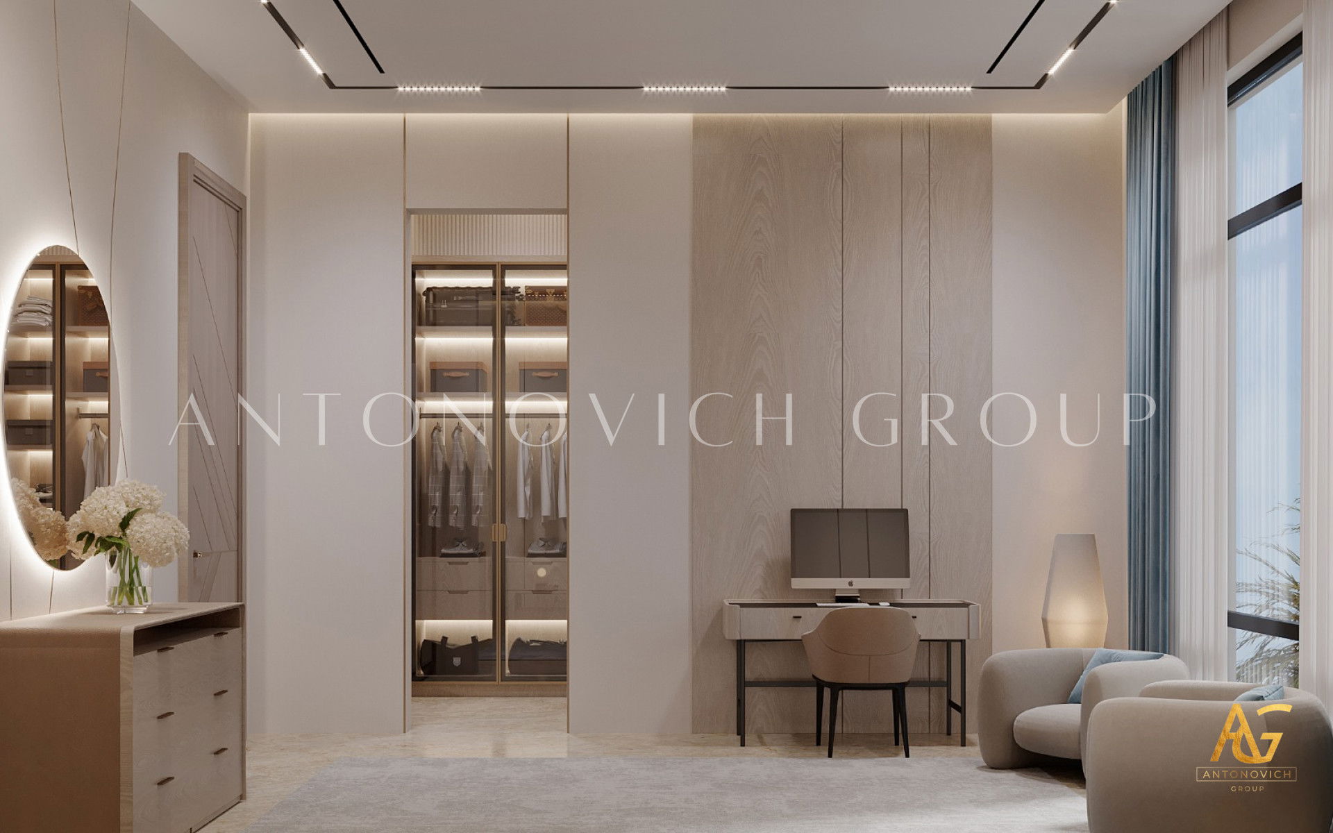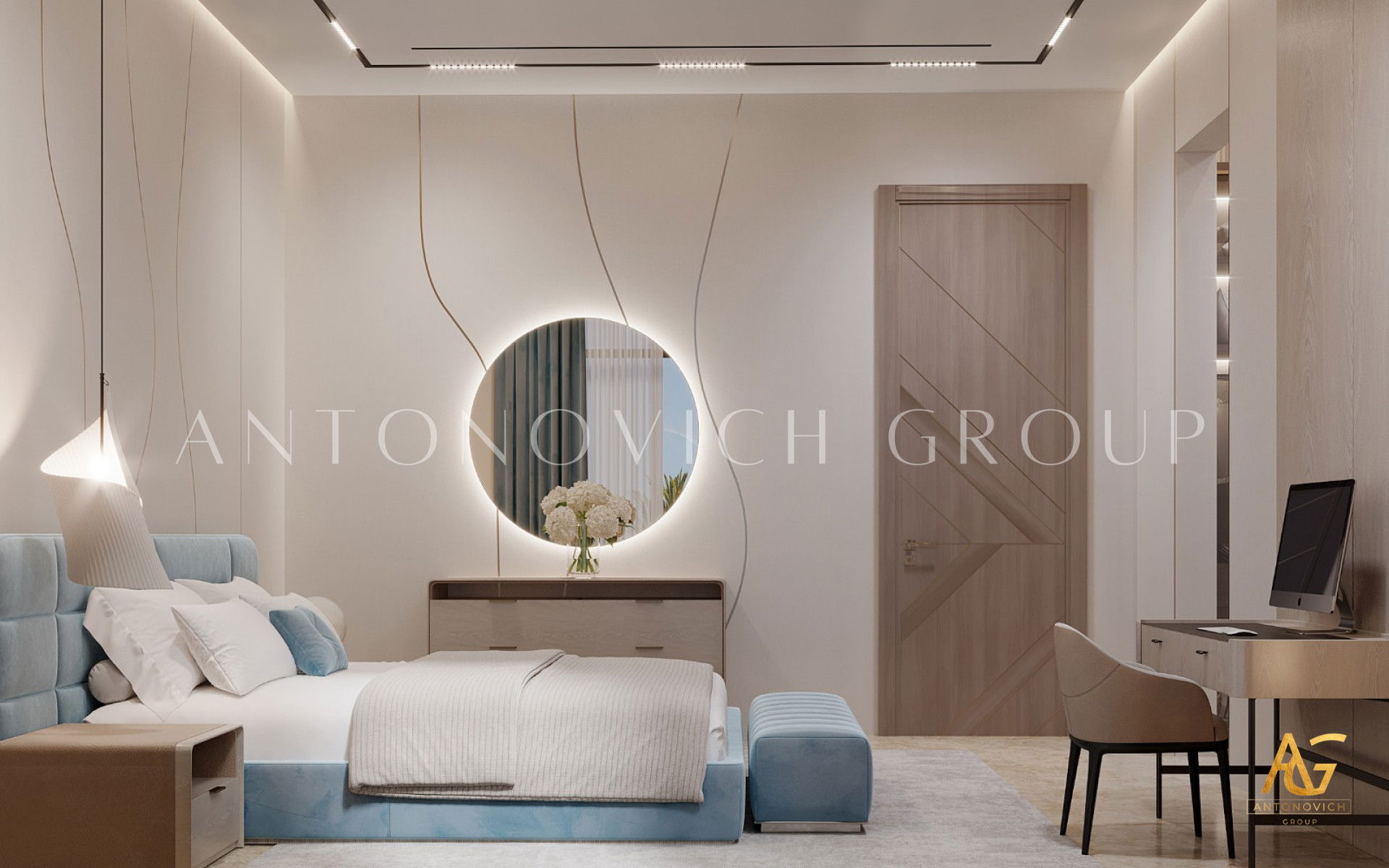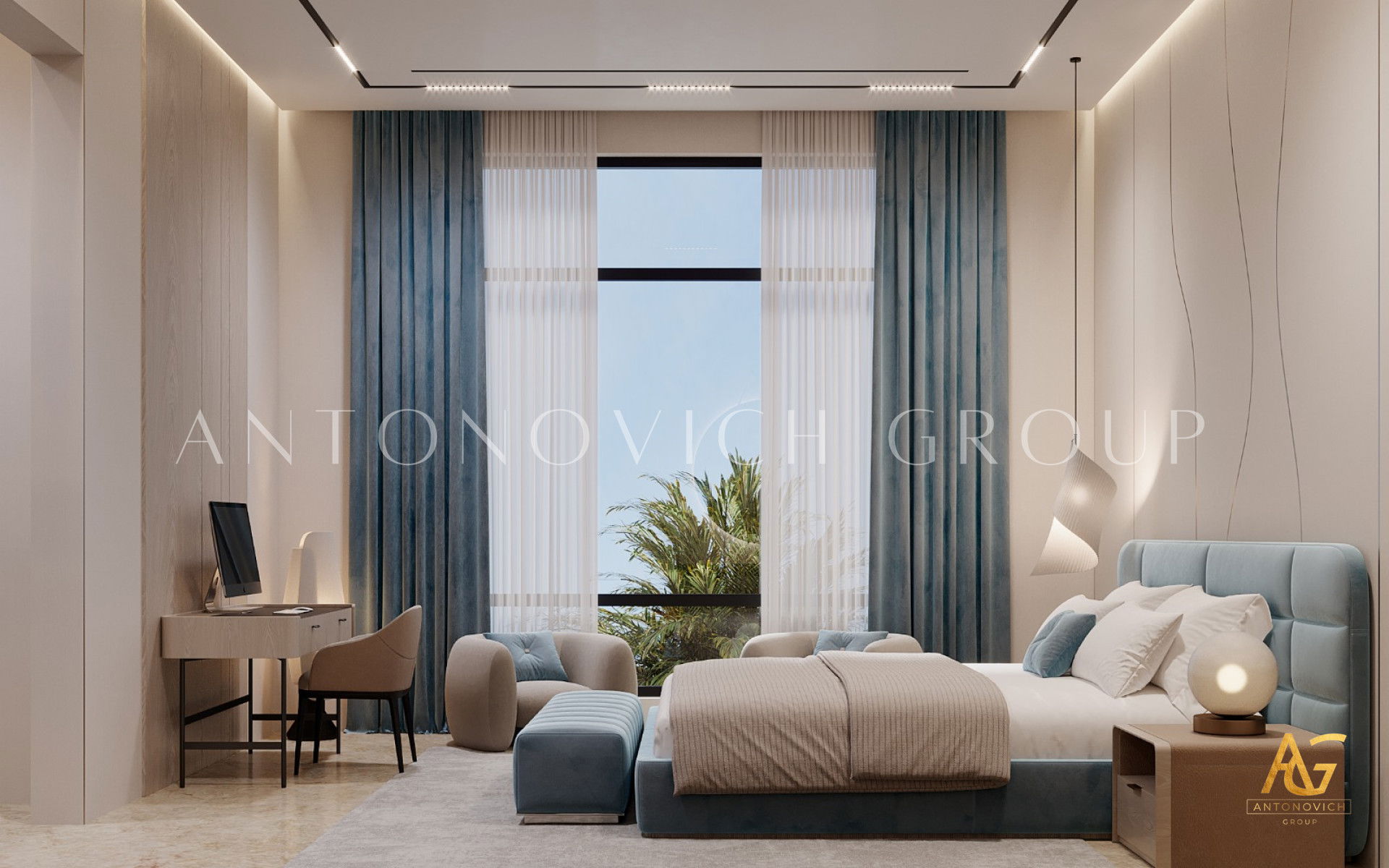 Bedroom interior, one look at which filled with energy, was developed by designers of a design studio Luxury Antonovich Design. Bedroom design with a bright and very unique character is in harmony with the rest of the vivid images of villa in Abu Dhabi. Highly-precise professional 3D projects visualization, which we offer our clients, allows in details to consider your future home. Houses Design Abu Dhabi includes designing of several bedrooms. And each bedroom has become a vivid image of modern luxury and comfort. The basis of the festive mood is bright turquoise color. Noble silk colors are presented in the windows decoration, upholstered wall panels and bedding items. Bedroom design combines modern and classical accents, in the style of Art Deco. Dubai Interior designers have added some bright accents to make the image of a luxurious bedroom even more expressive and beautiful. One of the highlights of the project are curtains of crystal beads in the window design. Also, the ceiling design filled the interior with a sense of celebration. Niches illuminated, through the lace carvings and elegant chandeliers look very elegant and romantic. Wall Decor behind the headboard meets the best traditions of classical style. Arches of niche with elegant pilasters are inlaid with silver carved decor. This luxurious bed is especially lush and gorgeous. The graceful outlines of bed cabinets subtly reflect the general mood of the bedroom interior.
