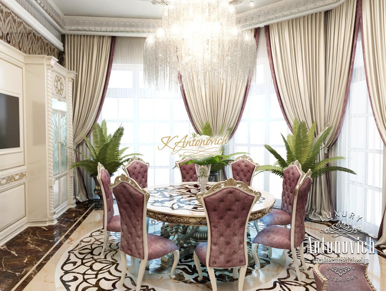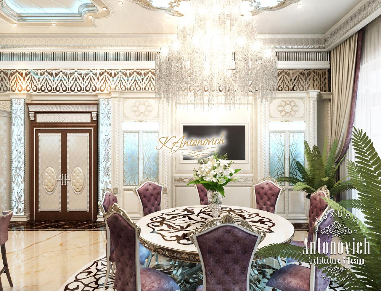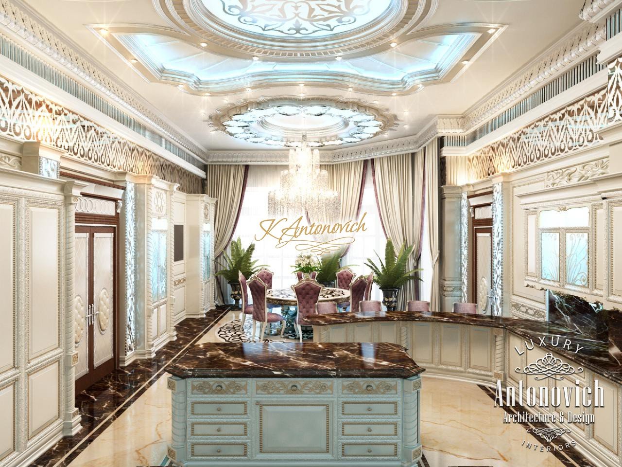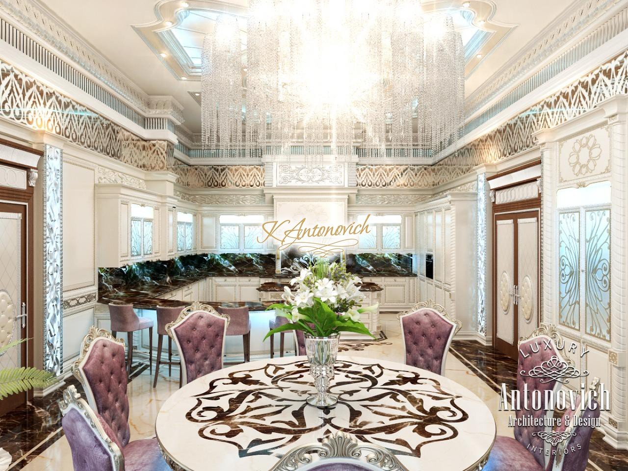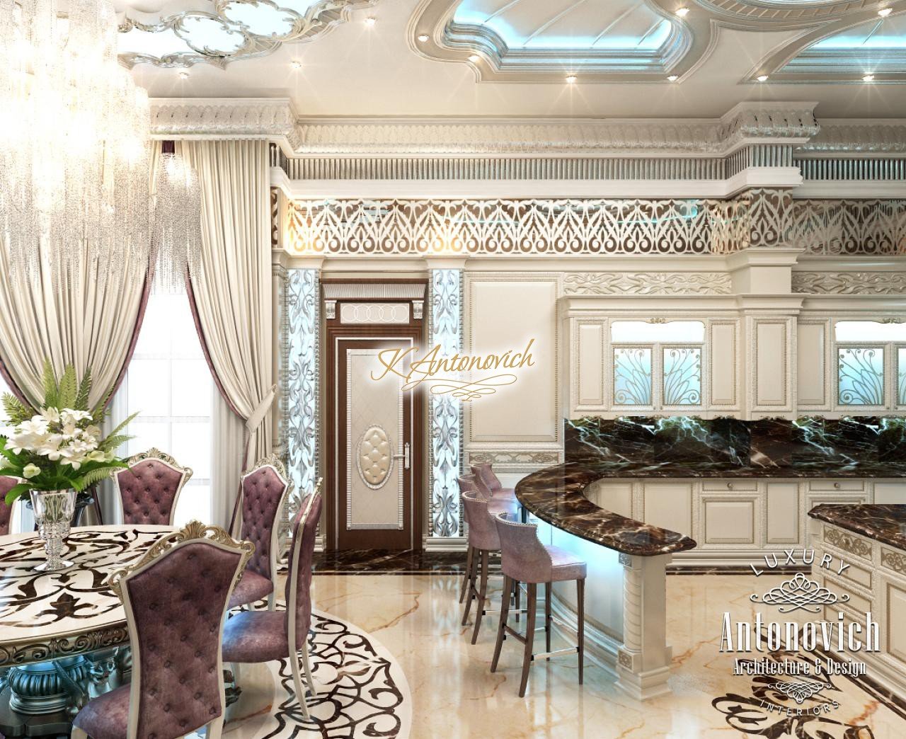 Kitchen design is inextricably linked with the overall design concept of the villa interior in Abu Dhabi. Authors of the project elegantly repeated motifs of luxury living room and hallway in the interior of the kitchen and dining room. The whole villa design in Abu Dhabi is in the style of modern classics with light accents of art deco. The highlight of each author's project of the studio Luxury Antonovich Design is carved floors made of natural marble with designer patterns. These luxurious decor motifs starting in the hall interior and continue in the kitchen interior, which is combined with a dining area. Interior designers in Dubai harmoniously continued and gorgeous decor accents in the ceilings. With floors and ceilings decor authors of the project zoned space, clearly delineated area of the dining room and kitchen. Niche on the ceiling with graceful contours, as befits a modern interior, is complemented with lines of LED backlight. This lighting and chandeliers enhance the expressiveness of the interior and complement the luxurious mood. In the spacious apartment large enough kitchen set is placed. Behind white facade with carved decoration the most modern storage systems and the latest kitchen appliances are hidden. Countertops of noble marble look practical and respectable. The kitchen combines comfort and functionality.