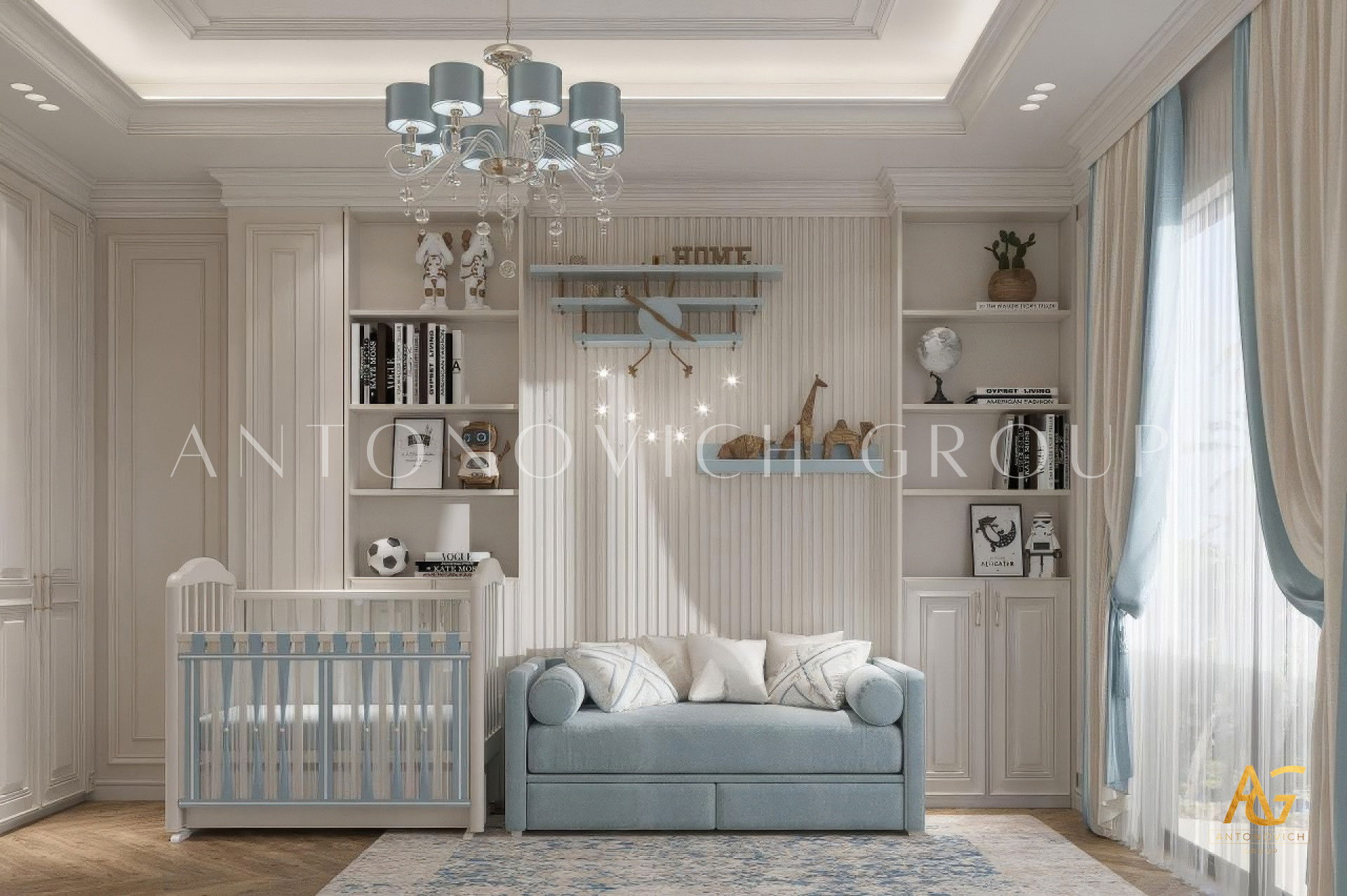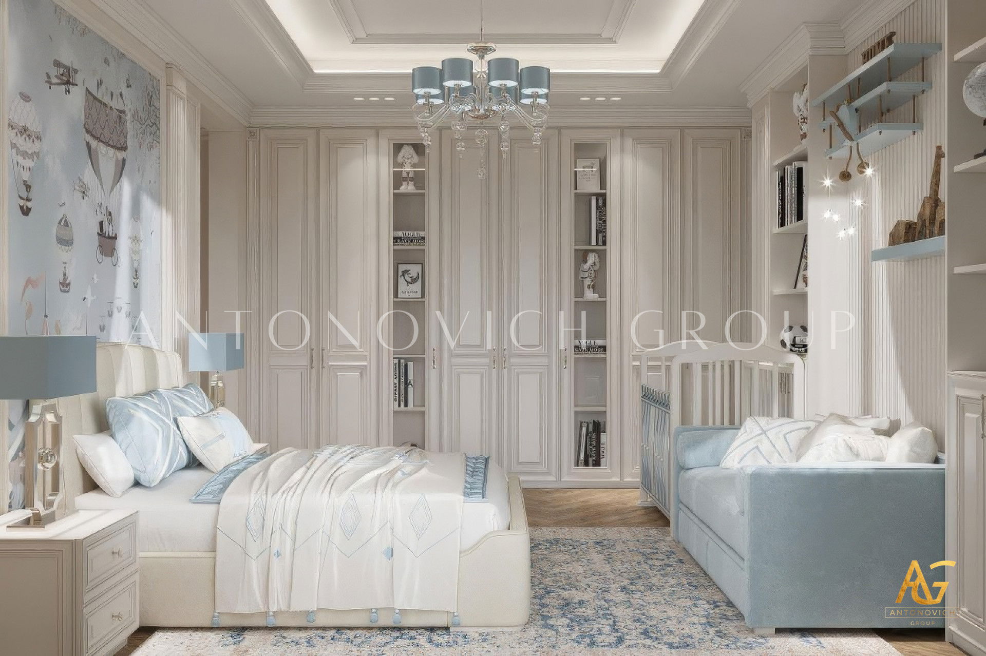 Children's room interior design is a special area in our work, which we are paying close attention. Luxury interior design from studio Dubai Luxury Antonovich Design takes into account the wishes and dreams of every member of the family of home owners. This architectural child's room project was designed for two twin brothers. Villa design in Dubai in general is in the classical style. And only in the children's room interior designers completely gone from the concept and dedicated every detail to the dreams and passions of two twin brothers. Children's rooms design reflect the romantic theme of sea travel. Spectacular design solutions give the children's room cozy original form. Two comfortable beds are stylized under a sea boat. They are united with one headboard of a large wheel. Curtains and decoration of the bed are made of natural plaided fabrics of two shades, which makes the interior perfect and very expressive. Curtains are complemented with noble white silk with original mesh that resembles a light sail. The ceiling design continues romantic mood of the interior. Children's room interior design is in perfect harmony with the inner world of children, their dreams and passions.