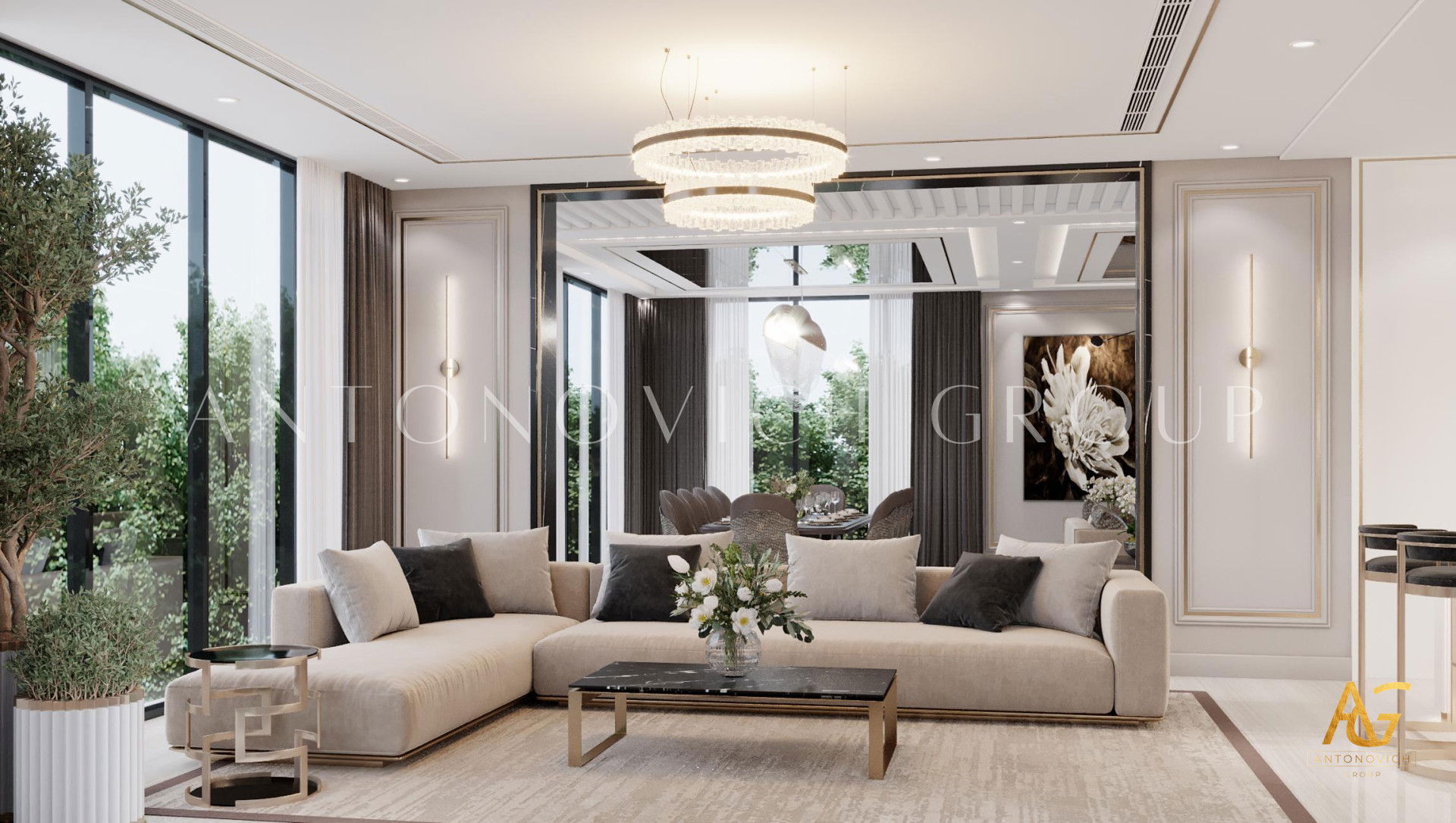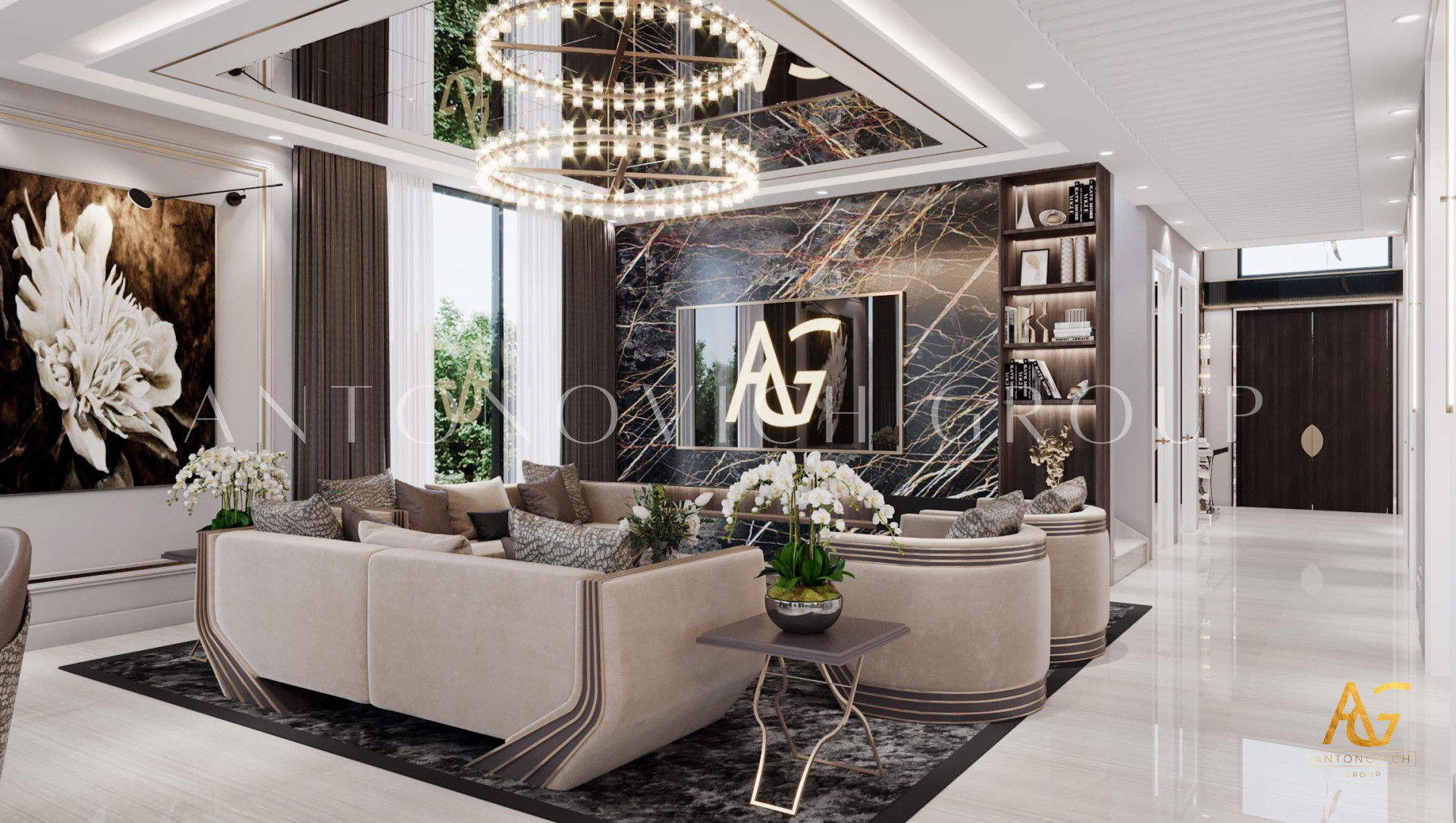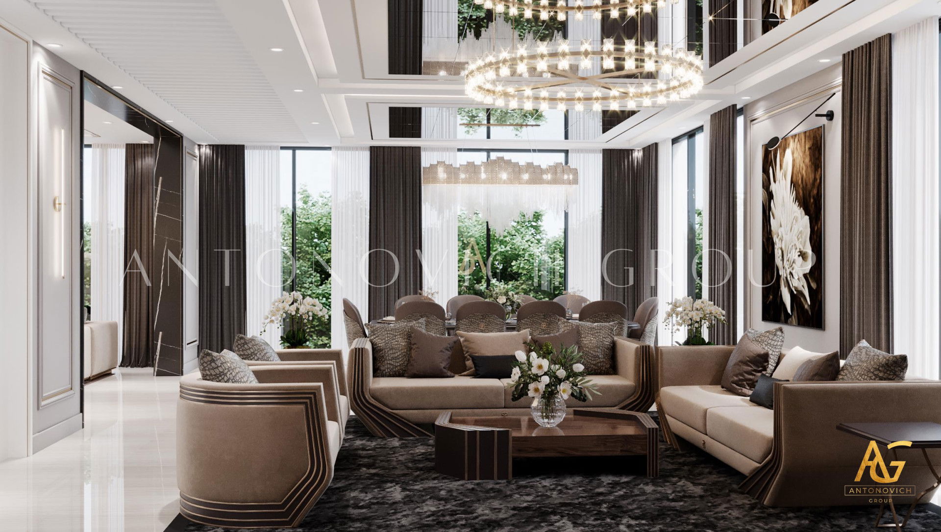 Eastern colors of the luxury villa interior in Abu Dhabi with a touch of classic style reflect the luxury of a modern palace. This is a true work of art that will delight more than one generation of the family. The living room design, which is combined with a large dining area, fully expresses the respectability of homeowners, their high status, cordiality, and hospitality. Living room interior, like a painting of a great artist, is composed of many strokes. Each fragment of this painting can be admired forever, and every corner will give a sense of aesthetic pleasure. Living room design expresses how luxurious and magnificent interiors are; where the spectacular original design solutions are combined with the possibilities of modern technologies. Thanks to the modern technologies of laser cutting stone, we can create beautifully carved floors of natural marble. Exquisite ornaments consist of curls of natural marble, onyx, jade and other precious stones, which are combined in perfect harmony with the lush decor of the walls and ceiling. The furniture plays the principal violin in the orchestra of the luxury living room design Dubai. Luxurious sofas, chairs, and armchairs are upholstered in noble silk with embroidery and printed ornaments. Each piece of furniture is inlaid with exquisite carved handmade lace patterns. This lace is covered with gold leaf and perfectly fits with the decor of the walls and ceiling. Magnificent stucco on the ceiling shines particularly significant, thanks to the elegant chandelier lighting and additional lines.