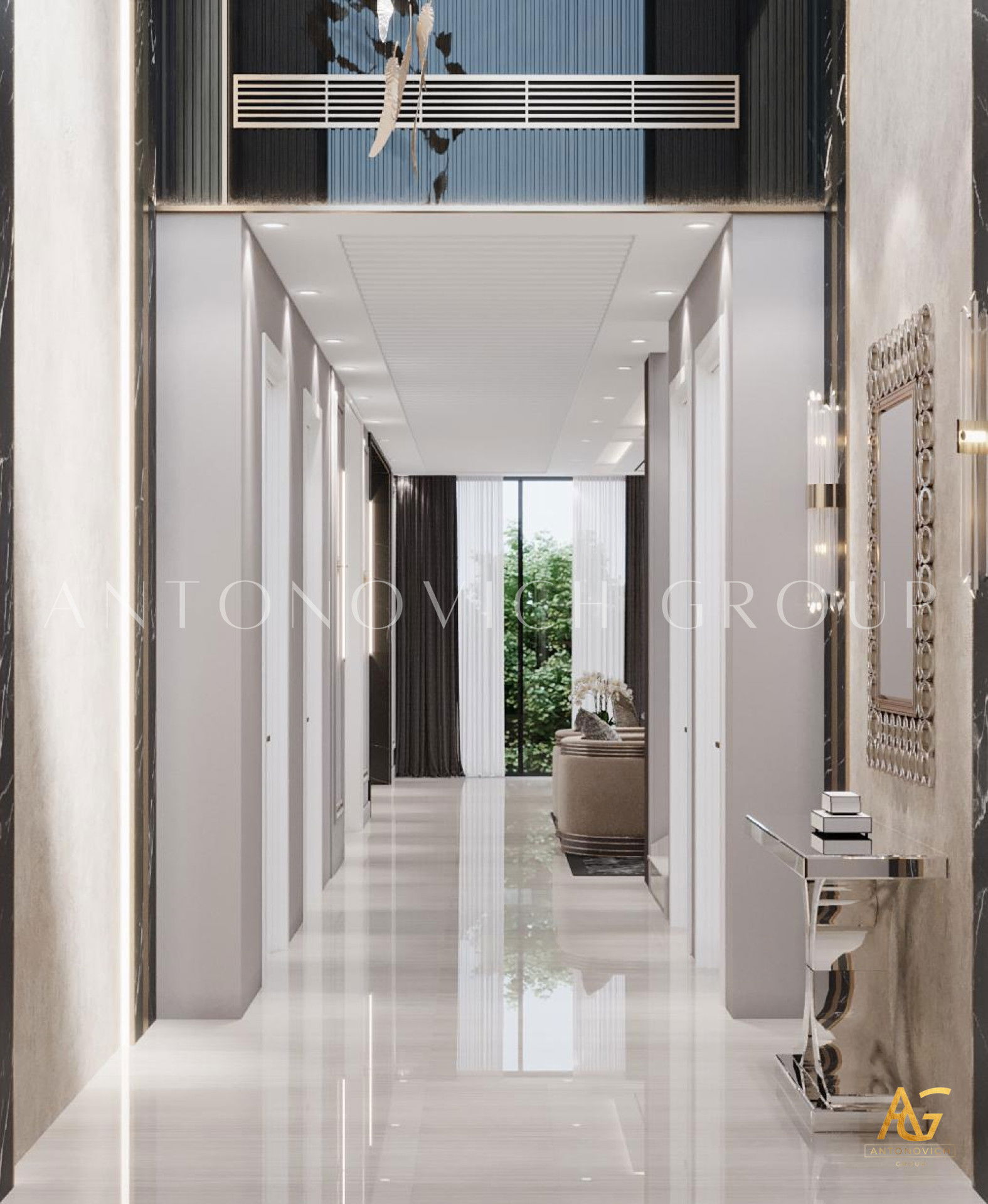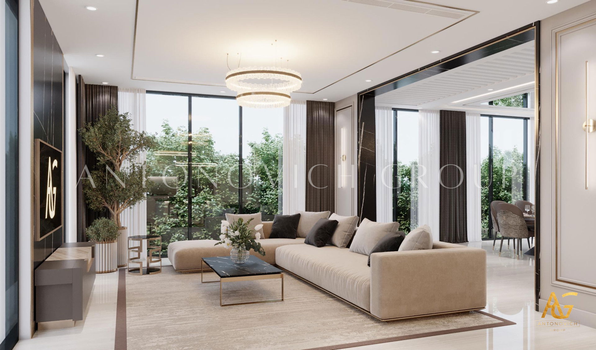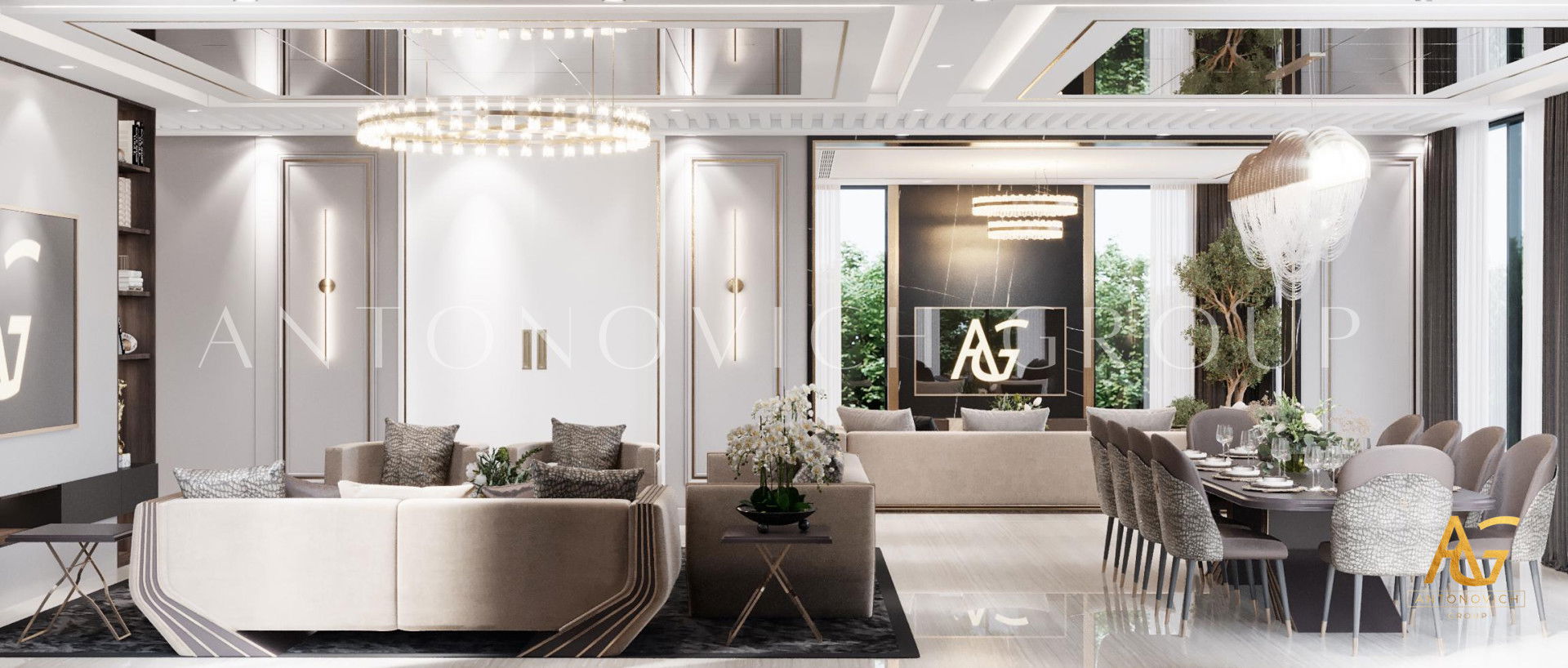 Eastern colors of the luxury villa interior in Abu Dhabi with a touch of classic style reflect the luxury of a modern palace. This is a true work of art that will delight more than one generation of the family. The living room design, which is combined with a large dining area, fully expresses the respectability of homeowners, their high status, cordiality, and hospitality. Living room interior, like a painting of a great artist, is composed of many strokes. Each fragment of this painting can be admired forever, and every corner will give a sense of aesthetic pleasure. Living room design expresses how luxurious and magnificent interiors are; where the spectacular original design solutions are combined with the possibilities of modern technologies. Thanks to the modern technologies of laser cutting stone, we can create beautifully carved floors of natural marble. Exquisite ornaments consist of curls of natural marble, onyx, jade and other precious stones, which are combined in perfect harmony with the lush decor of the walls and ceiling. The furniture plays the principal violin in the orchestra of the luxury living room design Dubai. Luxurious sofas, chairs, and armchairs are upholstered in noble silk with embroidery and printed ornaments. Each piece of furniture is inlaid with exquisite carved handmade lace patterns. This lace is covered with gold leaf and perfectly fits with the decor of the walls and ceiling. Magnificent stucco on the ceiling shines particularly significant, thanks to the elegant chandelier lighting and additional lines.
