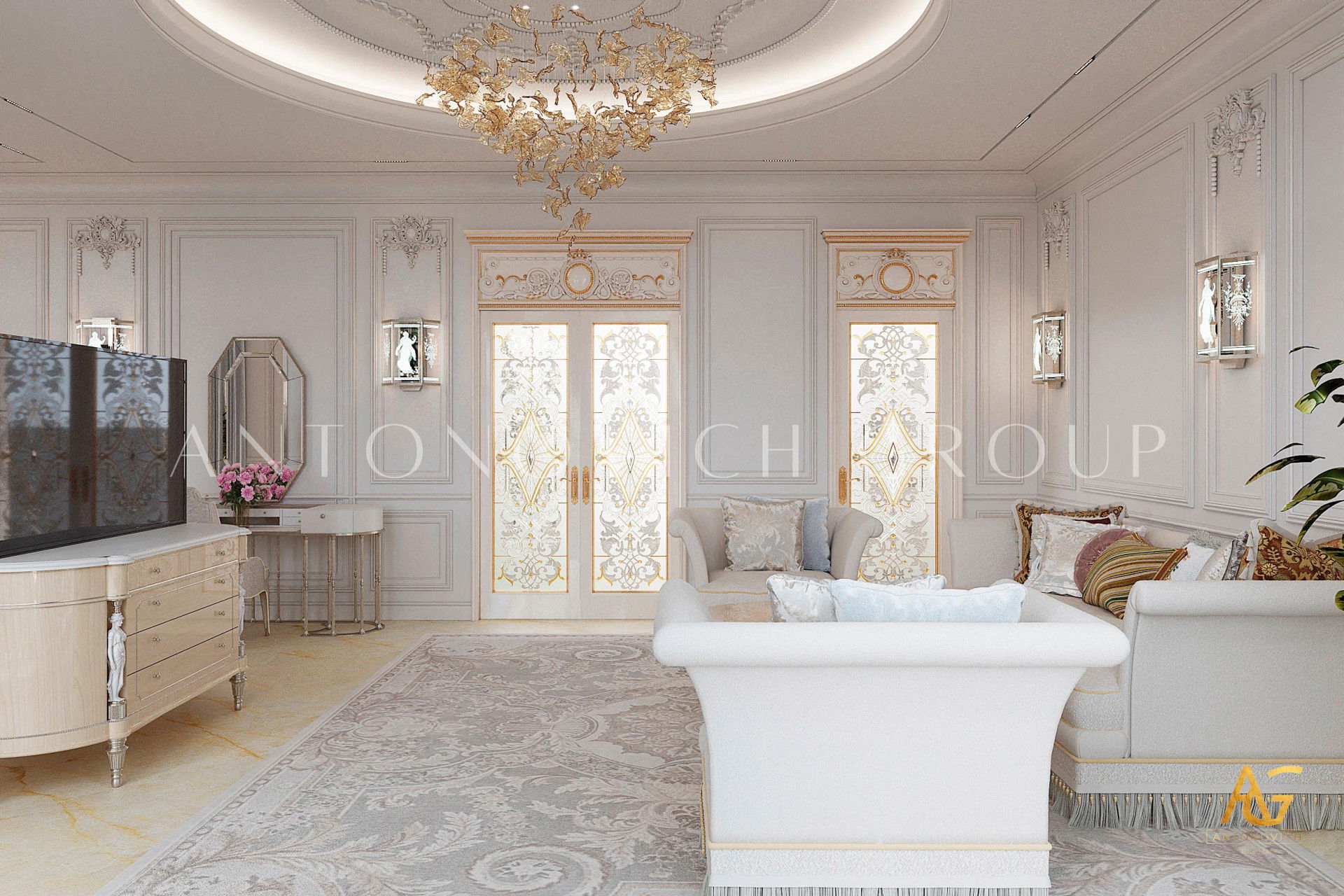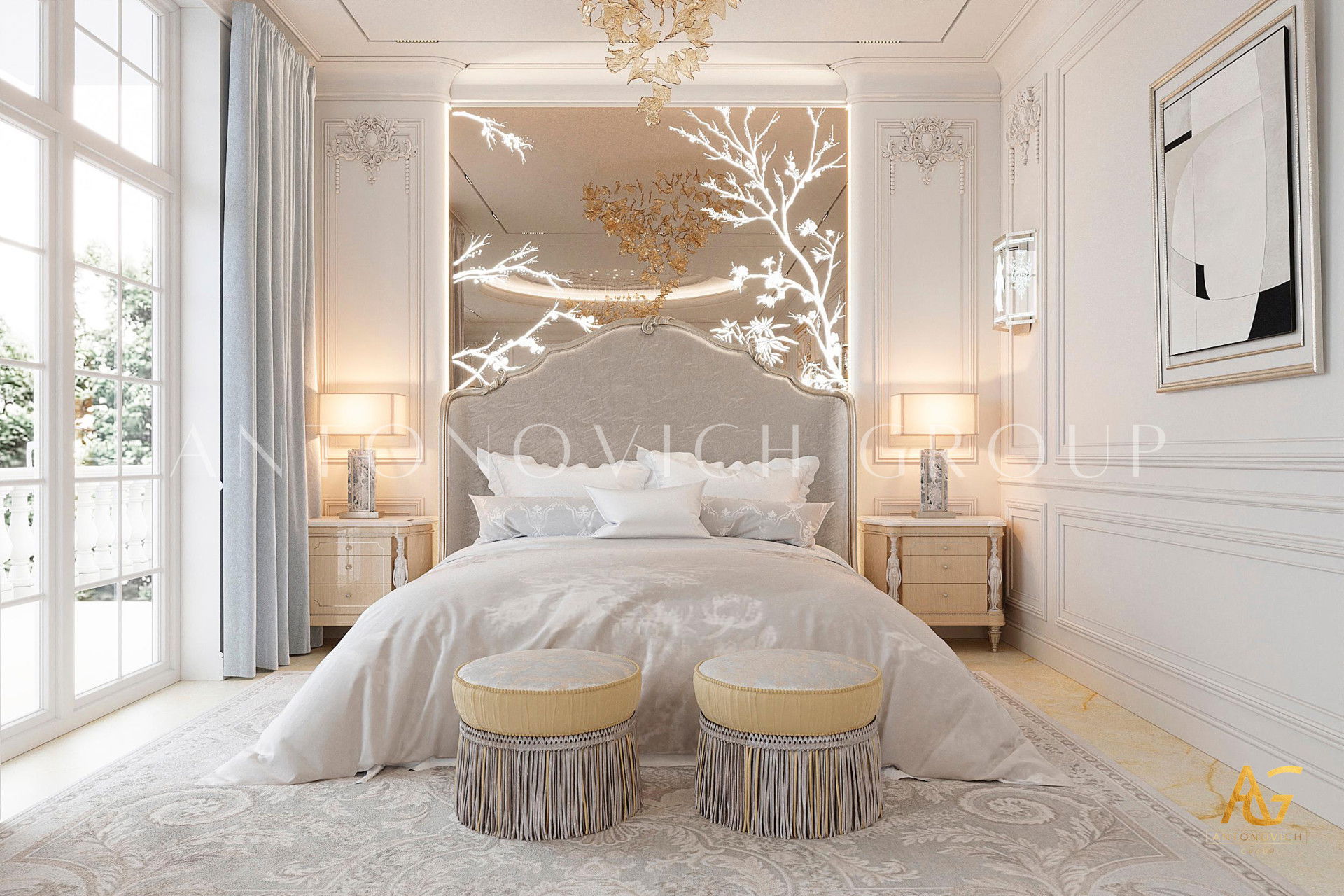 Excellent choice of bedroom interior in modern style was designed for one of the luxury hotels. The hotel interior design fully emphasizes its respectability and high status. The luxurious and lavish decoration of the hall of the hotel succinctly gets into comfortable rooms and stylish apartments. Bedroom interior design aims to give hotel guests the feeling of absolute comfort and complete feeling of warmth of home comfort. Interior designers Dubai skillfully arranged accommodation space and its architectural layout. The highlight of the interior became panoramic windows. This feature has become the basis of their design. Curtains design is in harmony with both the design concept of the interior, and the peculiarities of the windows configuration. For this interior Roman blinds of thick silk of milky color fringing ultramarine fit perfectly. In the wall decor stylish wallpaper of two contrasting shades of cream and brown look elegant. Bedroom interior design has a cozy mood, as well as ergonomics and functionality. For convenience of guests there is a working space with a desk and a comfortable chair. A large wardrobe with glossy facades perfectly fits into the interior. Natural wooden floor, and soft carpet look home-warm and cozy. Stylish interior in a modern style with touches of minimalism sets a pleasant and comfortable stay. Interior lighting at night is provided with several modern ceiling lights. And in the daytime, luxurious curtains can optionally be adjusted with the remote control.