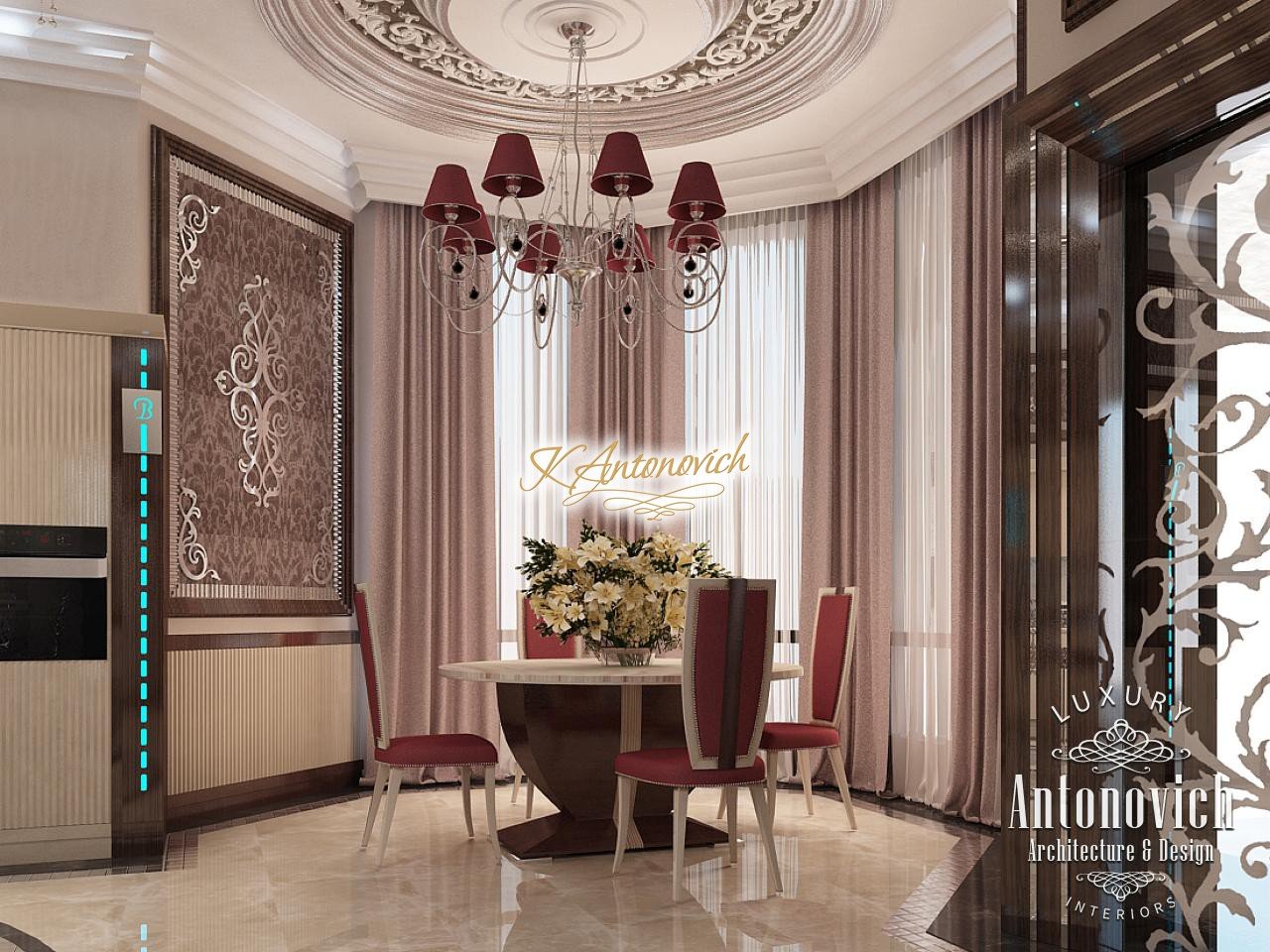 Once again, we invite you to look into the future of luxury and comfort. Modern style with its laconic features complemented by a few bright accents of art deco. Apartment design in Dubai reflects the modern character of its owners, their love for the new and ready for bold experiments. Quite spacious luxury apartment allowed to implement fully all design ideas. Kitchen interior design is closely connected with dining room design. The kitchen and living room divided by stylish glass sliding system with exquisite patterns. Smooth glossy facades of kitchen furniture in plain pastel colors elegantly conceal the latest storage systems and kitchen appliances. Interior Designers Dubai actively used LED lighting in the project to accent and make the kitchen interior more expressive. Elegant kitchen interior accent became bar surrounded by high metal chairs with carved backs. To enhance the image of a bright interior designers complement the kitchen interior with bright ceiling decor. Oval niche with exquisite decor and lighting in the center are decorated with ornate wrought-iron chandelier with curls and bright shades. Sophisticated, stylish and bright kitchen interior design expresses the integrity of the entire design concept of luxury apartment interior.