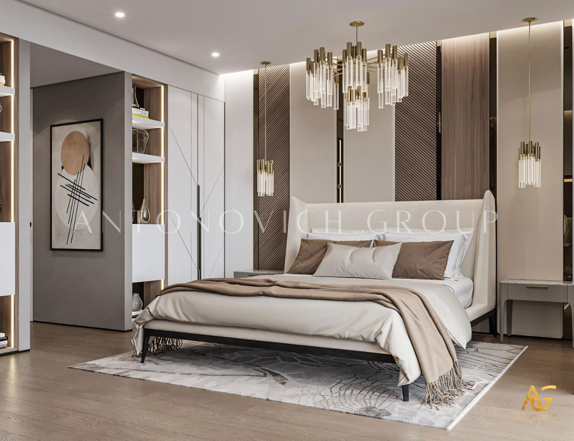 Wonderful moments when you fully immersed in moments of serene relaxation, sensual and aesthetic pleasure, often based on the beautiful environment that surrounds in the interior. The bedroom interior design with refined and exquisite accents became harmonious continuation of the design concept of apartment interior in Dubai. Interior designers have caught delicate motives of customers' dreams about perfect interior and bring them to a luxury apartment. Bright and passionate image of the interior is based on rich accents. One of such emphasis in the bedroom interior became curtains. A large window decorated with curtains of delicate velvet in ruby hue. They are trimmed with wide edging of cream shade and gathered in soft folds of drapery with the help of fine grabs. With such a bright and saturated image of windows decoration two armchairs, which are covered with light velvet, looks gorgeous. In the interior there is a beautiful improvisation and the game of contrasts. Chest of drawers of dark wood of valuable species is in sharp contrast with white walls. Also, the floor made of natural wood contrasts stylishly with a large carpet color. Dubai Interior designers have created a very expressive image of modern classics. Every detail is like a touch on a beautiful painting of the artist. Each element of the decor harmoniously fits into the overall picture of luxury and comfort. The warmth of home comfort is epitomized by luxury wallpaper, wall decor and luxurious decoration of the bed. Bedroom interior design is with a touch of elegance and gentility.