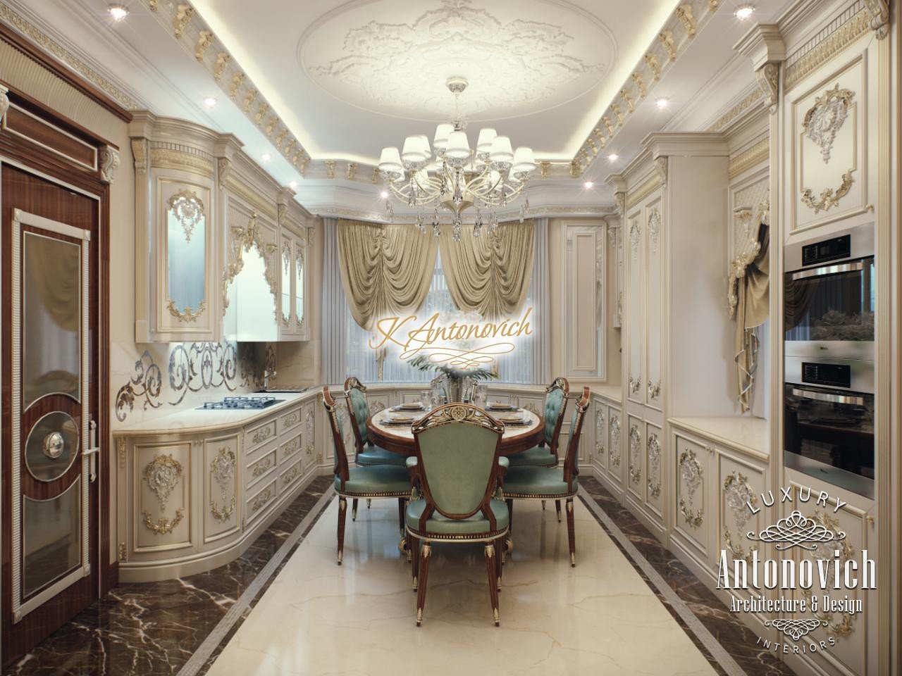 Kitchen interior design from studio Luxury Antonovich Design is a luxury image and perfectly organized space. Kitchen design always combines functionality, ergonomics and comfortable features. The interior design in classical style becomes an excellent way to reflect the respectability of homeowners and their impeccable taste. The kitchen design is full of exquisite details, which generally form solid and aesthetically perfect interior image. The interior gives a sense of aesthetic pleasure. Every detail captivates. Carved pattern on the kitchen splashback made of natural marble admirably reflects the curls of carved decoration on kitchen furniture. The ceiling design in the kitchen interior ideally suits to classical traditions. Fancy chandelier looks great surrounded by swirls of stucco decoration. The ceiling around the perimeter is outlined by exquisite moldings with gilded fragments. Ivory kitchen furniture inlaid with carved lace decoration, which is partially covered with gold leaf. On concise marble floor in the dining area furniture looks magnificently. High soft chairs with noble backs are decorated with carved decor. A large dining table is encrusted with different varieties of precious wood, carved and gilt ornaments. The window is decorated with a charming shade of precious silk.
