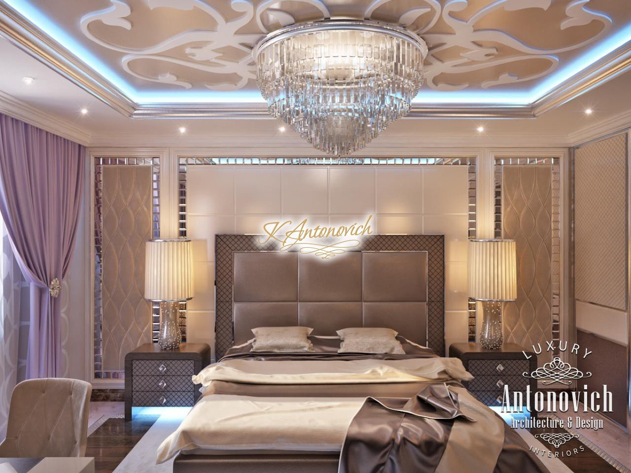 Incredibly comfortable and delicious bedroom interior in a modern style with touches of Art Deco was created by interior designers Dubai for luxury apartment. Bedroom design with a charming and seductive notes, as well as some intimate moments is intended to be as a place for the perfect rest of home owners. Apartment design in Dubai fully takes into account all the wishes of customers, largely surpassing their wildest hopes. The interior is completely dedicated to their comfort. Combinations of the usual canons and innovation are the basis of modern luxury. Absolute comfort and luxury are brought to works of the studio Luxury Antonovich Design, which give the joy of owning an ideal habitat. Bedroom interior design has a gentle accents. A small window is decorated with curtains of soft silk in purple hue, which is framed by delicate translucent tulle with a concise ornament. The highlight of the windows decoration has become stylish tough grabs as large flower buds. Luxury bed is upholstered in genuine leather of chocolate hue. Its high headboard looked harmoniously on pale beige wall. Glossy panel in wall decor filled the apartment with a little reserved and laconic mood. Furniture made of wood blends perfectly with the decor of the floor. Interior designers Dubai added traditional softness and warmth with a natural carpet in the middle of the room. To make bedroom interior more expressive and beautiful, the designers complement it with accents of lines of blue lights.
