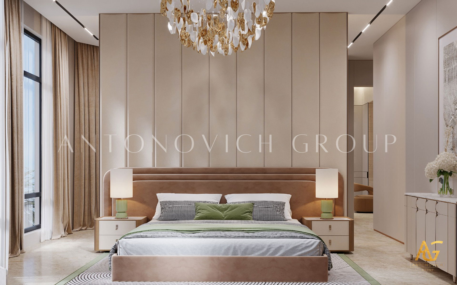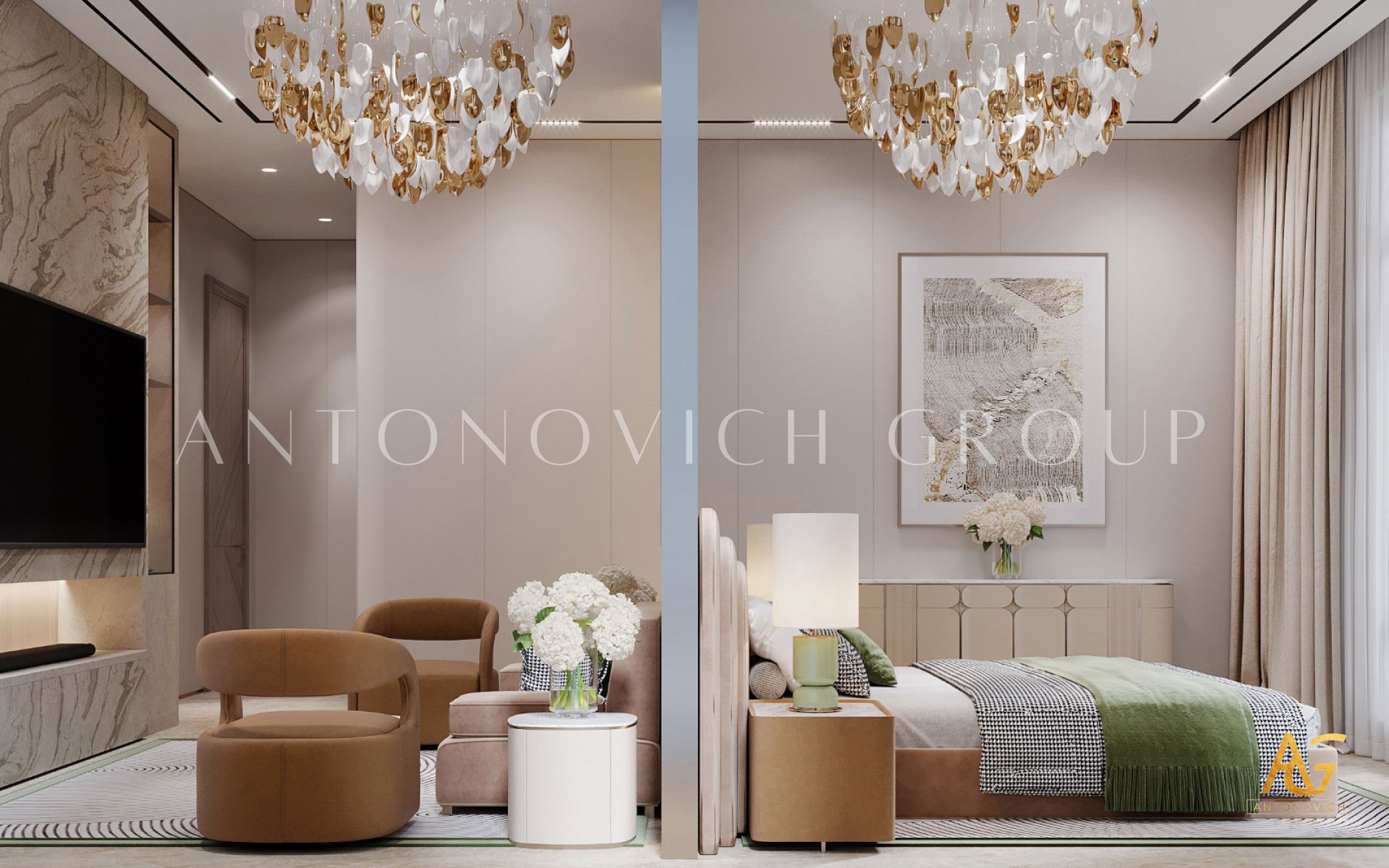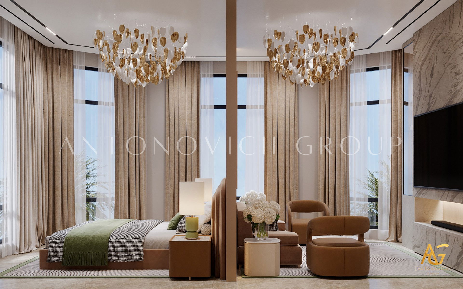 This luxurious and charming bedroom interior in the style of neoclassicism was developed for the eldest daughter of the owners of a villa in Dubai. The villa design reflects elegance and respectability in the best traditions of the classics. This author's project included architectural design, interior design and exterior design. In the work on the project sizes and configurations of all rooms in the villa have been thought out. Bedroom interior design emphasizes especially the architectural plan. Spacious apartment with a large window is full of warmth and tenderness. A nice range of pastel shades became the basis of this mood. For window decoration interior designers Dubai offered a nice silk soft beige color. Curtains fixtures elegantly hidden behind a wide white-molding, which outlines the ceiling around the perimeter. In the center of the ceiling the bedroom interior in a classical style is decorated with elegant chandelier with crystal pendants. Boiserie are filled with elite wallpaper in soft pastel colors with ornaments depicting birds and flowers. In the bedroom interior sitting area near the window with two soft comfortable chairs looks comfortably. The warmth of a home is represented by the modern fireplace. The furniture in the bedroom interior has got elegant and subtle forms. Headboard and footboard of the large comfortable bed are inlaid with exquisite carved decor, as charming bedside tables are. In the interior a natural carpet and a wooden floor of valuable species look cute and stylish.