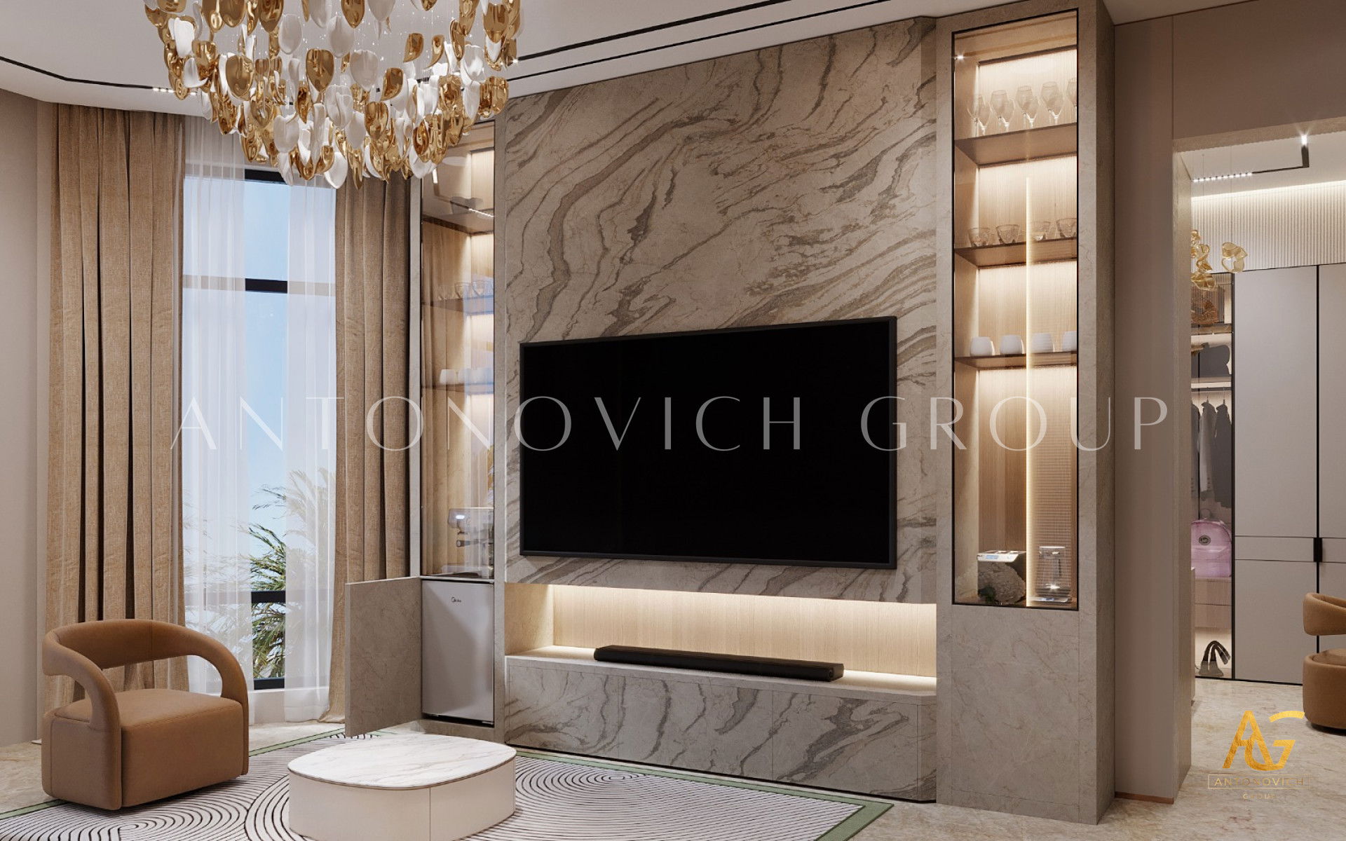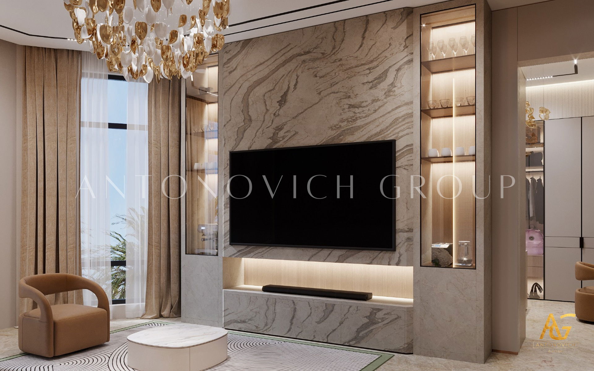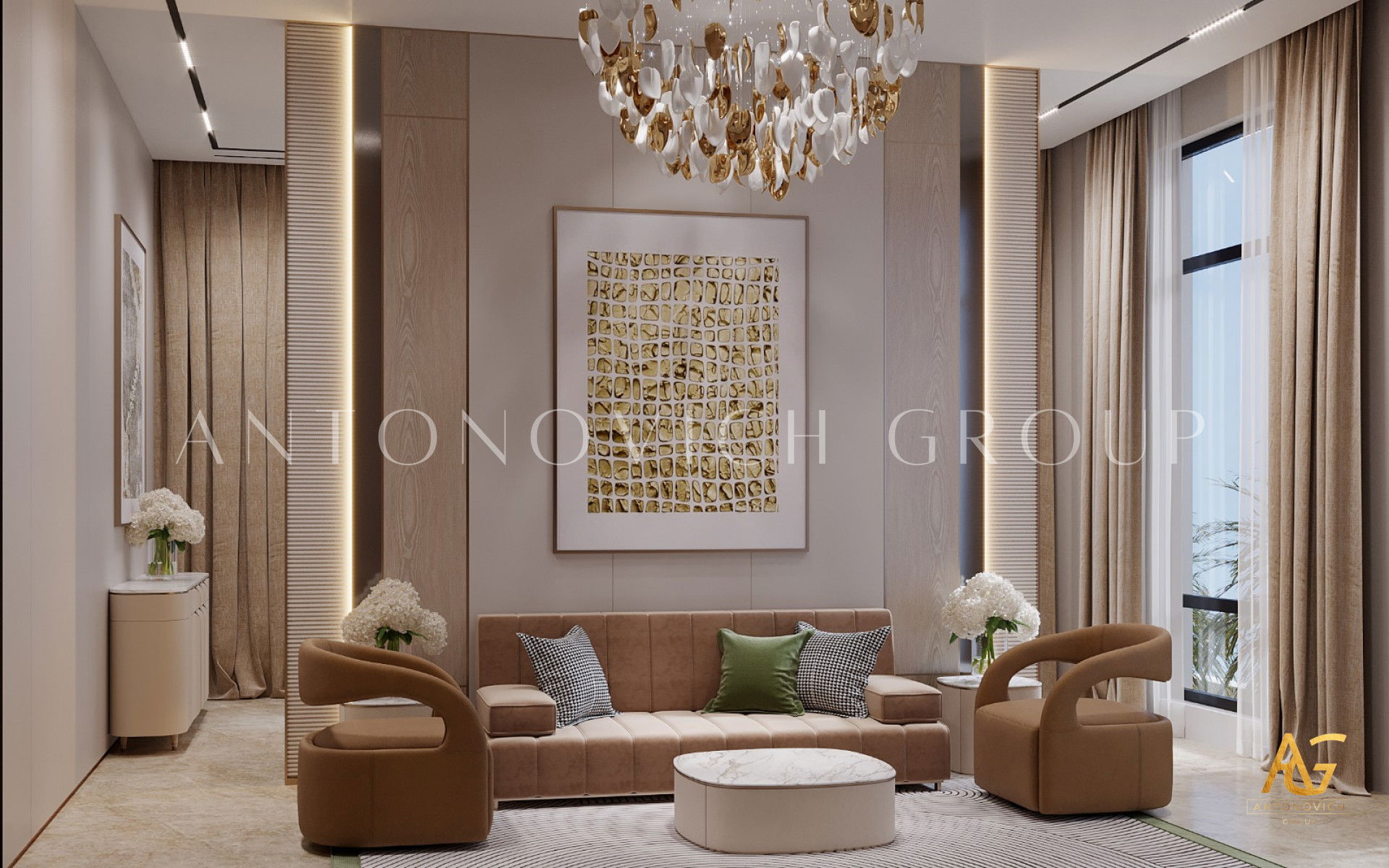 This luxurious and charming bedroom interior in the style of neoclassicism was developed for the eldest daughter of the owners of a villa in Dubai. The villa design reflects elegance and respectability in the best traditions of the classics. This author's project included architectural design, interior design and exterior design. In the work on the project sizes and configurations of all rooms in the villa have been thought out. Bedroom interior design emphasizes especially the architectural plan. Spacious apartment with a large window is full of warmth and tenderness. A nice range of pastel shades became the basis of this mood. For window decoration interior designers Dubai offered a nice silk soft beige color. Curtains fixtures elegantly hidden behind a wide white-molding, which outlines the ceiling around the perimeter. In the center of the ceiling the bedroom interior in a classical style is decorated with elegant chandelier with crystal pendants. Boiserie are filled with elite wallpaper in soft pastel colors with ornaments depicting birds and flowers. In the bedroom interior sitting area near the window with two soft comfortable chairs looks comfortably. The warmth of a home is represented by the modern fireplace. The furniture in the bedroom interior has got elegant and subtle forms. Headboard and footboard of the large comfortable bed are inlaid with exquisite carved decor, as charming bedside tables are. In the interior a natural carpet and a wooden floor of valuable species look cute and stylish.
