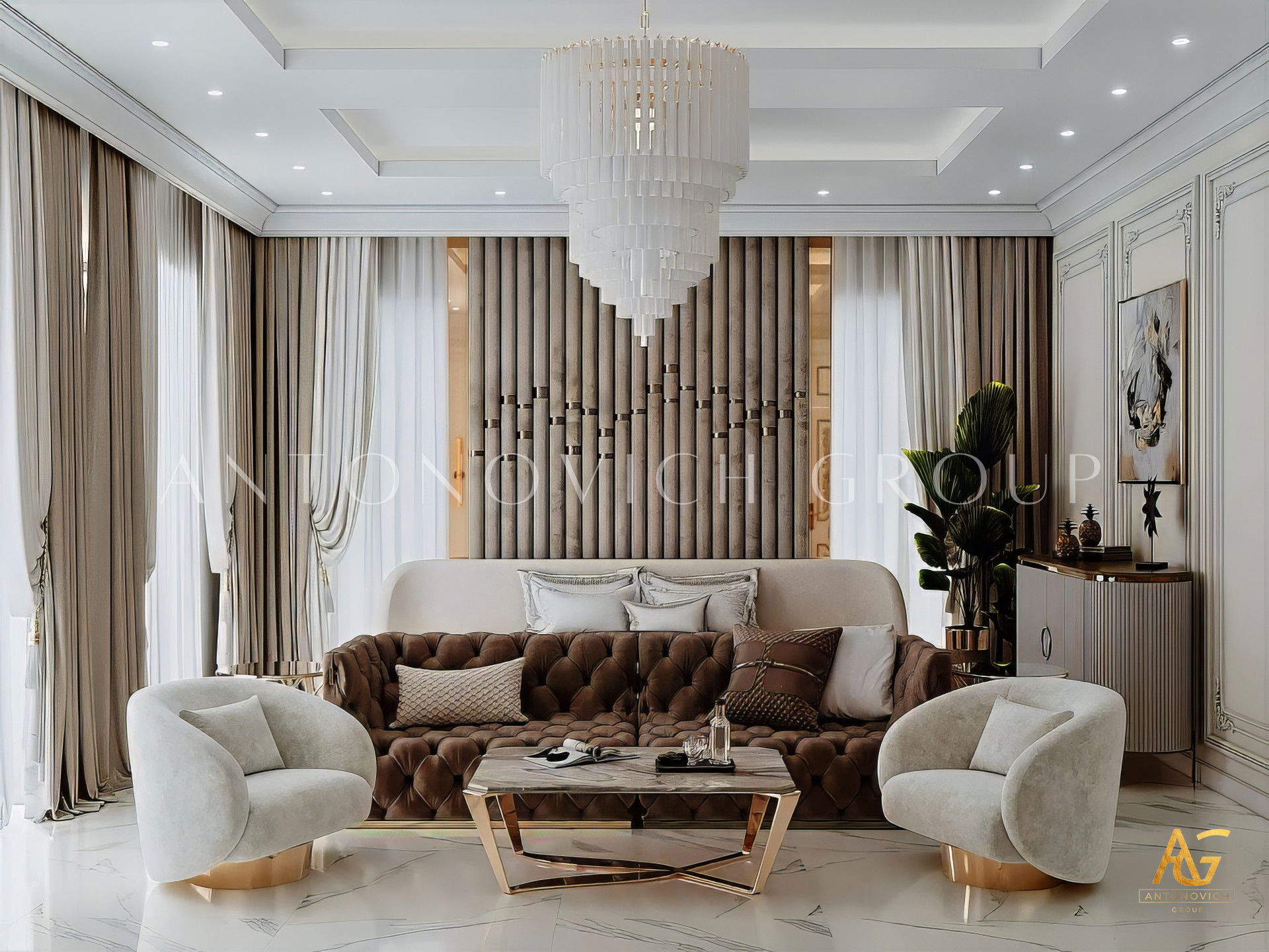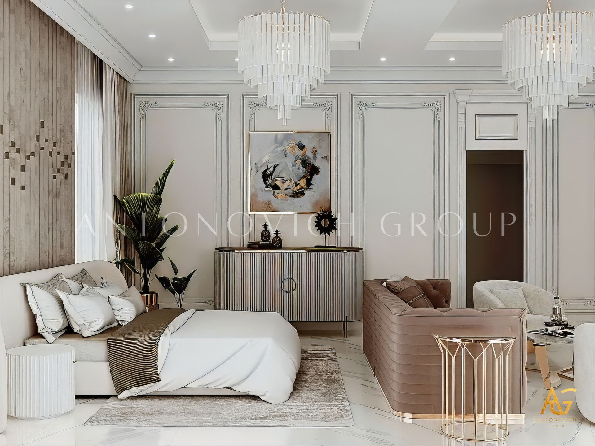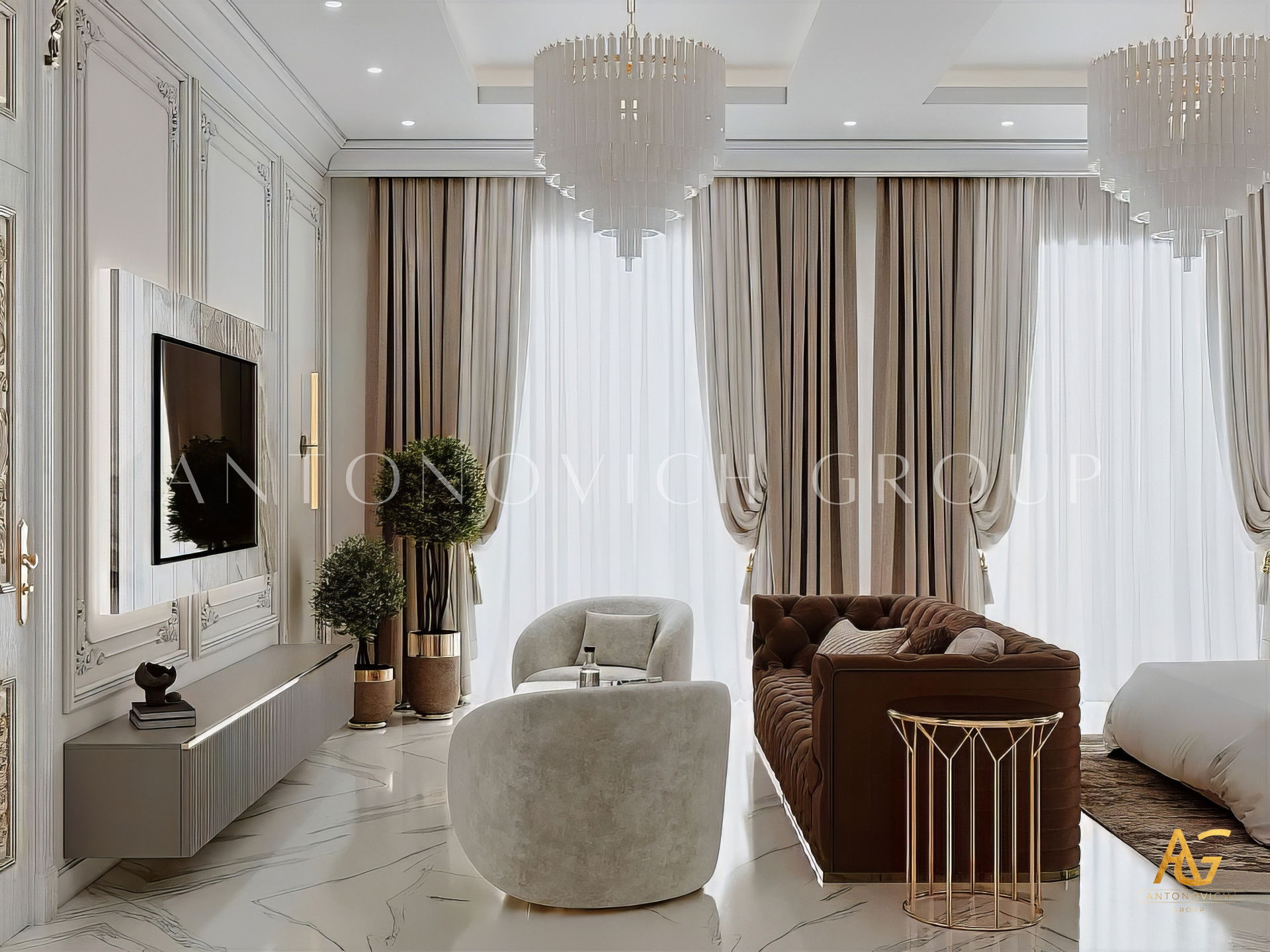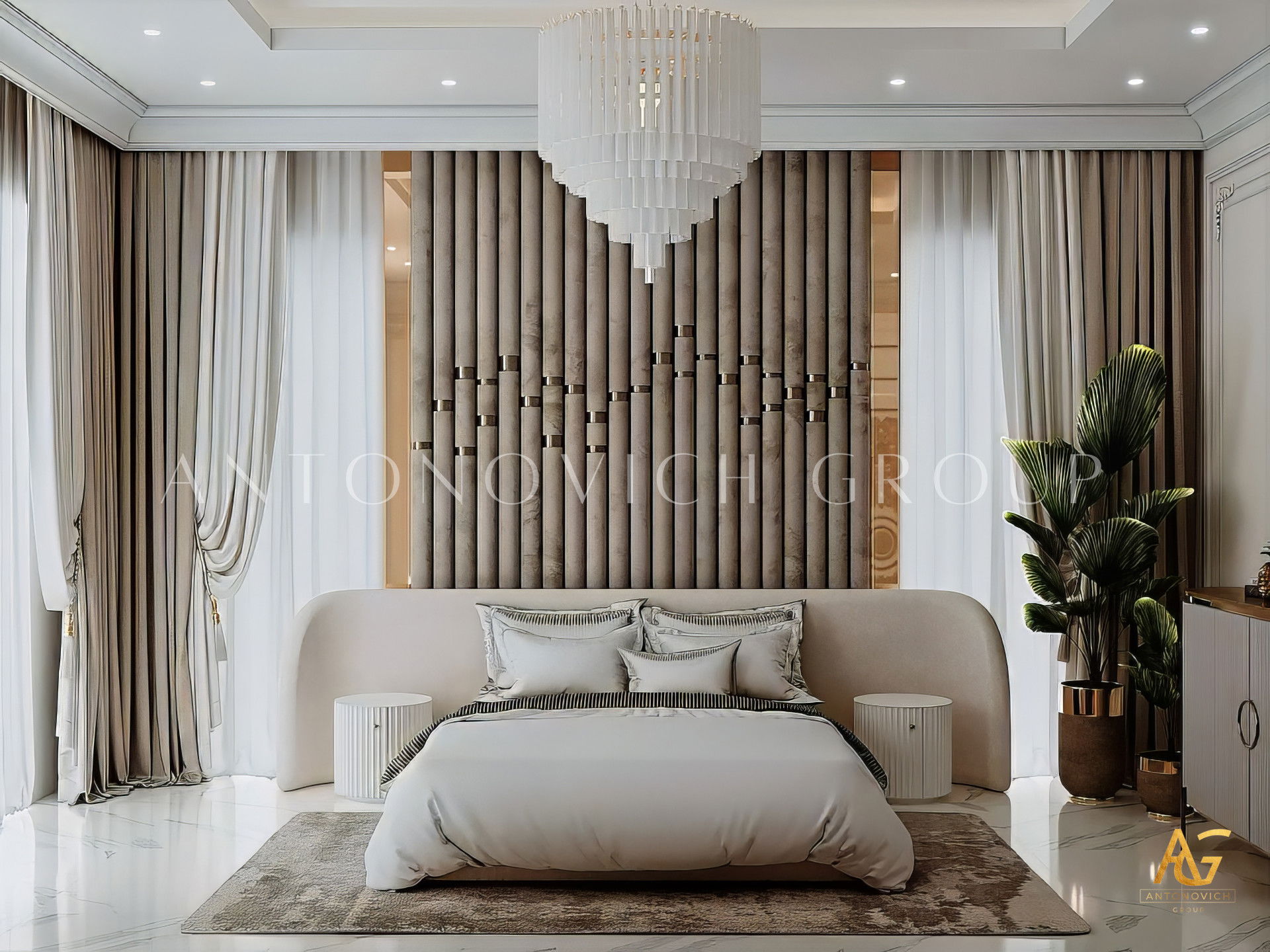 The lush grandeur of the interior in a classical style fully reflects the high status and respectability of homeowners. House design Abu Dhabi reflects the elegant blend of tradition, innovation and genius design ideas. The interior design reflects the charm of the luxury palace. Gorgeous bedroom with exquisite motifs, unique solutions in the decor captivates by its magnificent decoration. Interior designers have created a project that gives aesthetic pleasure. Artistic expression of the bedroom interior is based on elegant combination of colors, textures and materials. The main decoration of the interior, as befits the bedroom is a large comfortable bed. Its image is closely linked with wall and window decoration. The headboard is decorated with carved lace decoration and upholstery made of soft natural leather of cream color. The headboard is framed by a shallow arched niche made of wood, painted in milky-white color, completed with carved decoration and exquisite pilasters. Inside the niche is filled with luxurious silk wallpaper with classical ornaments. And on the sides this elegant composition is framed by two stripes of mirror panels, which reflected and multiplied luster of the luxury interior. Wallpaper with a touch of pale emerald green is perfectly in tune with a window decor. The large windows draped with luxurious noble silk curtains with printed patterns. The interior design is intended to give pleasure from pleasant and relaxing stay in an environment of royal luxury. House Design Abu Dhabi in every square meter reflects the high degree of luxury and comfort.