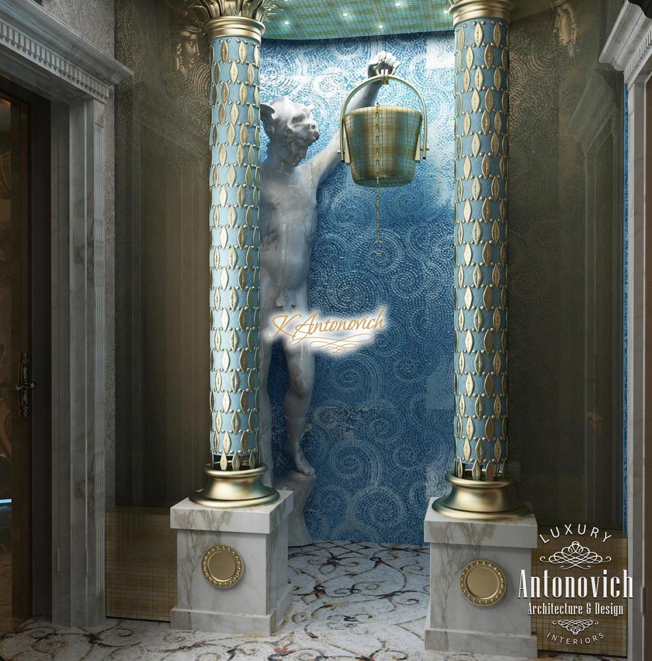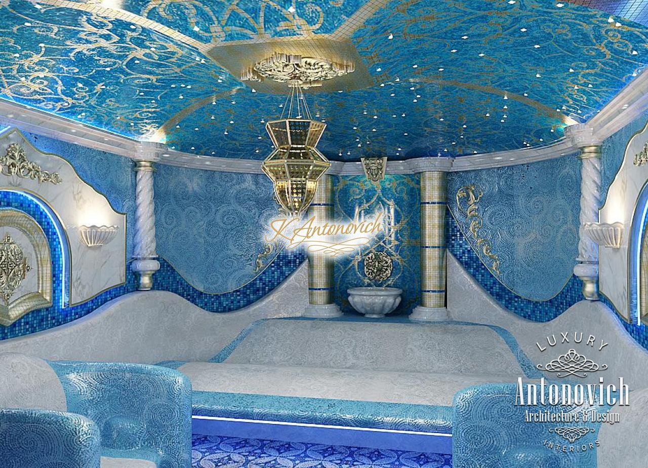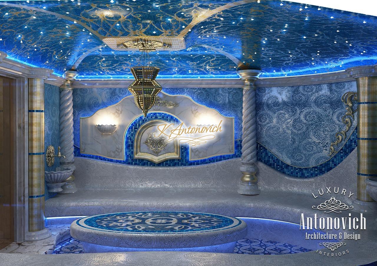 Villa Design in Dubai by elite interior studio Luxury Antonovich Design reflects the harmonious union of old traditions and modern technology. Luxury villa on the beach has become an ideal habitat for a large and happy family. Hamam design became one of the bright accents in the author's project. The spacious room that have been allocated for home spa area, have opened the designers a real scope for creativity. The hamam interior is divided into several zones. The pool area is decorated with amazing art paintings, sculptures and mosaics. In the recreation area interior designers Dubai offered an exquisite combination of floor and ceiling decor. Stylized of large flowers ornaments on the ceiling and the floor make the interior very expressive and festive.