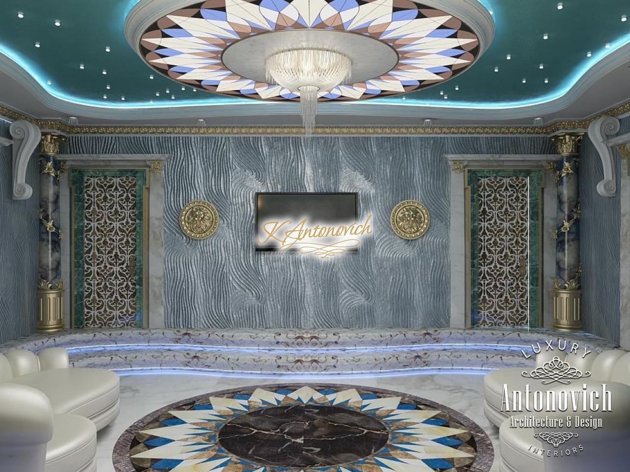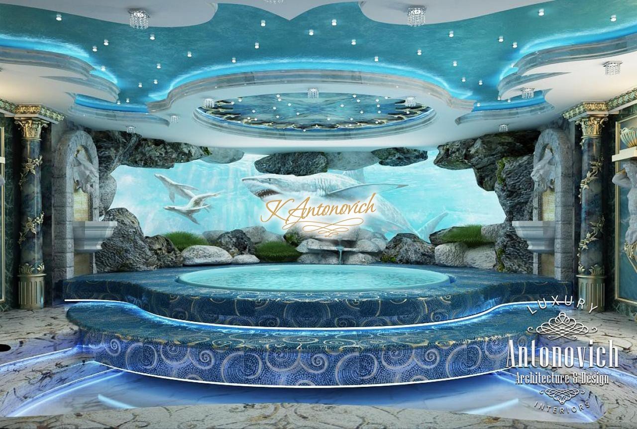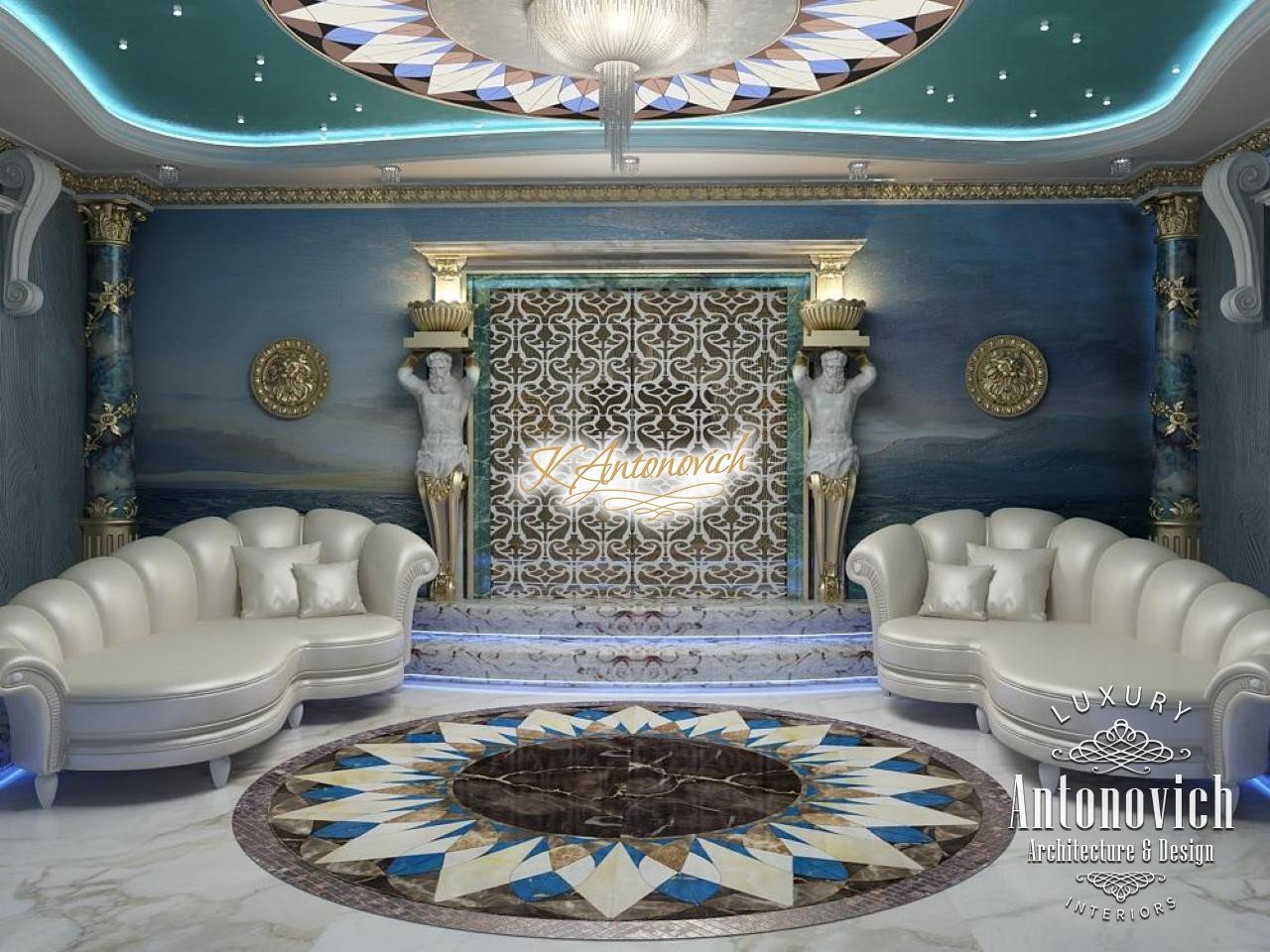Villa Design in Dubai by elite interior studio Luxury Antonovich Design reflects the harmonious union of old traditions and modern technology. Luxury villa on the beach has become an ideal habitat for a large and happy family. Hamam design became one of the bright accents in the author's project. The spacious room that have been allocated for home spa area, have opened the designers a real scope for creativity. The hamam interior is divided into several zones. The pool area is decorated with amazing art paintings, sculptures and mosaics. In the recreation area interior designers Dubai offered an exquisite combination of floor and ceiling decor. Stylized of large flowers ornaments on the ceiling and the floor make the interior very expressive and festive.