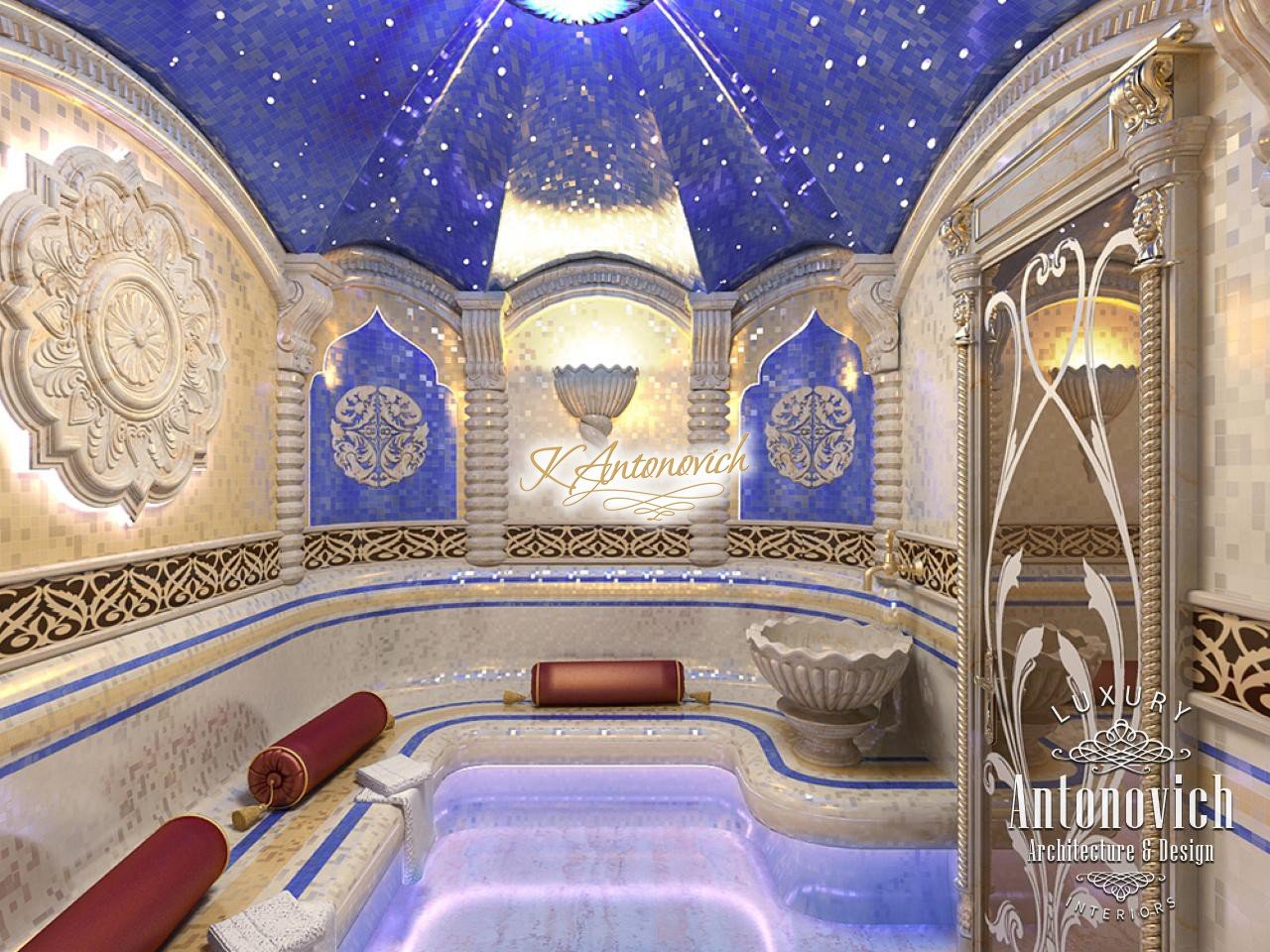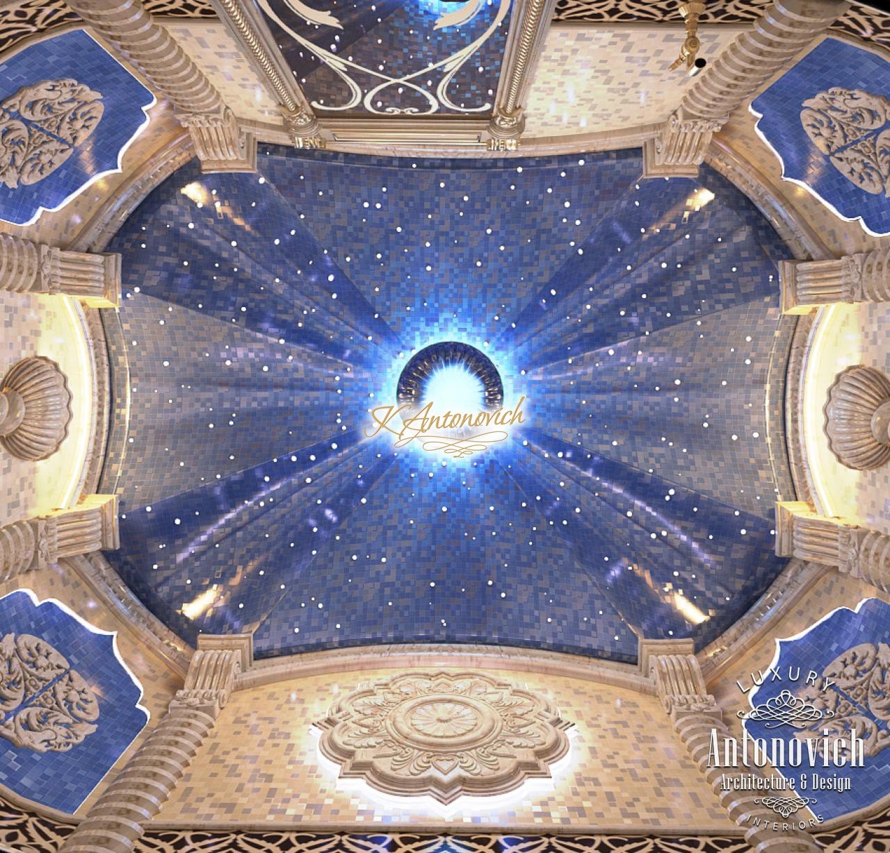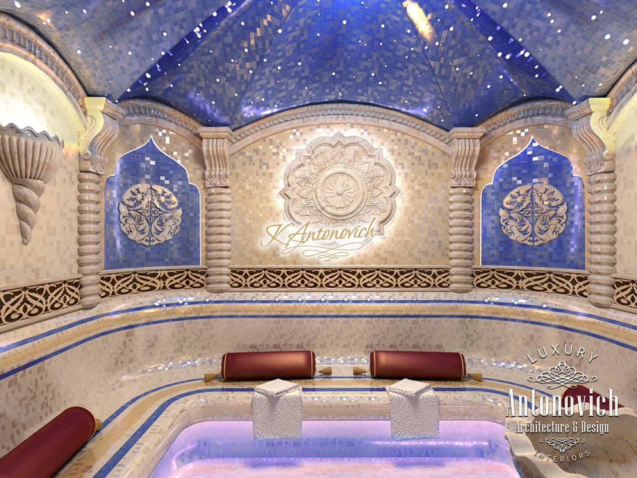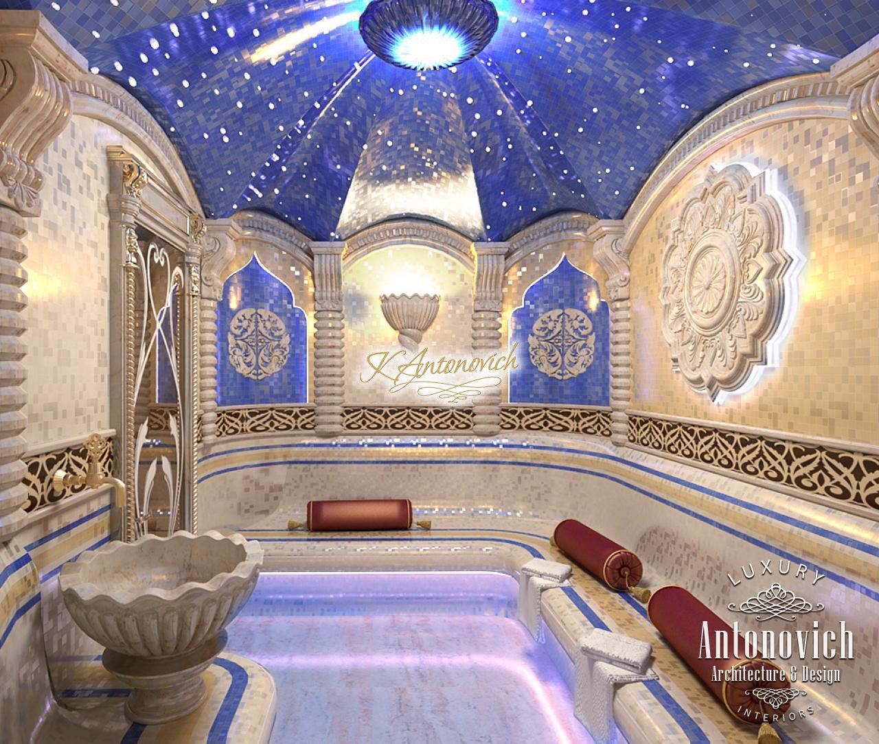 Home spa area interior begins with a sumptuous small hall. Villa design in Abu Dhabi is in the style of modern classics. And this part of the interior design concept continues harmoniously. Soft wall panel and charming pouf, upholstered in natural leather of blue shade, are reflected in a large mirror framed by a massive carved frame. This splendor is continued with cozy sauna interior and a luxurious hammam. Hammam design is completely different from the rest of the laconic classical rooms in the building. Here the luxury with oriental influences reigns. The ceiling arch of blue colour is spangled with stars of spotlights. The walls are decorated with oriental ornaments of carved marble of light cream shade. In such an interior you completely abstract from the bustle and enjoy a wonderful holiday.