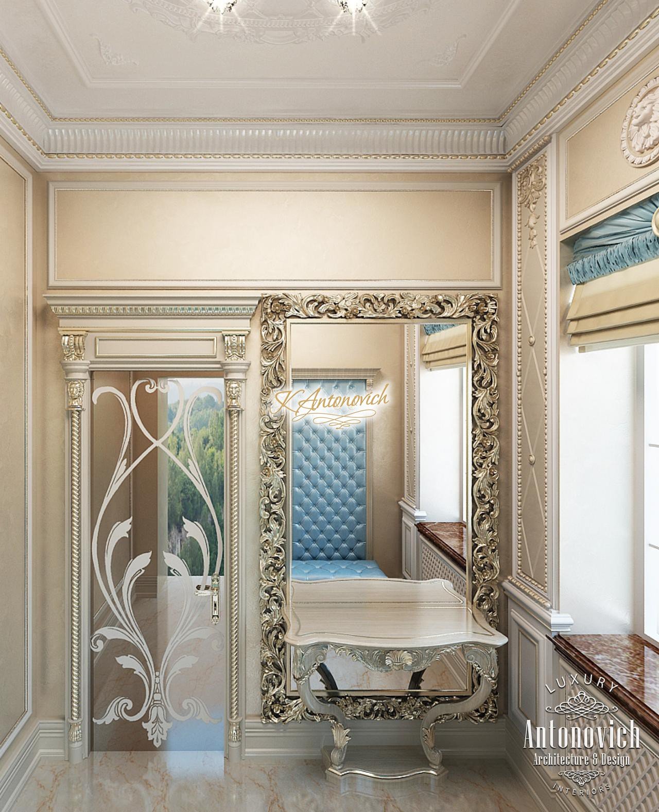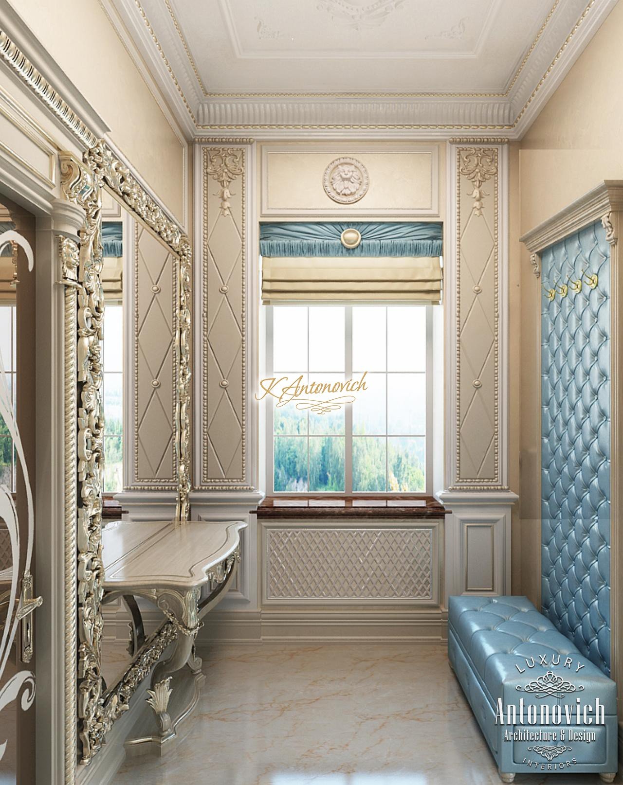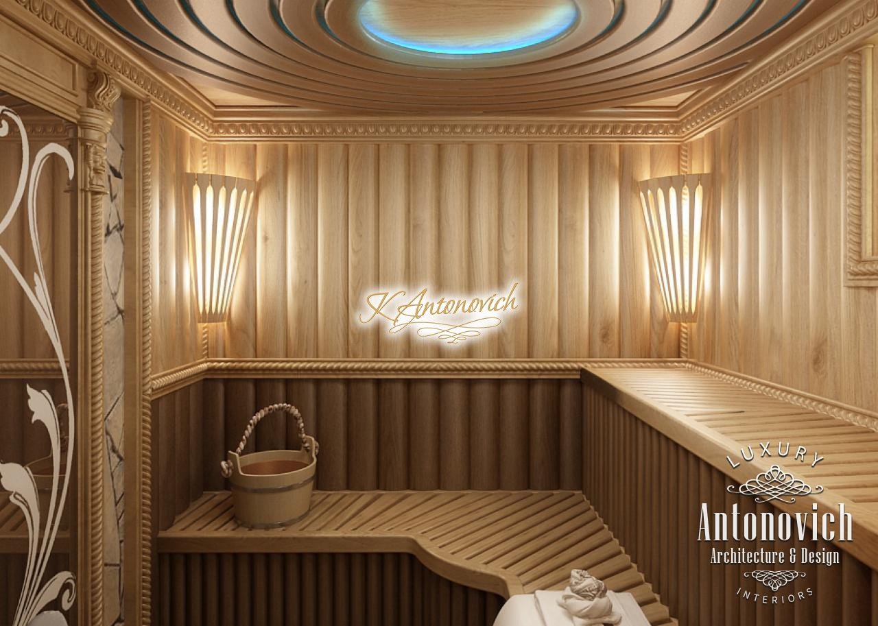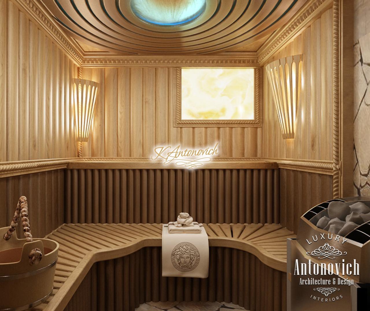 Home spa area interior begins with a sumptuous small hall. Villa design in Abu Dhabi is in the style of modern classics. And this part of the interior design concept continues harmoniously. Soft wall panel and charming pouf, upholstered in natural leather of blue shade, are reflected in a large mirror framed by a massive carved frame. This splendor is continued with cozy sauna interior and a luxurious hammam. Hammam design is completely different from the rest of the laconic classical rooms in the building. Here the luxury with oriental influences reigns. The ceiling arch of blue colour is spangled with stars of spotlights. The walls are decorated with oriental ornaments of carved marble of light cream shade. In such an interior you completely abstract from the bustle and enjoy a wonderful holiday.