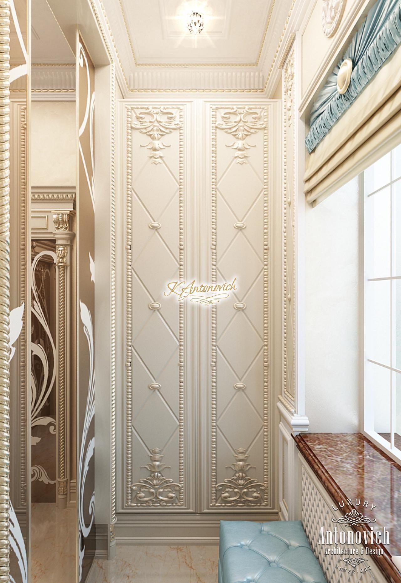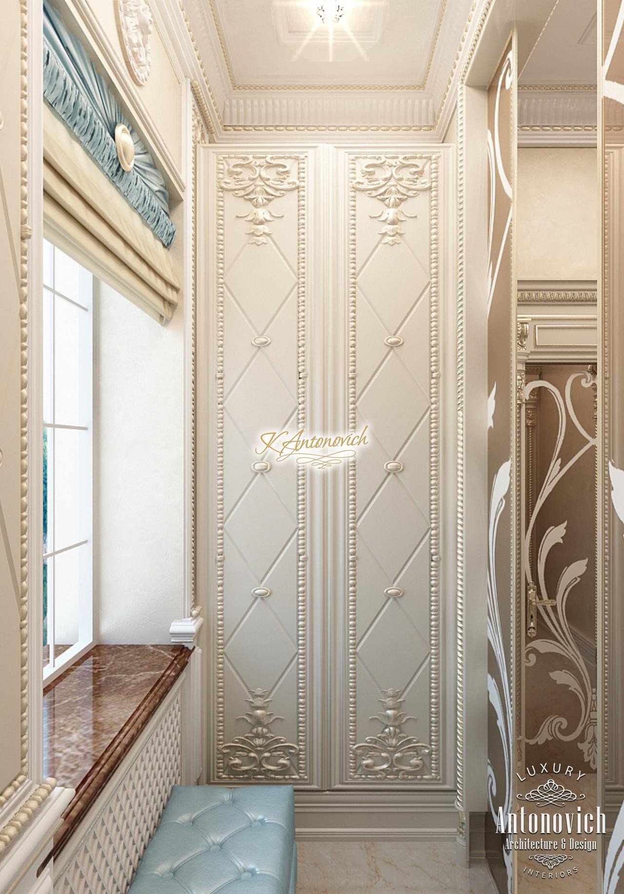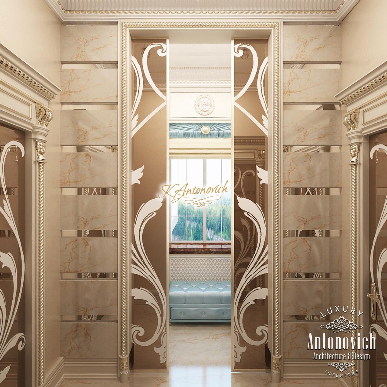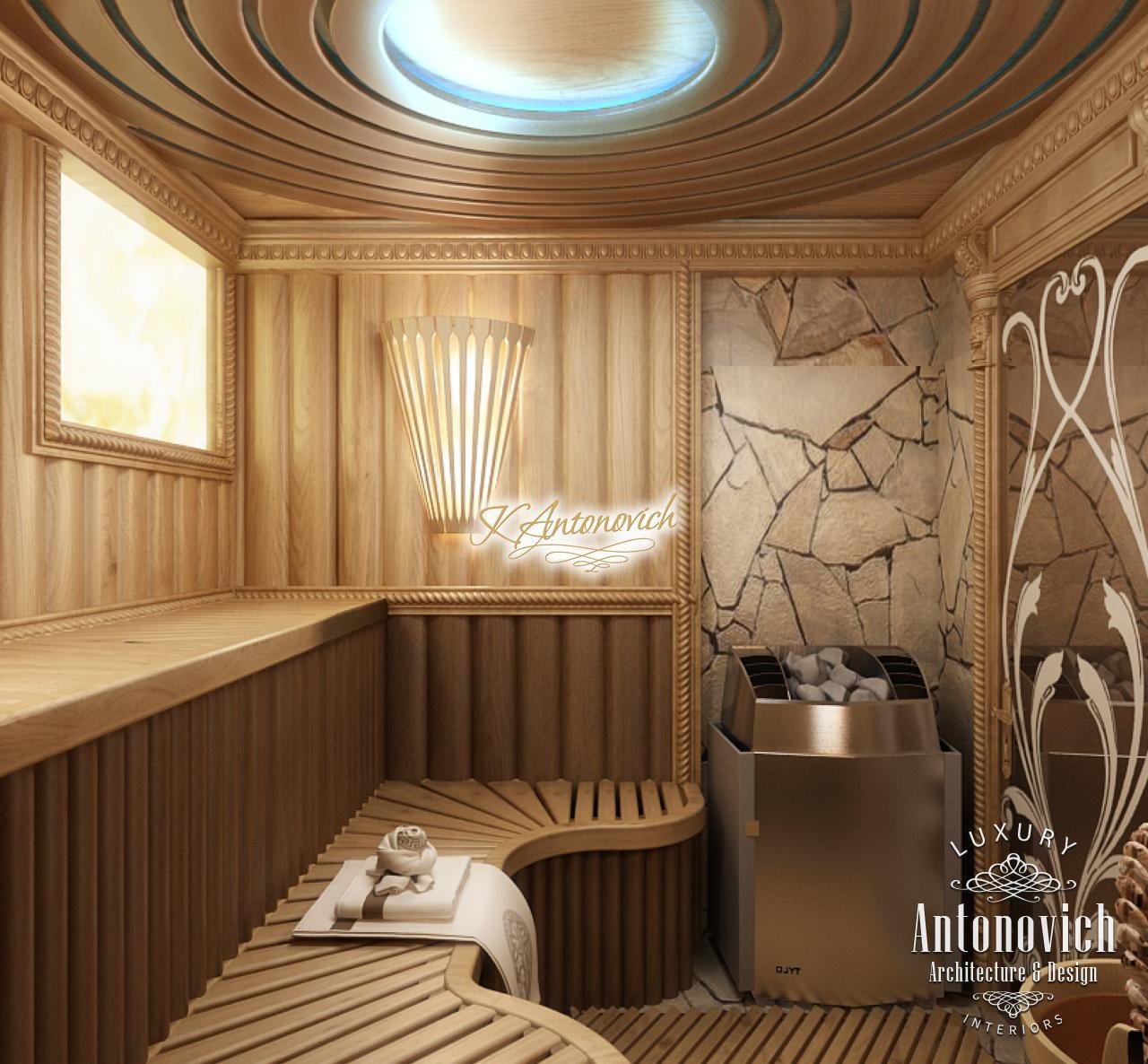 Home spa area interior begins with a sumptuous small hall. Villa design in Abu Dhabi is in the style of modern classics. And this part of the interior design concept continues harmoniously. Soft wall panel and charming pouf, upholstered in natural leather of blue shade, are reflected in a large mirror framed by a massive carved frame. This splendor is continued with cozy sauna interior and a luxurious hammam. Hammam design is completely different from the rest of the laconic classical rooms in the building. Here the luxury with oriental influences reigns. The ceiling arch of blue colour is spangled with stars of spotlights. The walls are decorated with oriental ornaments of carved marble of light cream shade. In such an interior you completely abstract from the bustle and enjoy a wonderful holiday.