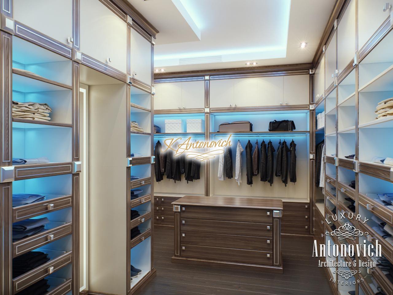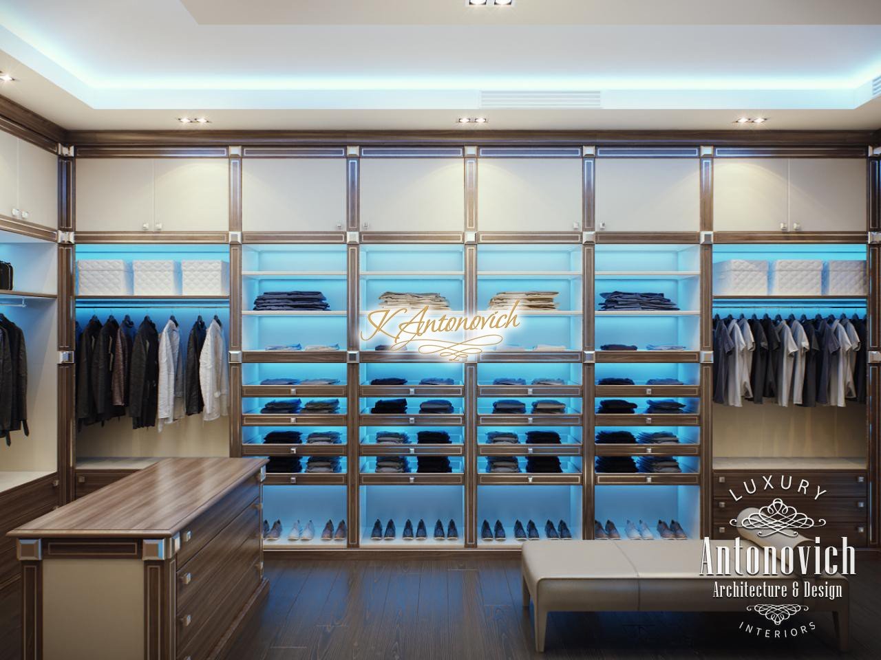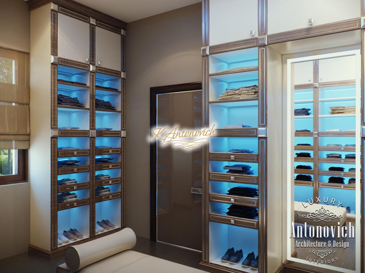 Spacious dressing room has an exceptional functionality. Villa Design in Dubai is in a contemporary style. Laconic and comfortable interior with a touch of respectability perfectly reflects the wishes of the owner of the house. One of the main requests was that the house should give a feeling of absolute comfort. Dressing room design perfectly embodies this wish. Interior Designers Dubai competently organize the space so that every thing is in place and the choice of clothes in these apartment is a joy and a pleasure. The dressing room interior design underlines respectability. Precious wood is combined with wonderful accents in the form of LED backlighting. A set of open shelves, which are illuminated from the inside, creates a wonderful feeling of space and ease.
