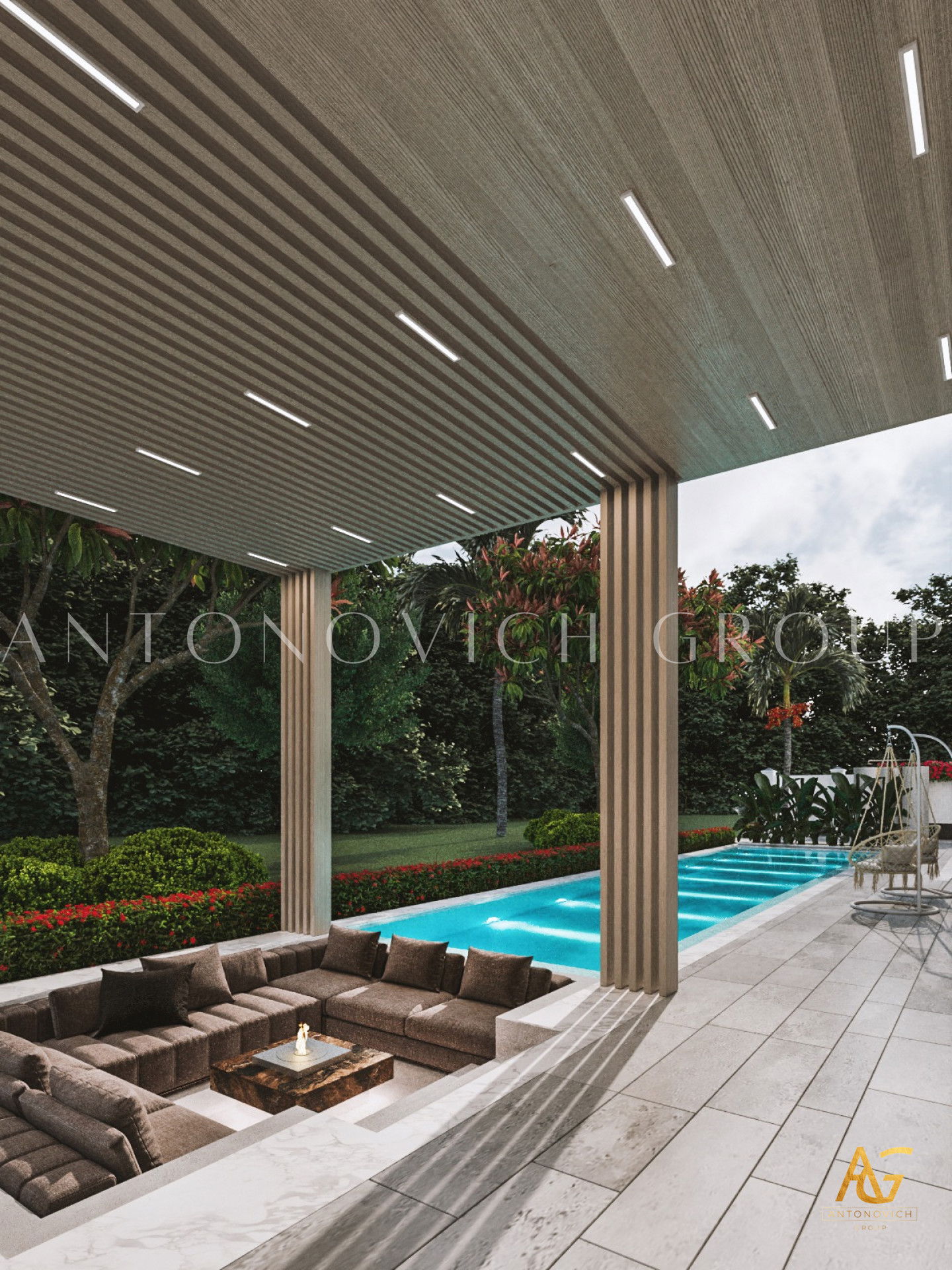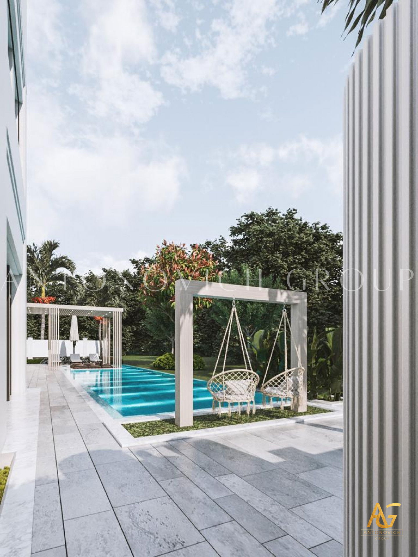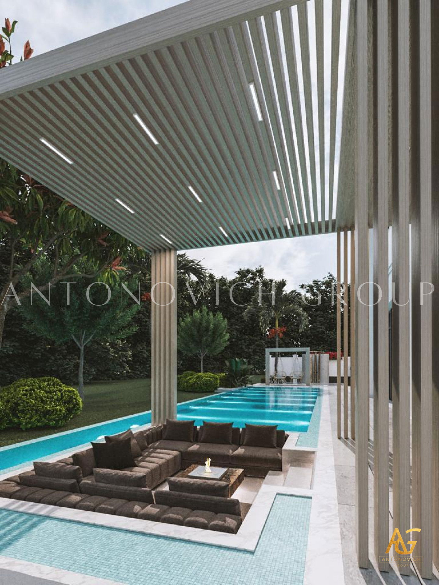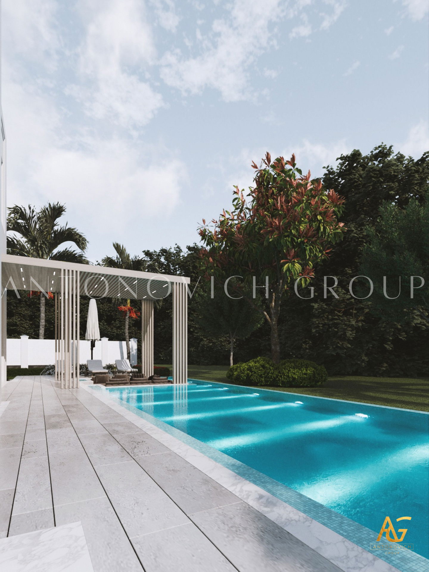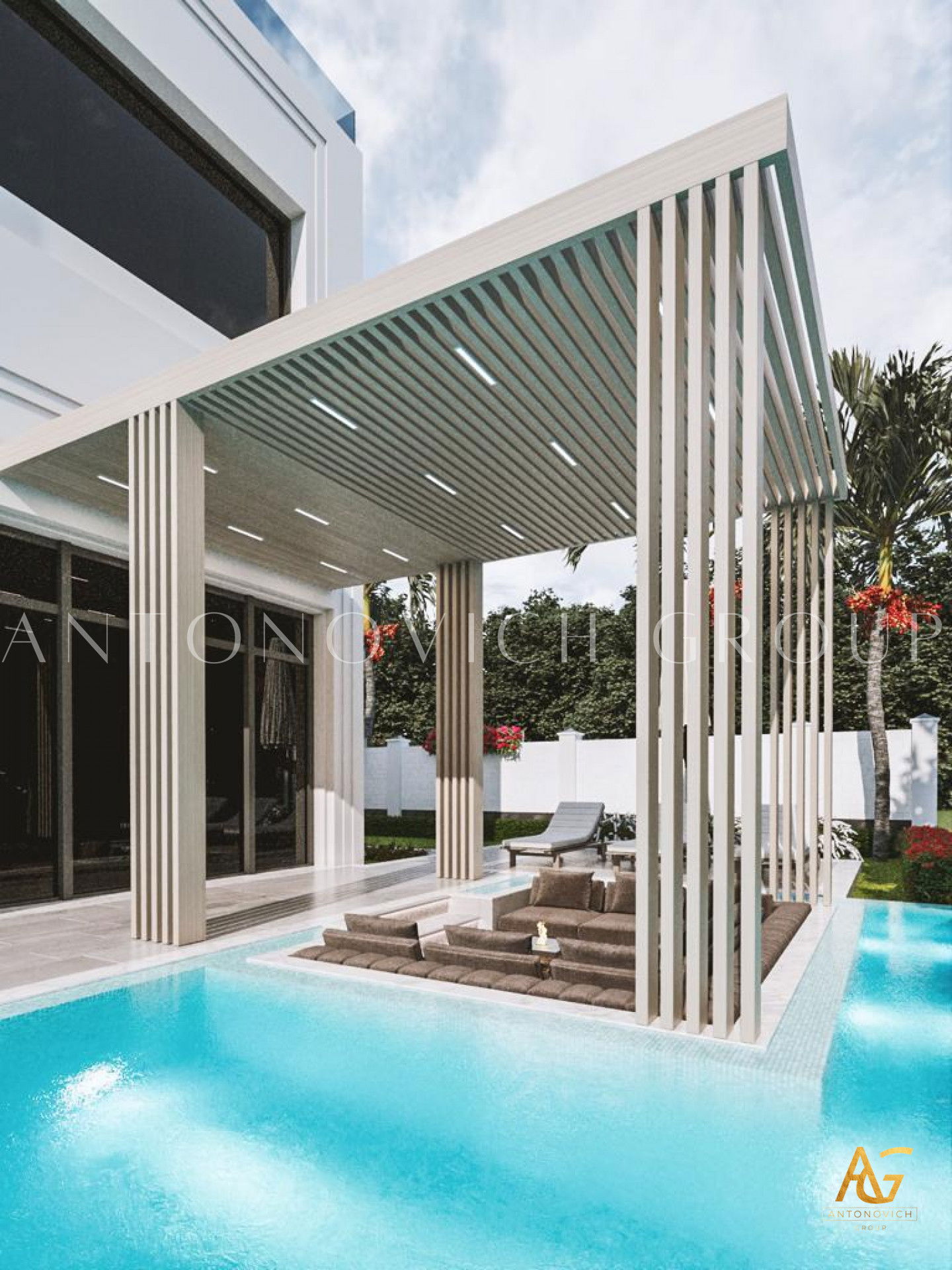 Помимо ландшафтных работ Антонович Групп провела масштабную реконструкцию внешних отделок: устаревшие материалы заменили современными и качественными решениями, что привело к обновление фасада роскошной виллы и повышению визуальной ценности объекта. Были внесены конструктивные изменения в облицовку и произведена замена окон и дверей фасада виллы для более современного облика и лучшего естественного освещения.