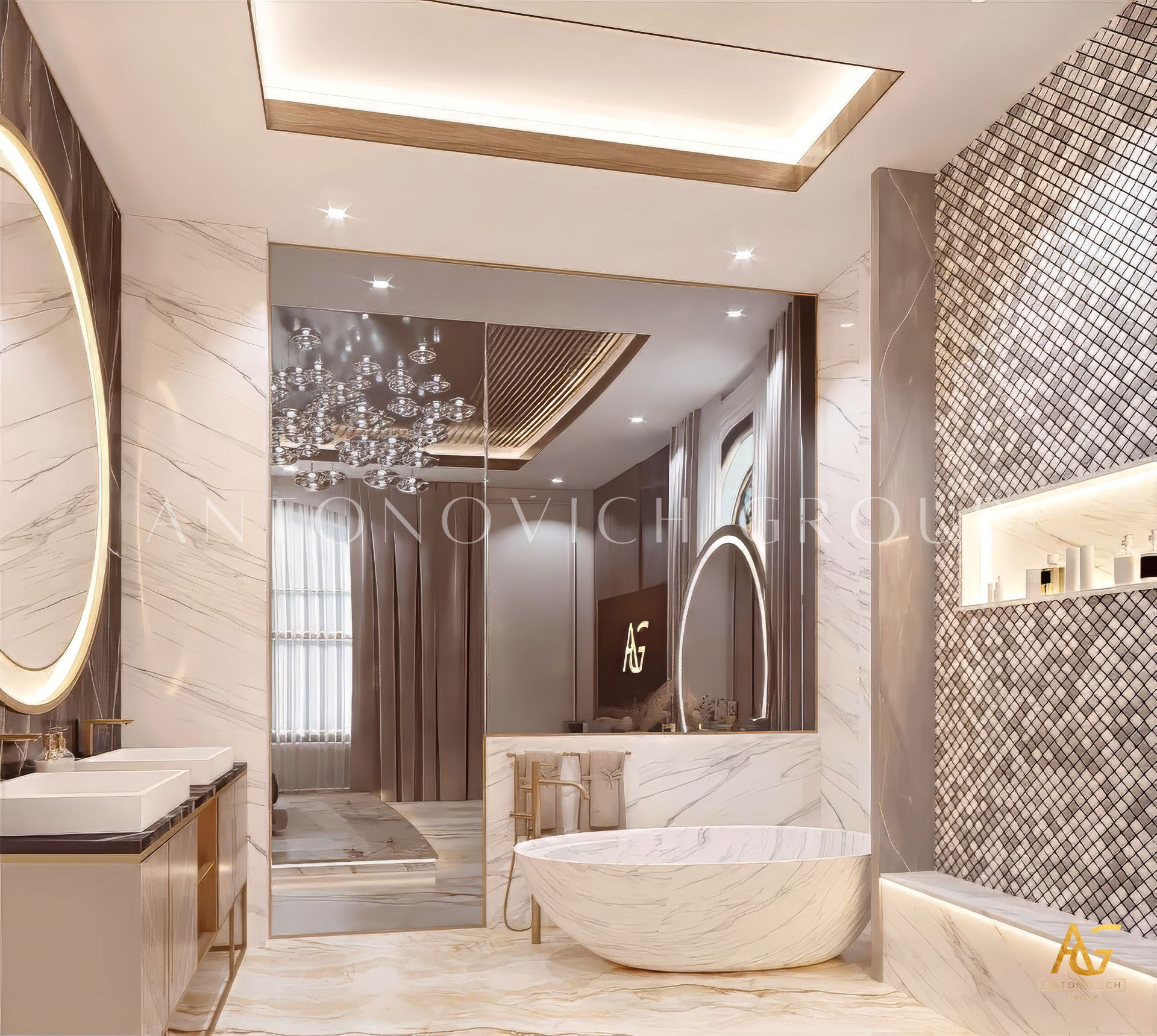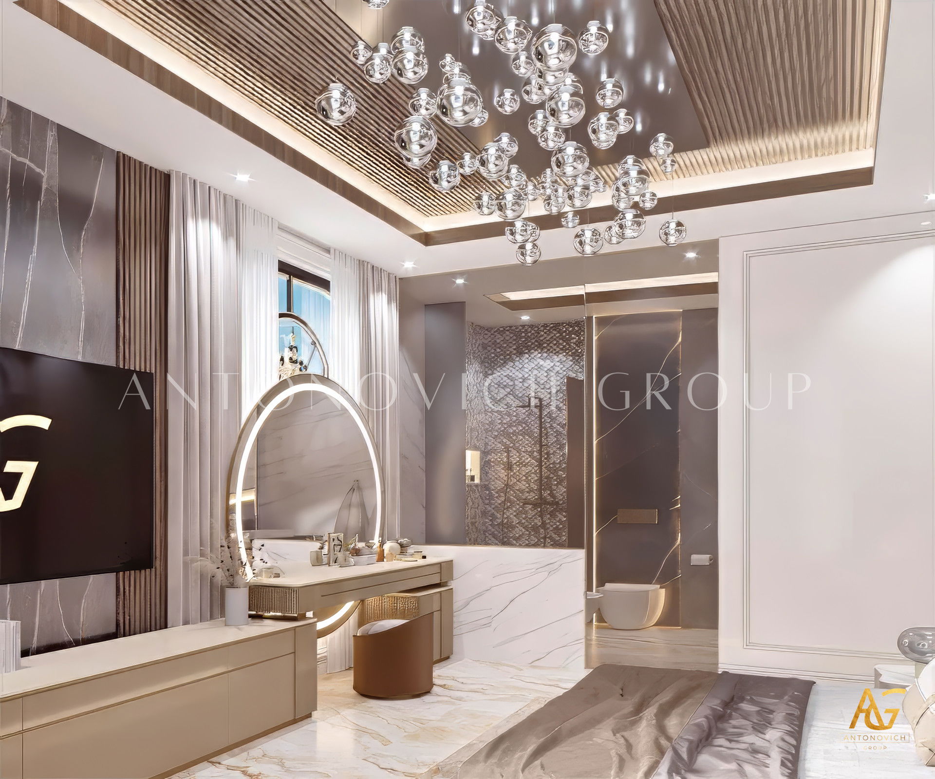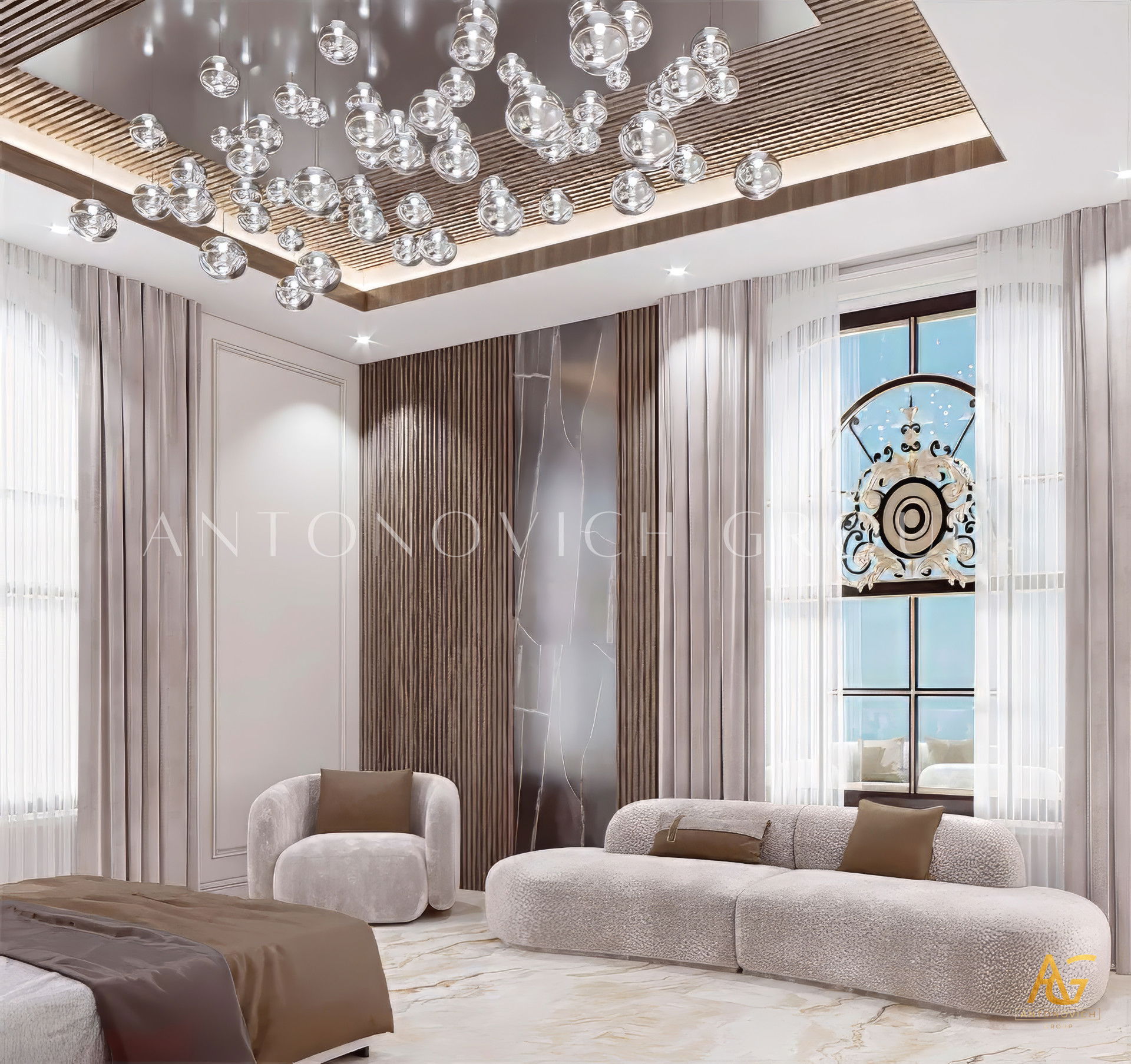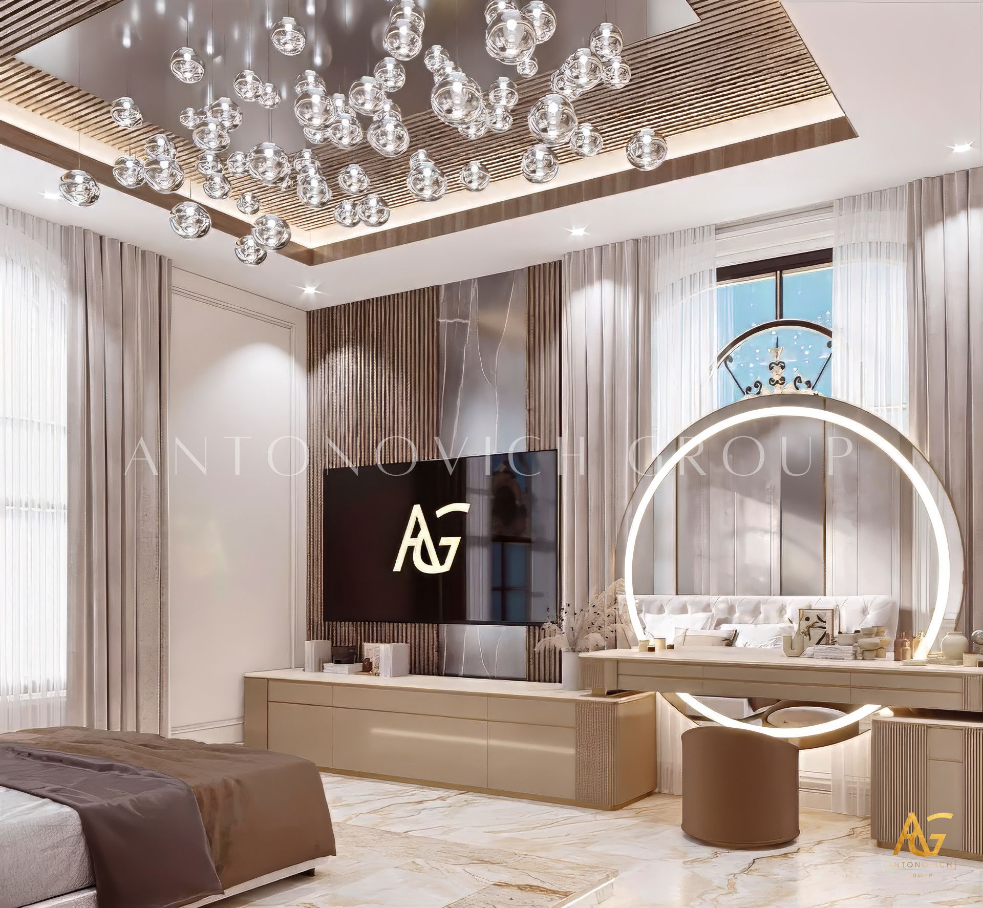 Современный стиль комнаты и интерьер прекрасно дополняют друг друга, а детали были художественно показаны. Фиолетовые и деревянные акценты привлекали внимание; коллекция декора добавляет живости, а светлые элементы подчёркивают элегантность и роскошь. Антонович Дизайн (Antonovich Design) — превосходный поставщик услуг по дизайну: мы предлагаем современный дизайн интерьера для дома, интерьер в стиле люкс для дома, дизайн с деревянными акцентами и интерьер с фиолетовыми акцентами. У нас доступно планирование роскошного интерьера под ключ и элитный дизайн для семьи.