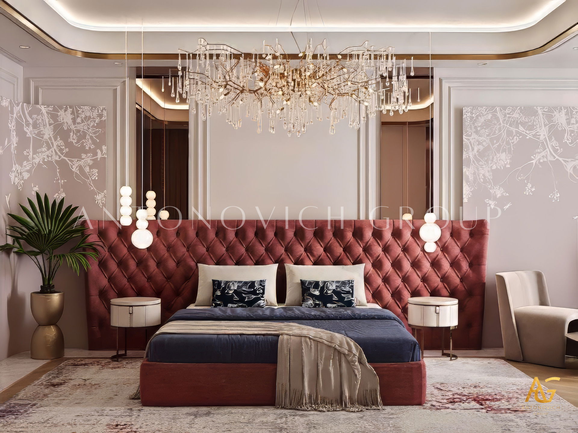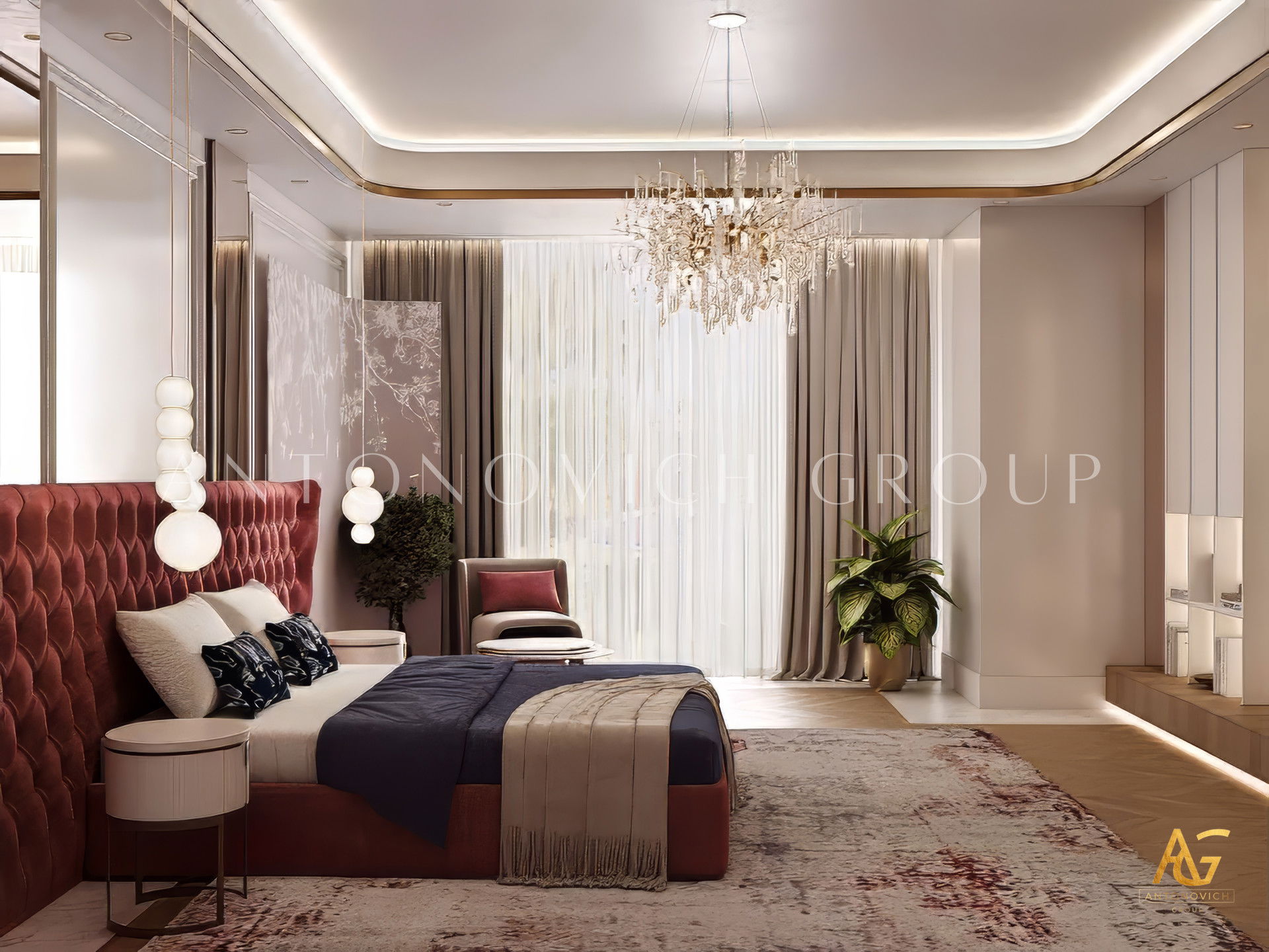 Золотые линии на стене и тёмный акцент придают общему облику дома элегантность и роскошь. Для усиления эффекта к роскошным узорам добавлены детализированные элементы. Этот прекрасный интерьер — бесспорно идеальный выбор для вас благодаря стильной подаче и глэм-эстетике. Перед запуском каждый элемент был тщательно проверен — от люстры до великолепных золотых линий. Цвета гармонируют между собой, а люстра — неизменный атрибут современного и премиального дизайна интерьера.