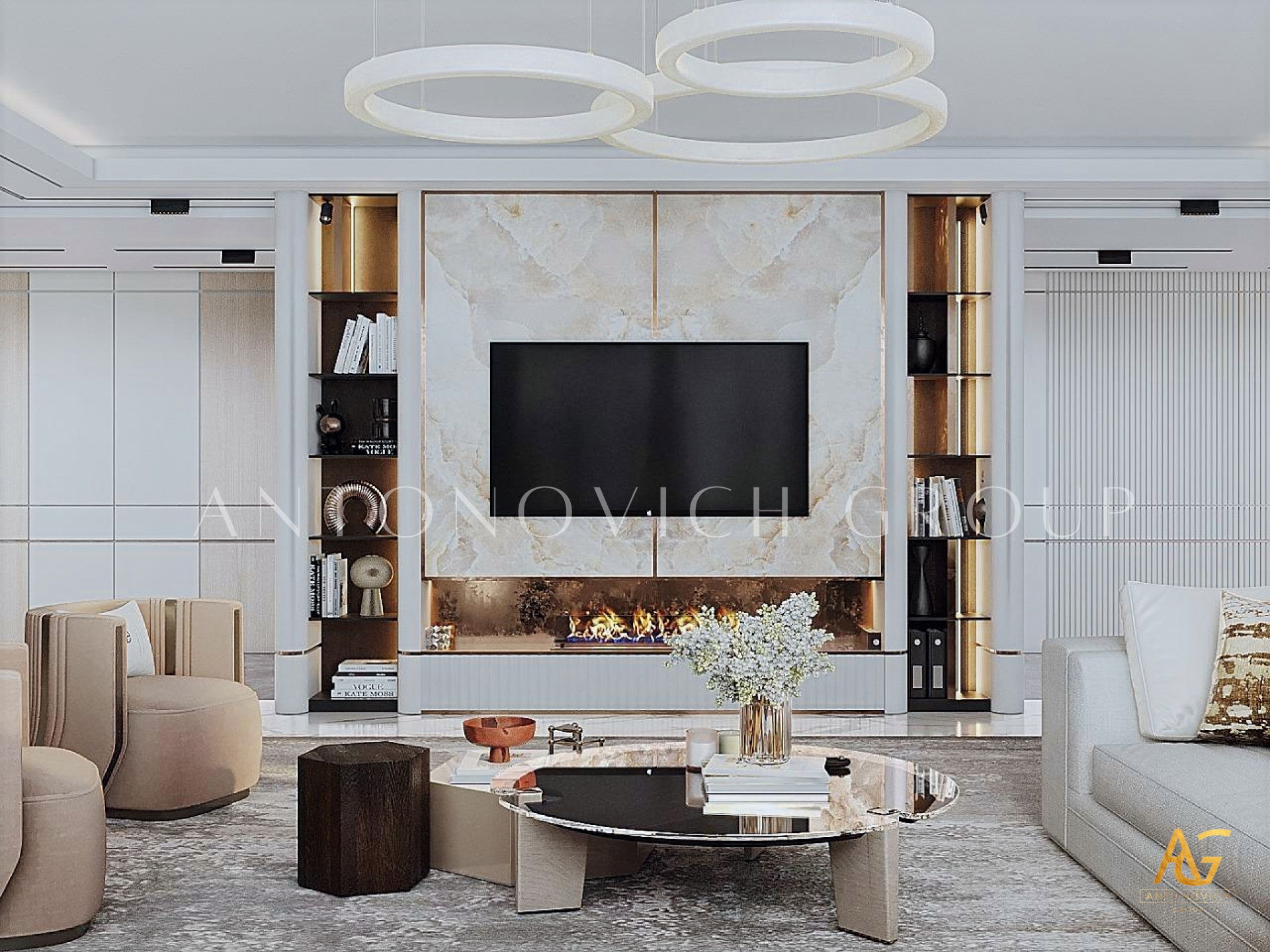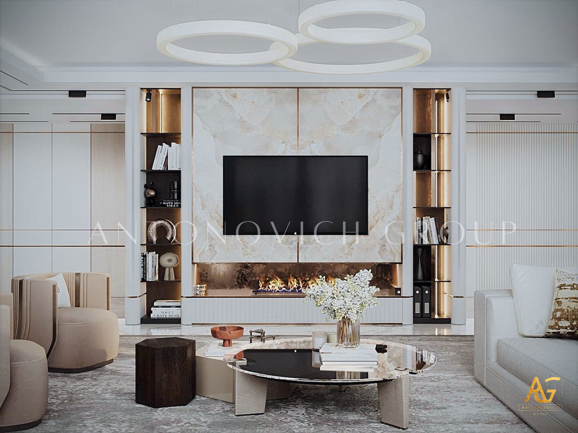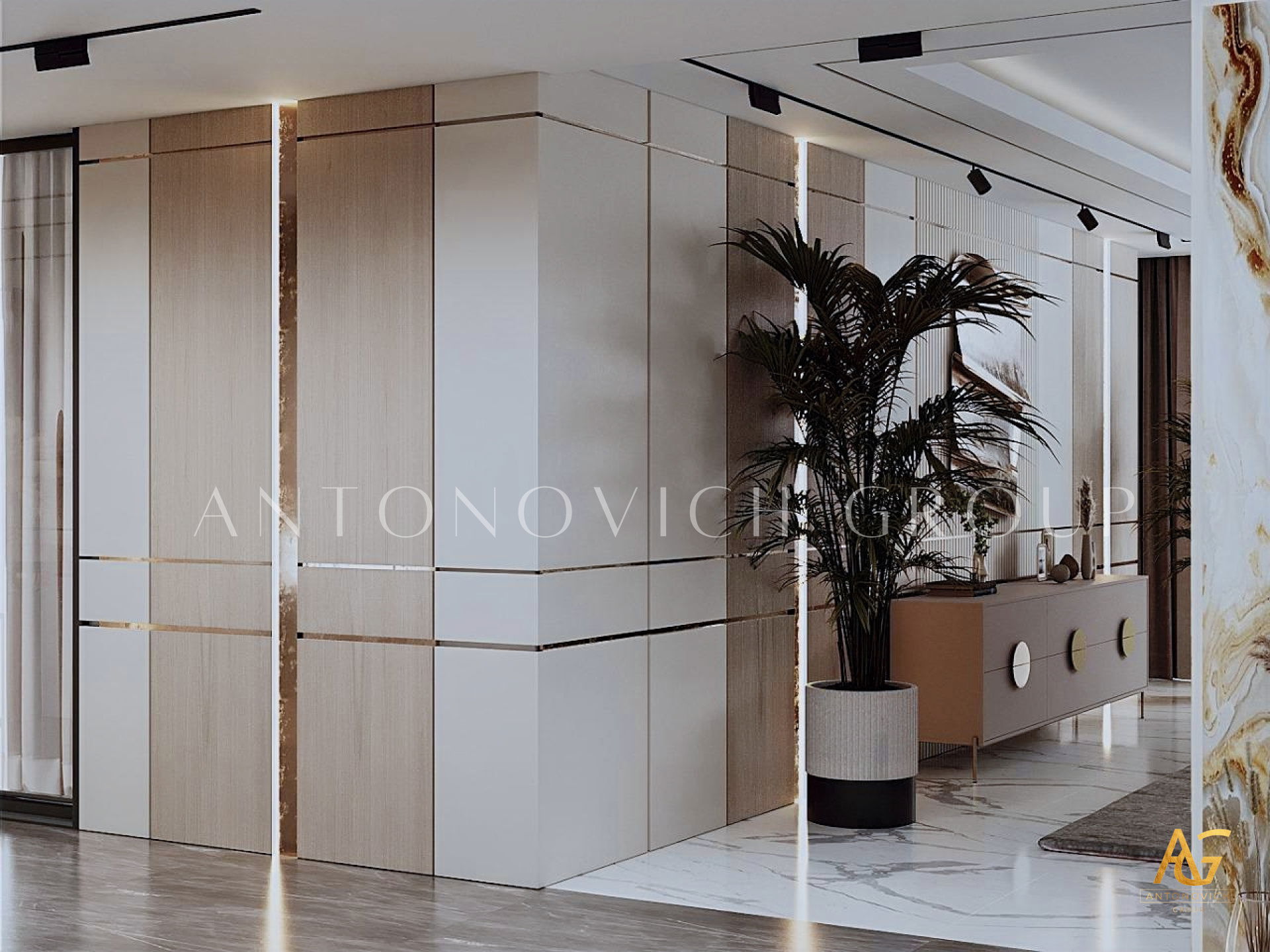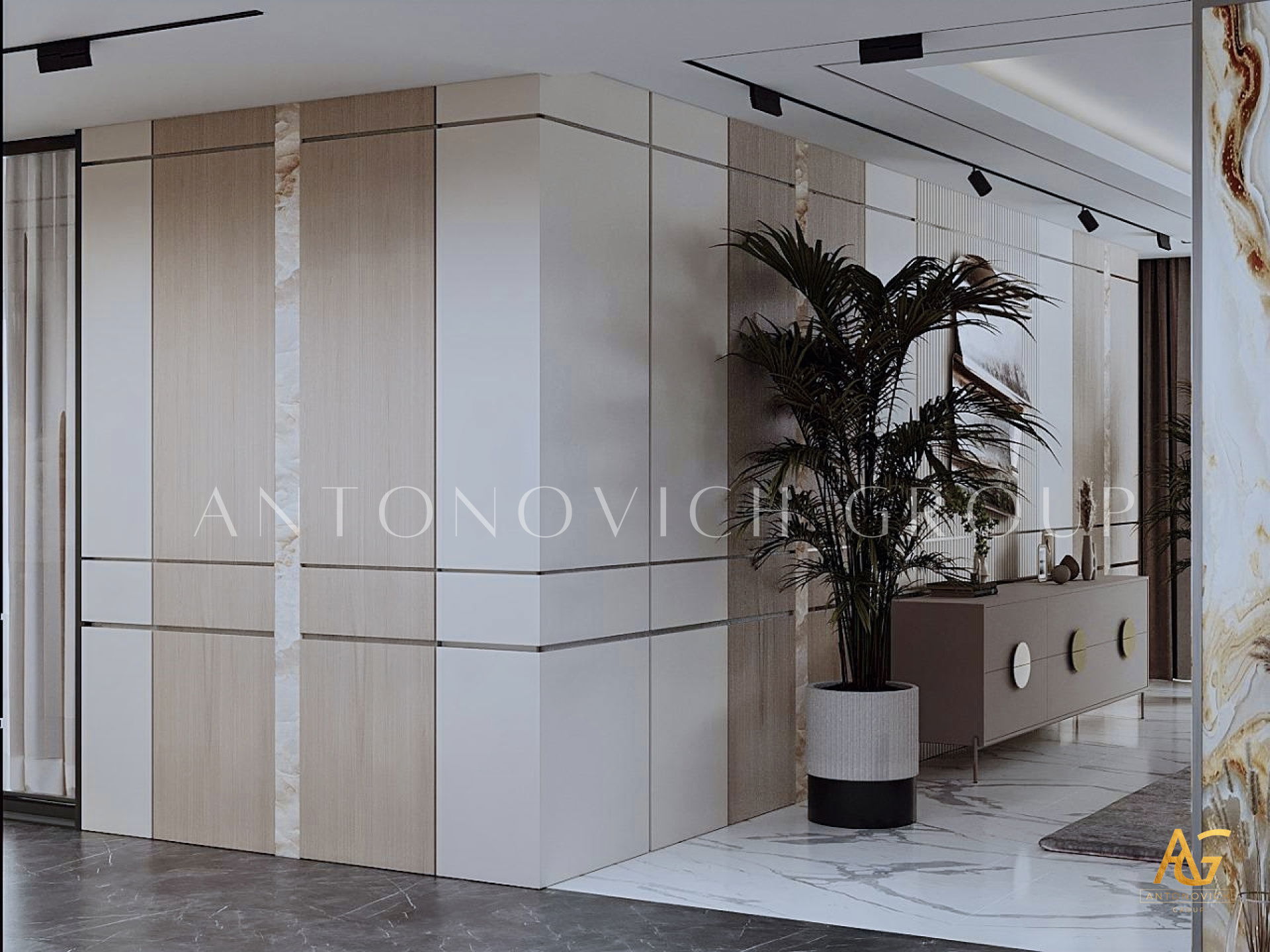 Современный дизайн квартир становится моментом, когда интерьерные дизайнеры в городской квартире стремятся создать роскошь и комфорт, которые визуально и эмоционально сравнимы с просторной загородной виллой. В этом проекте используются: дизайн квартиры в Нью-Йорке, современный дизайн квартиры в стиле классика, интерьер квартиры в стиле арт-деко, роскошный интерьер квартиры в городе, оформление гостиной открытой планировки. Эта интерьерная история начинается с небольшого коридора, который оформлен изящно — здесь присутствует отделка стен кремовой штукатуркой и дизайн коридора с мраморным полом. Натуральный мрамор украшен большой монограммой — мраморный пол с монограммой. В декоре потолка применены многоуровневая ниша и красивая люстра, освещение и ниши в потолке визуально увеличивают высоту пространства. Для комфортных моментов у основания мягкой полуколонны стоит оттоман, а коридор и гостиная разделены элегантными элементами: полуколонны в интерьере гостиной с перламутровым узором. В гостиной авторы проекта сосредоточились на декоре стен, что придаёт комнате уникальное очарование и художественную выразительность. Оформление гостиной открытой планировки продолжается зоной питания, где кухня столовая открытая планировка объединяет обеденную и кухонную функции. Каждый житель квартиры имеет своё уникальное и уютное пространство, которое повторяет мечты и желания, а также представления о красоте. В целом это роскошный интерьер квартиры в городе, выполненный с вниманием к деталям.