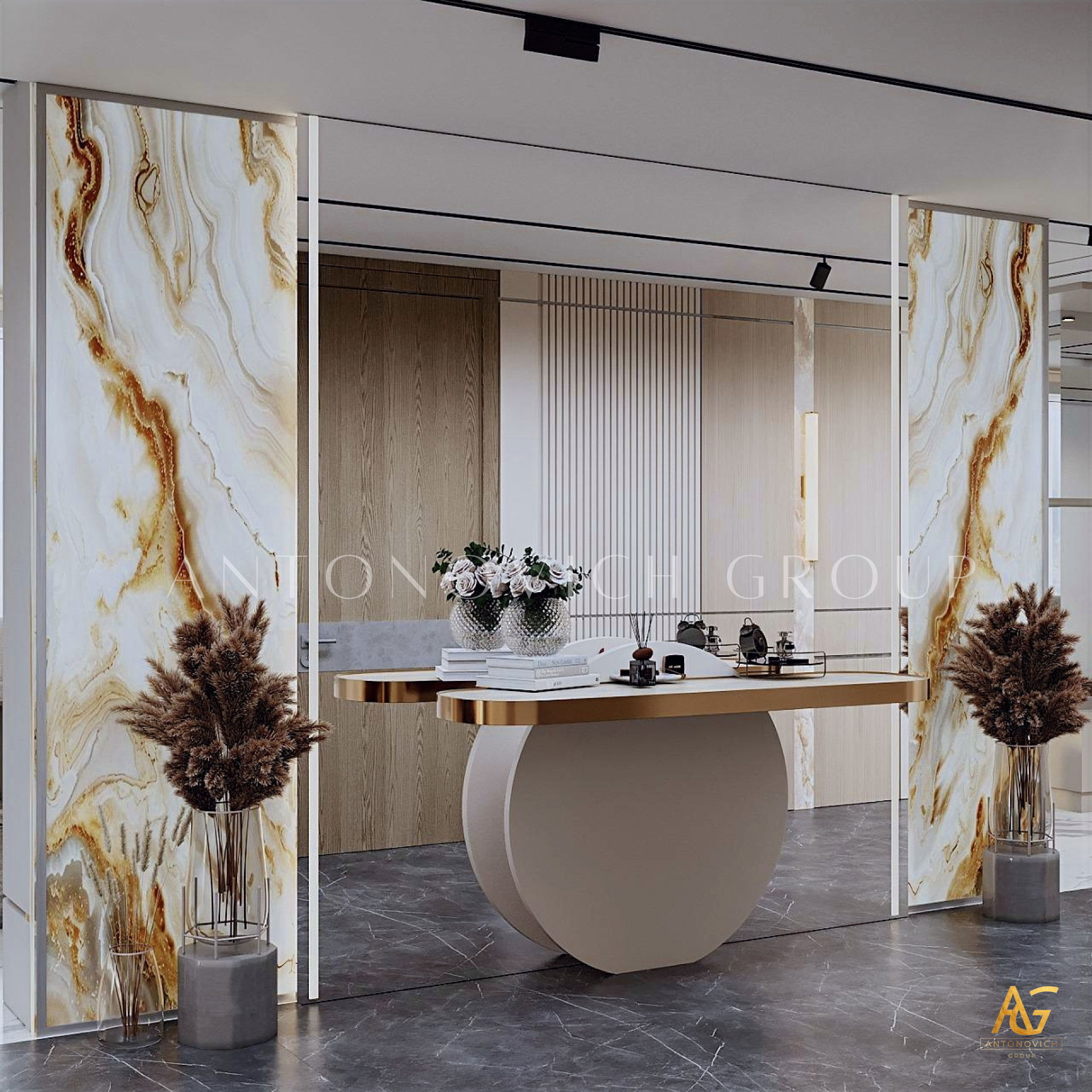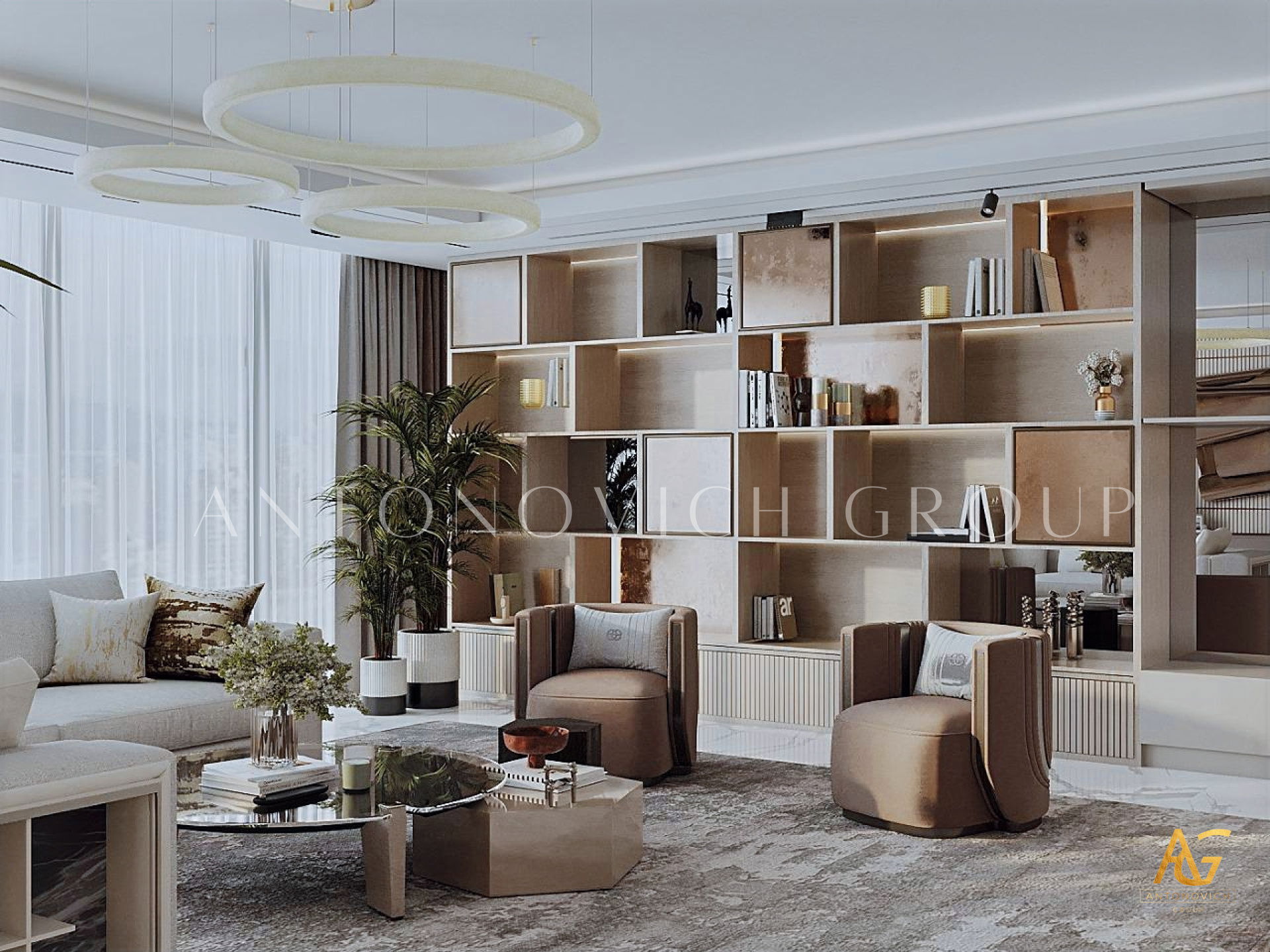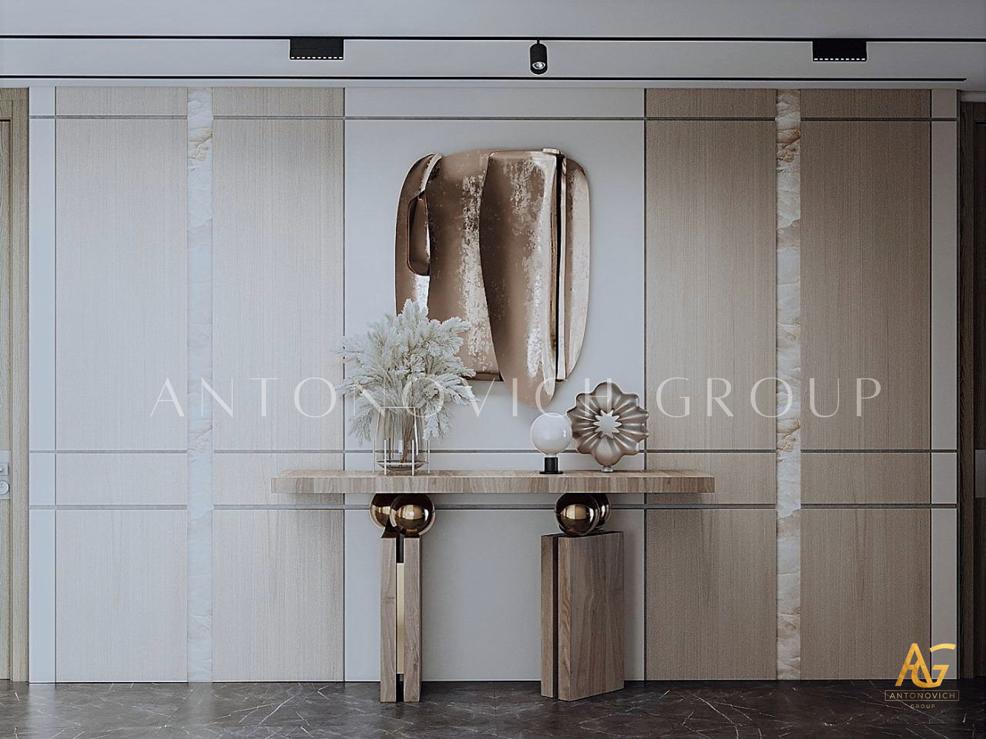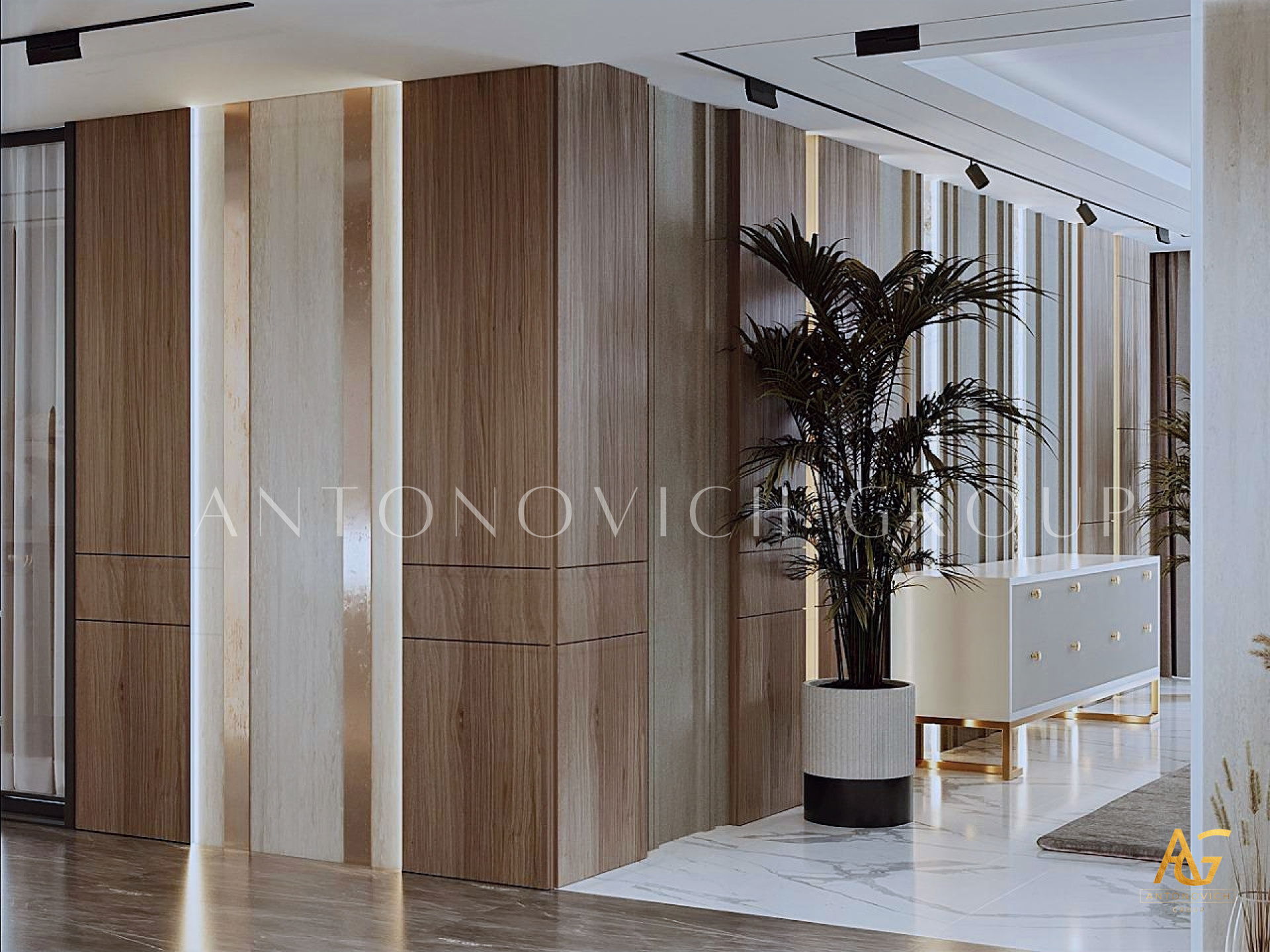 Современный дизайн квартир становится моментом, когда интерьерные дизайнеры в городской квартире стремятся создать роскошь и комфорт, которые визуально и эмоционально сравнимы с просторной загородной виллой. В этом проекте используются: дизайн квартиры в Нью-Йорке, современный дизайн квартиры в стиле классика, интерьер квартиры в стиле арт-деко, роскошный интерьер квартиры в городе, оформление гостиной открытой планировки. Эта интерьерная история начинается с небольшого коридора, который оформлен изящно — здесь присутствует отделка стен кремовой штукатуркой и дизайн коридора с мраморным полом. Натуральный мрамор украшен большой монограммой — мраморный пол с монограммой. В декоре потолка применены многоуровневая ниша и красивая люстра, освещение и ниши в потолке визуально увеличивают высоту пространства. Для комфортных моментов у основания мягкой полуколонны стоит оттоман, а коридор и гостиная разделены элегантными элементами: полуколонны в интерьере гостиной с перламутровым узором. В гостиной авторы проекта сосредоточились на декоре стен, что придаёт комнате уникальное очарование и художественную выразительность. Оформление гостиной открытой планировки продолжается зоной питания, где кухня столовая открытая планировка объединяет обеденную и кухонную функции. Каждый житель квартиры имеет своё уникальное и уютное пространство, которое повторяет мечты и желания, а также представления о красоте. В целом это роскошный интерьер квартиры в городе, выполненный с вниманием к деталям.