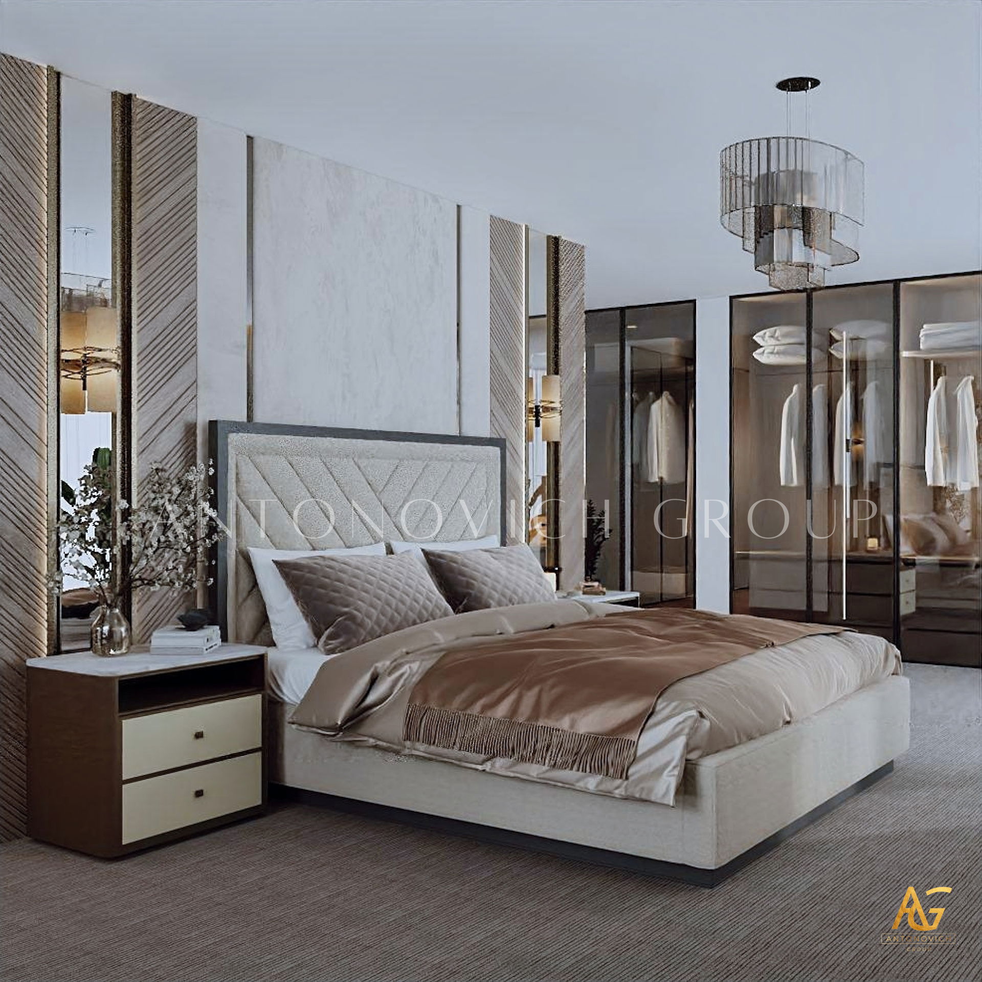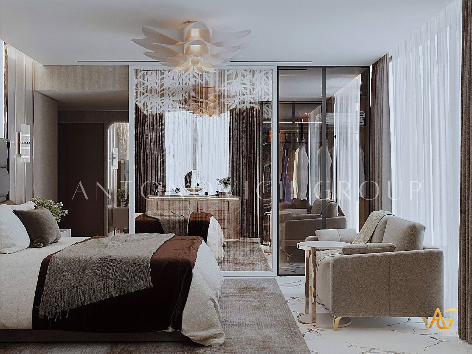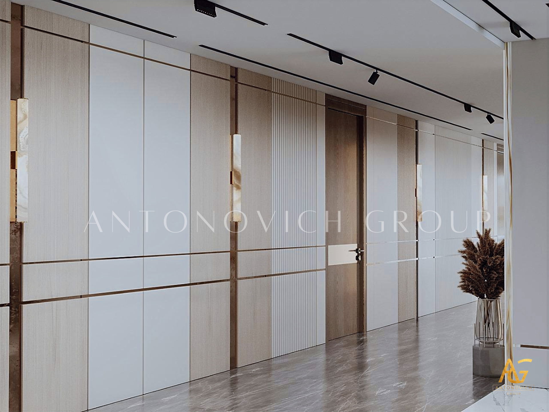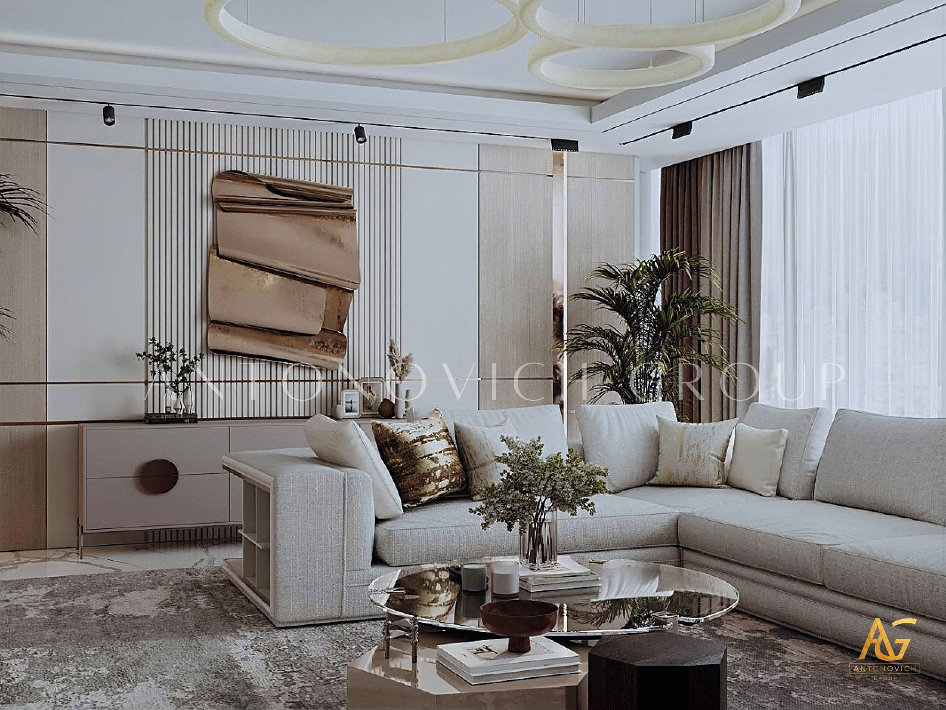Современный дизайн квартир становится моментом, когда интерьерные дизайнеры в городской квартире стремятся создать роскошь и комфорт, которые визуально и эмоционально сравнимы с просторной загородной виллой. В этом проекте используются: дизайн квартиры в Нью-Йорке, современный дизайн квартиры в стиле классика, интерьер квартиры в стиле арт-деко, роскошный интерьер квартиры в городе, оформление гостиной открытой планировки. Эта интерьерная история начинается с небольшого коридора, который оформлен изящно — здесь присутствует отделка стен кремовой штукатуркой и дизайн коридора с мраморным полом. Натуральный мрамор украшен большой монограммой — мраморный пол с монограммой. В декоре потолка применены многоуровневая ниша и красивая люстра, освещение и ниши в потолке визуально увеличивают высоту пространства. Для комфортных моментов у основания мягкой полуколонны стоит оттоман, а коридор и гостиная разделены элегантными элементами: полуколонны в интерьере гостиной с перламутровым узором. В гостиной авторы проекта сосредоточились на декоре стен, что придаёт комнате уникальное очарование и художественную выразительность. Оформление гостиной открытой планировки продолжается зоной питания, где кухня столовая открытая планировка объединяет обеденную и кухонную функции. Каждый житель квартиры имеет своё уникальное и уютное пространство, которое повторяет мечты и желания, а также представления о красоте. В целом это роскошный интерьер квартиры в городе, выполненный с вниманием к деталям.