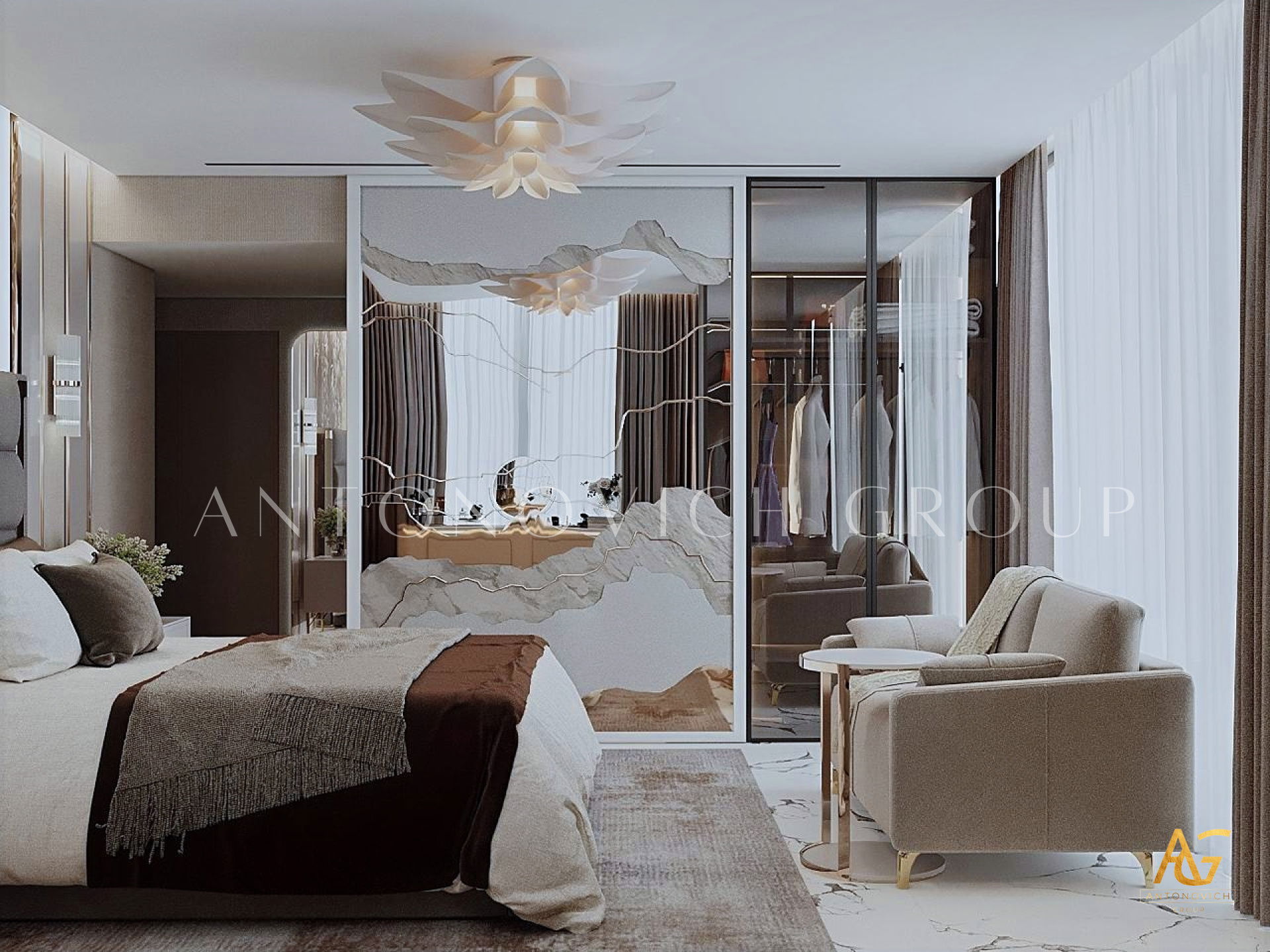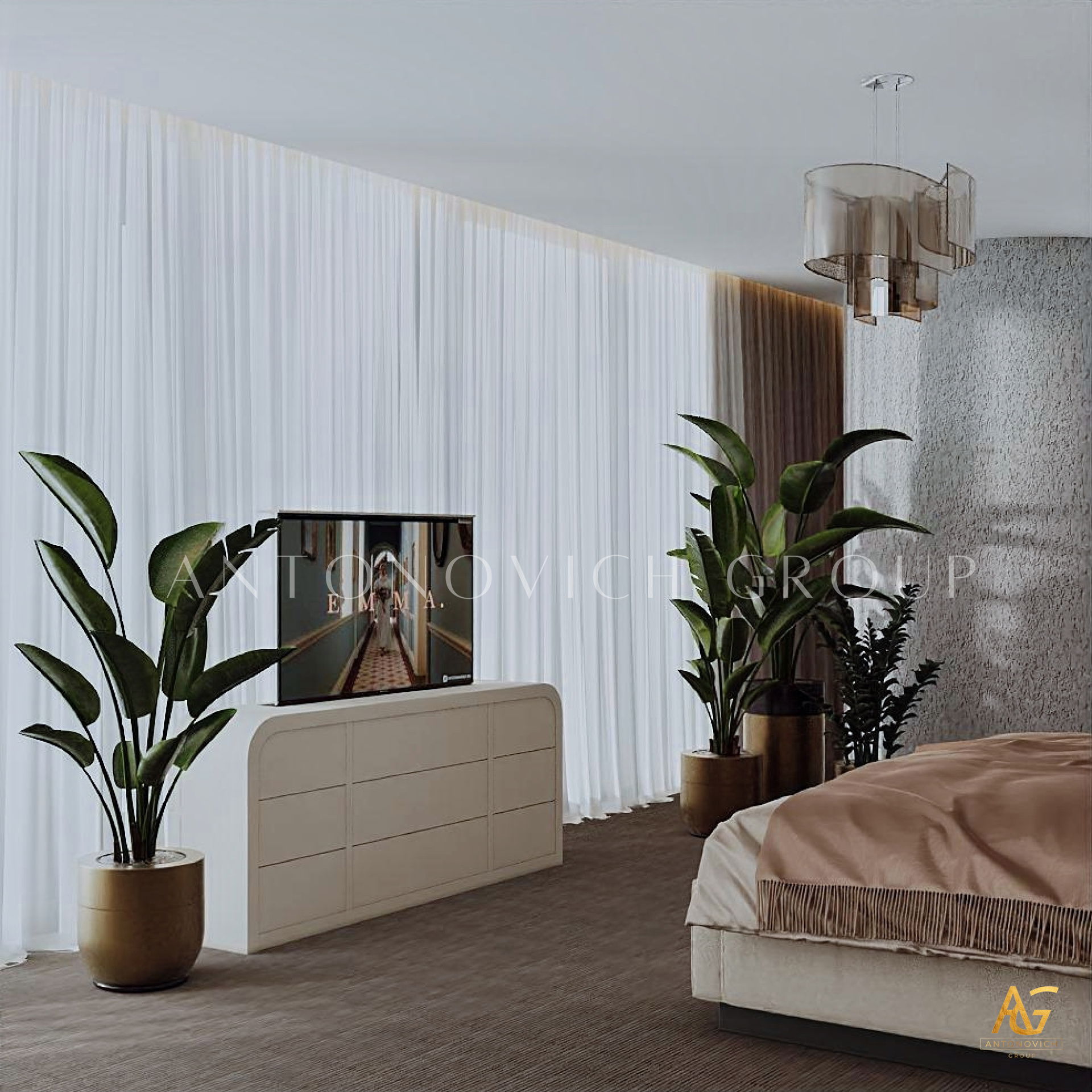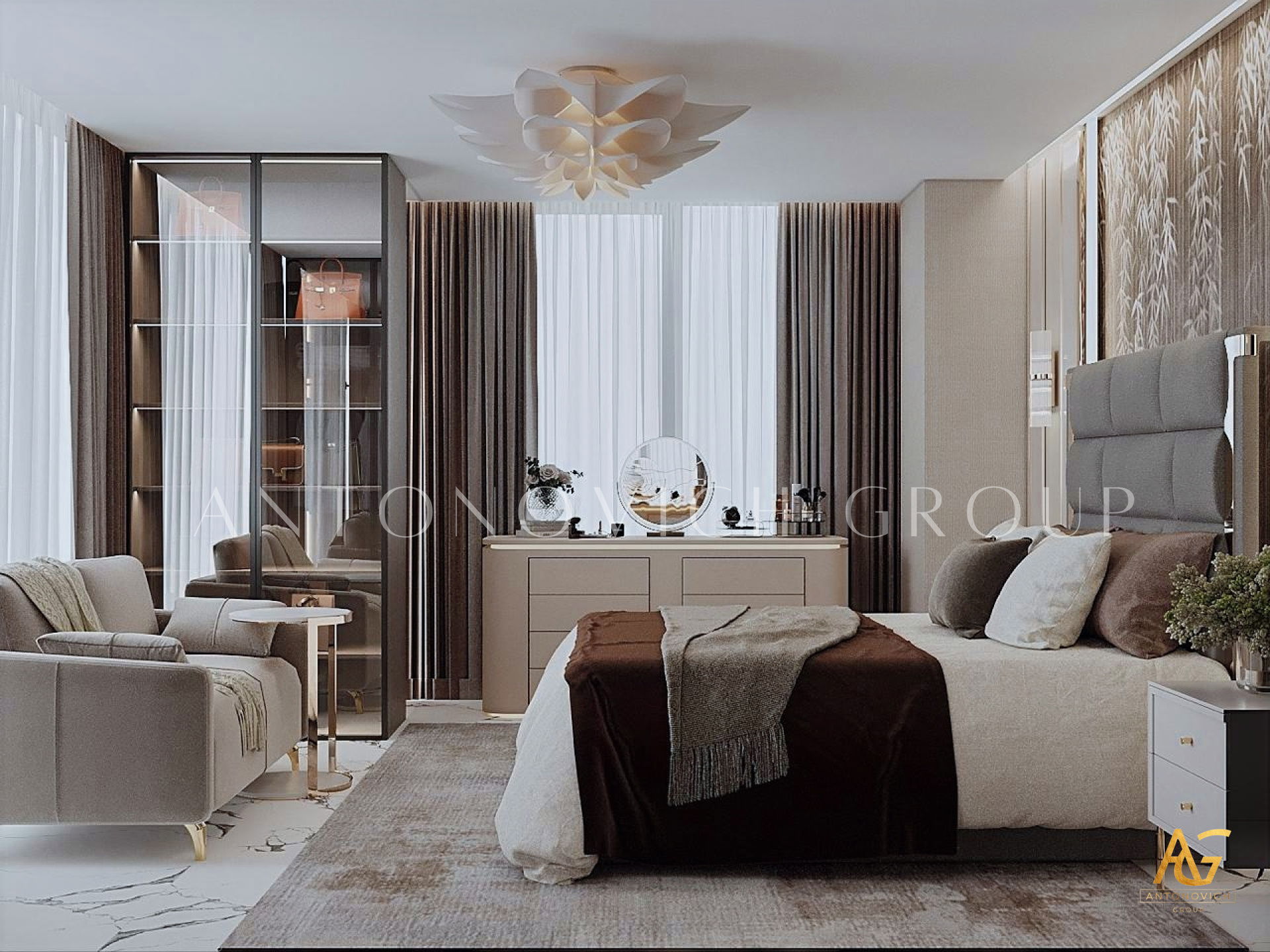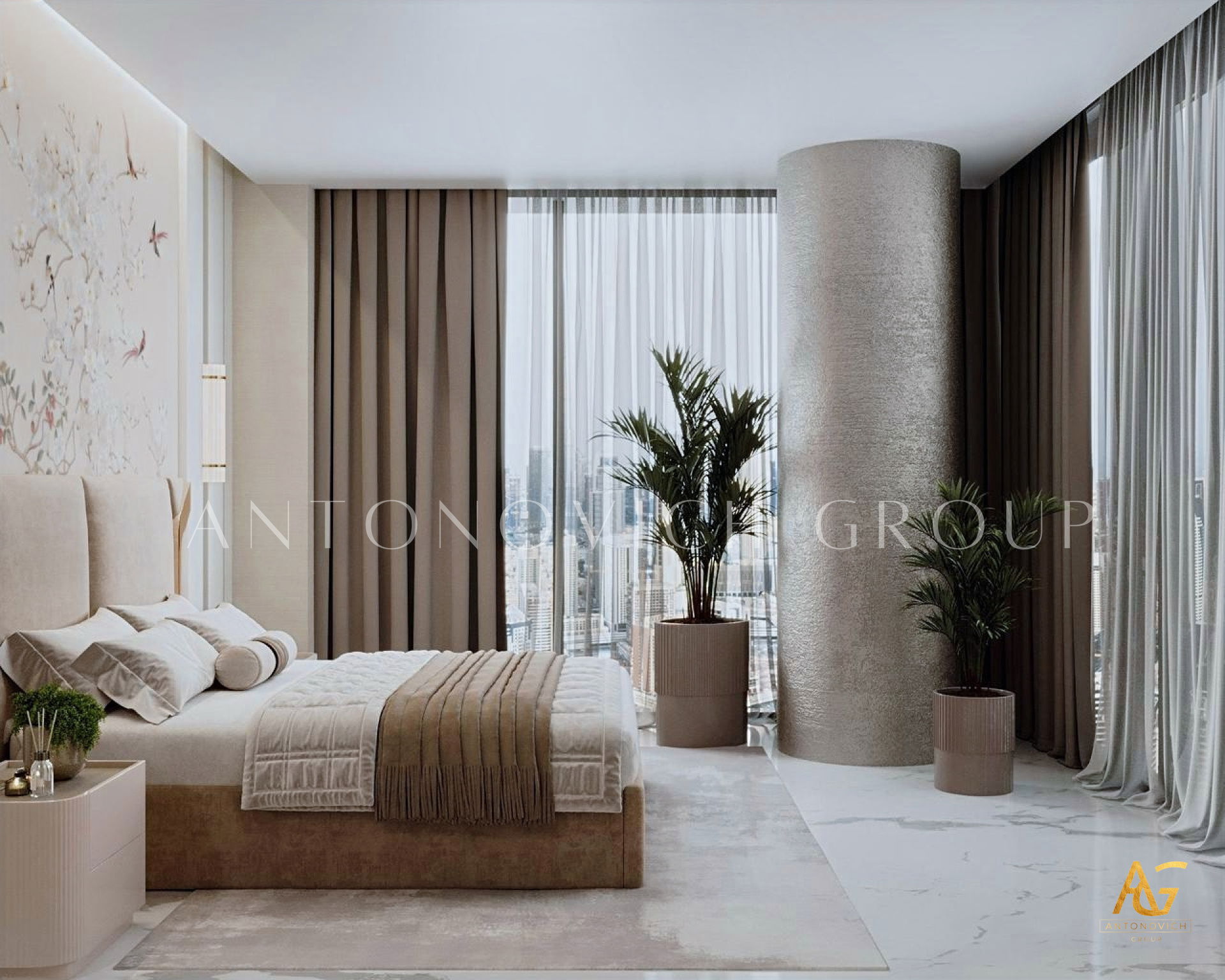 Современный дизайн квартир становится моментом, когда интерьерные дизайнеры в городской квартире стремятся создать роскошь и комфорт, которые визуально и эмоционально сравнимы с просторной загородной виллой. В этом проекте используются: дизайн квартиры в Нью-Йорке, современный дизайн квартиры в стиле классика, интерьер квартиры в стиле арт-деко, роскошный интерьер квартиры в городе, оформление гостиной открытой планировки. Эта интерьерная история начинается с небольшого коридора, который оформлен изящно — здесь присутствует отделка стен кремовой штукатуркой и дизайн коридора с мраморным полом. Натуральный мрамор украшен большой монограммой — мраморный пол с монограммой. В декоре потолка применены многоуровневая ниша и красивая люстра, освещение и ниши в потолке визуально увеличивают высоту пространства. Для комфортных моментов у основания мягкой полуколонны стоит оттоман, а коридор и гостиная разделены элегантными элементами: полуколонны в интерьере гостиной с перламутровым узором. В гостиной авторы проекта сосредоточились на декоре стен, что придаёт комнате уникальное очарование и художественную выразительность. Оформление гостиной открытой планировки продолжается зоной питания, где кухня столовая открытая планировка объединяет обеденную и кухонную функции. Каждый житель квартиры имеет своё уникальное и уютное пространство, которое повторяет мечты и желания, а также представления о красоте. В целом это роскошный интерьер квартиры в городе, выполненный с вниманием к деталям.