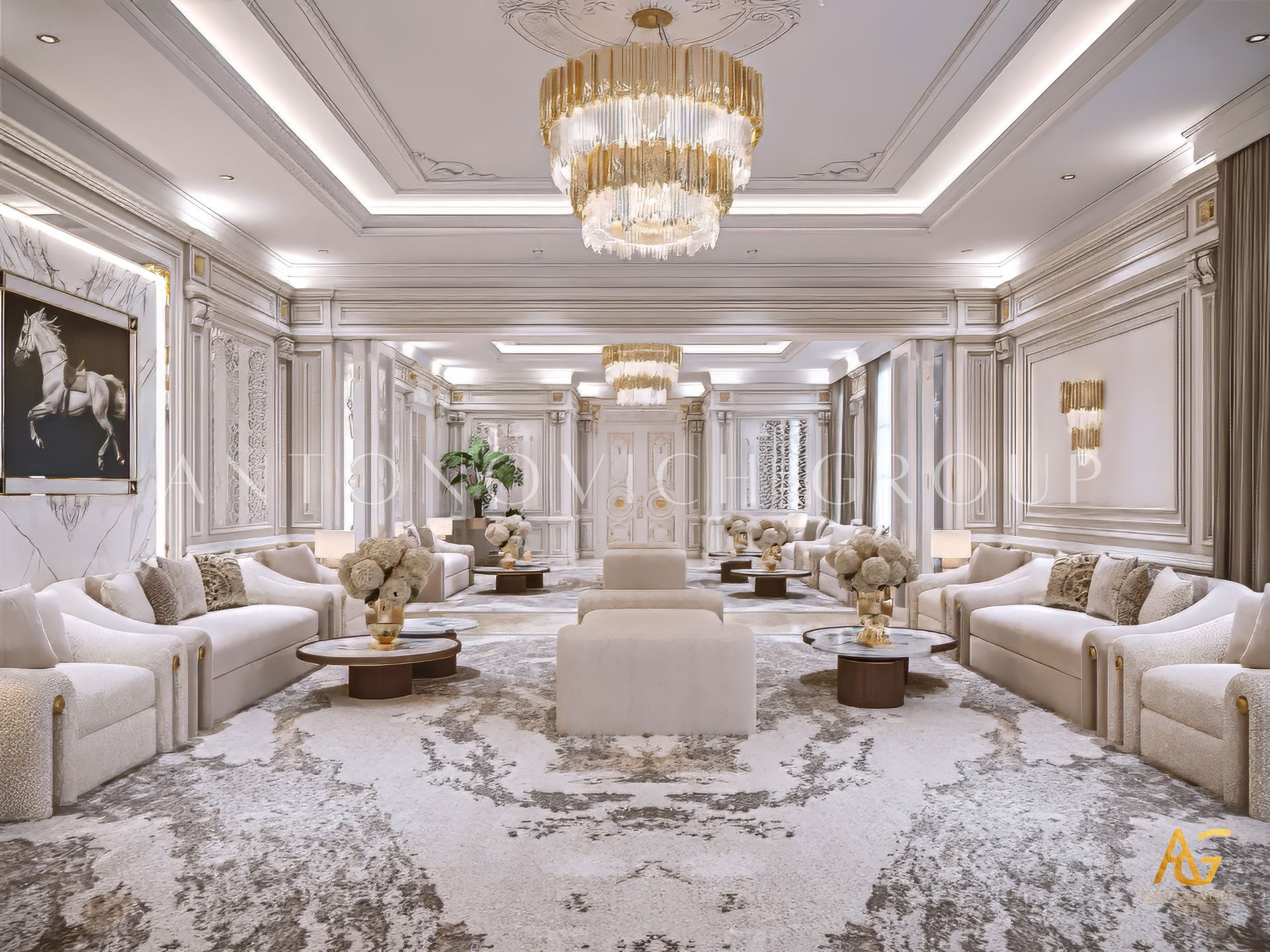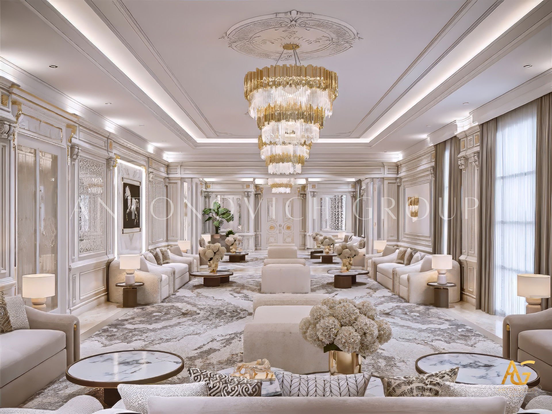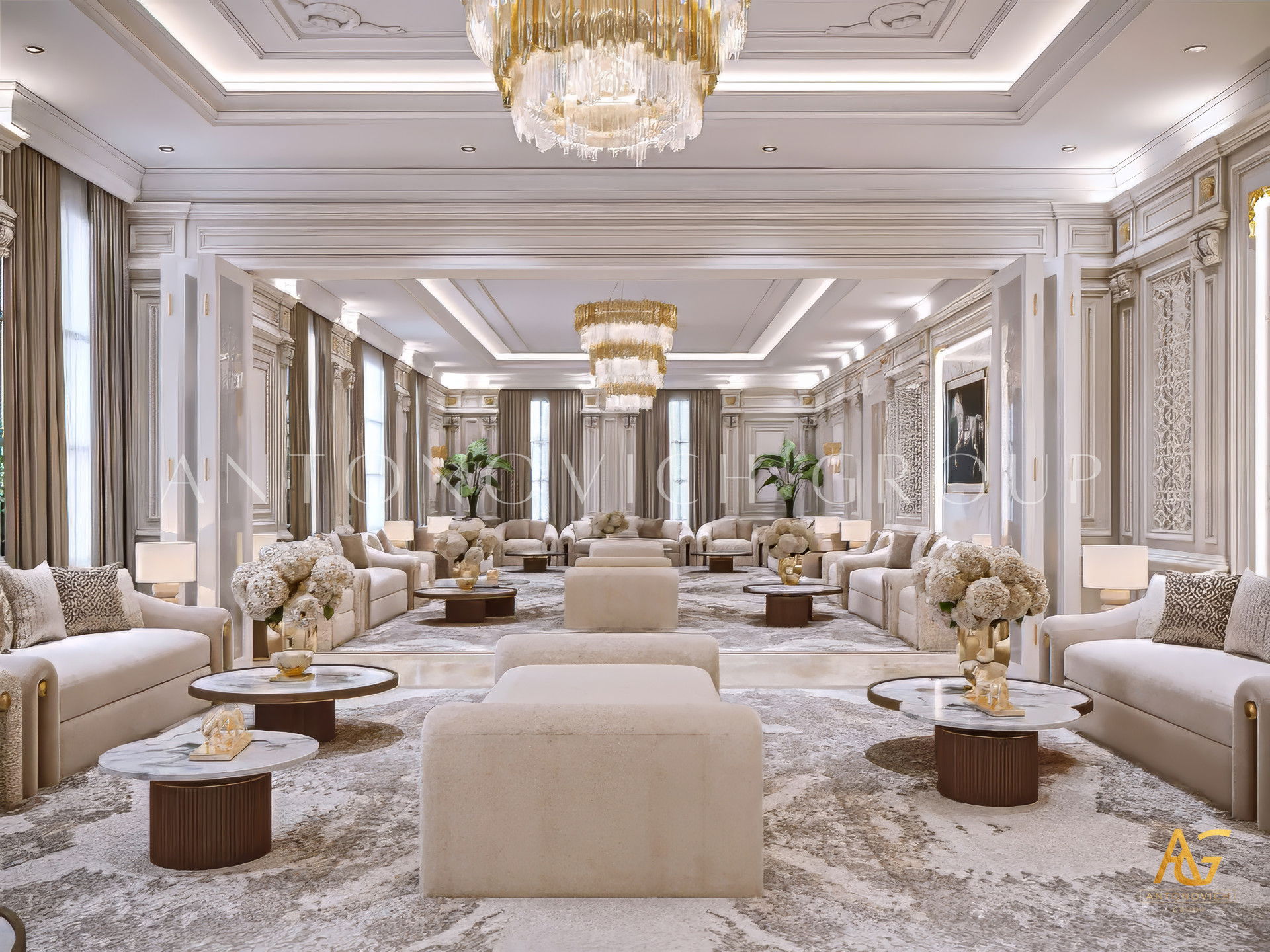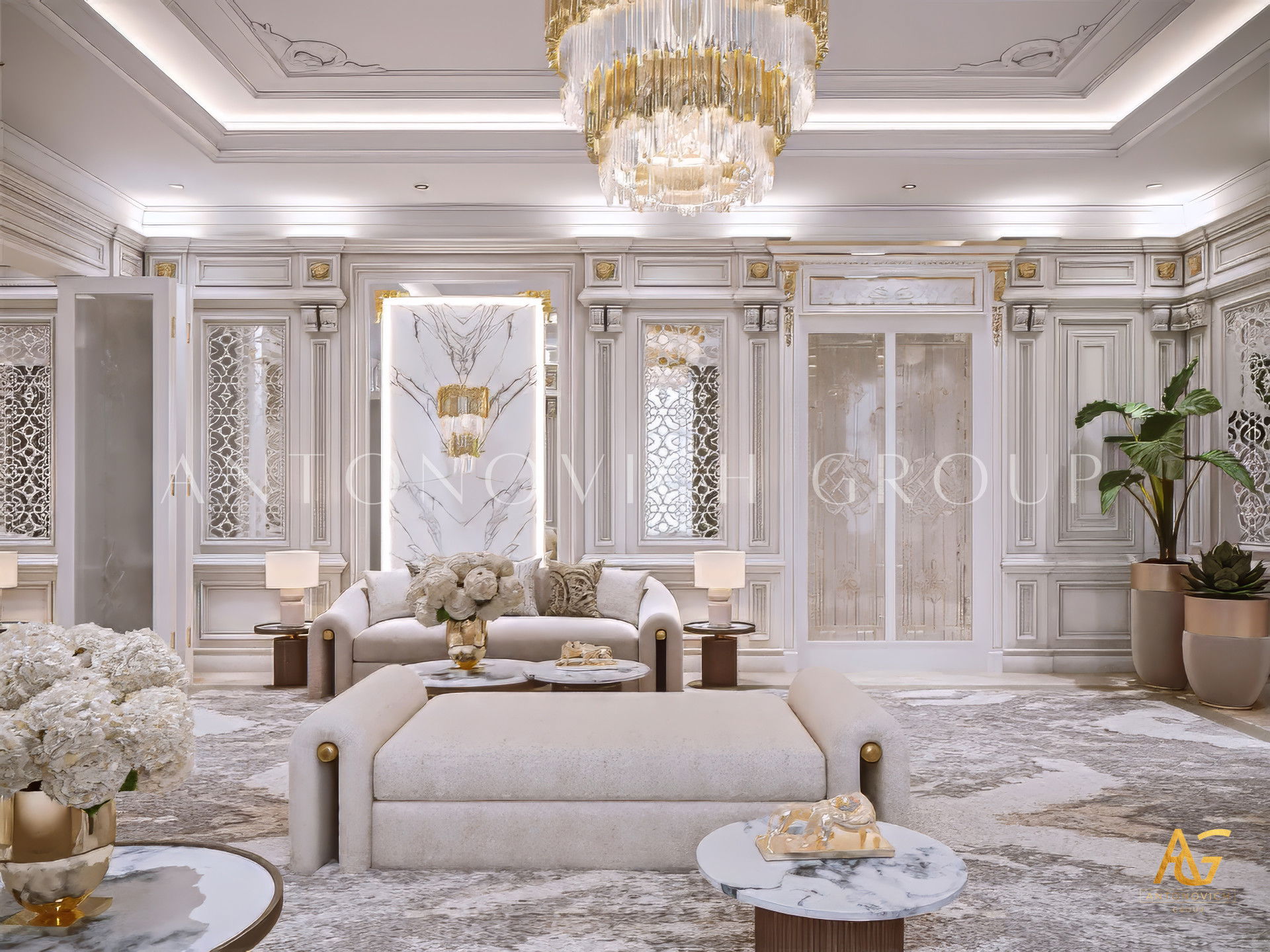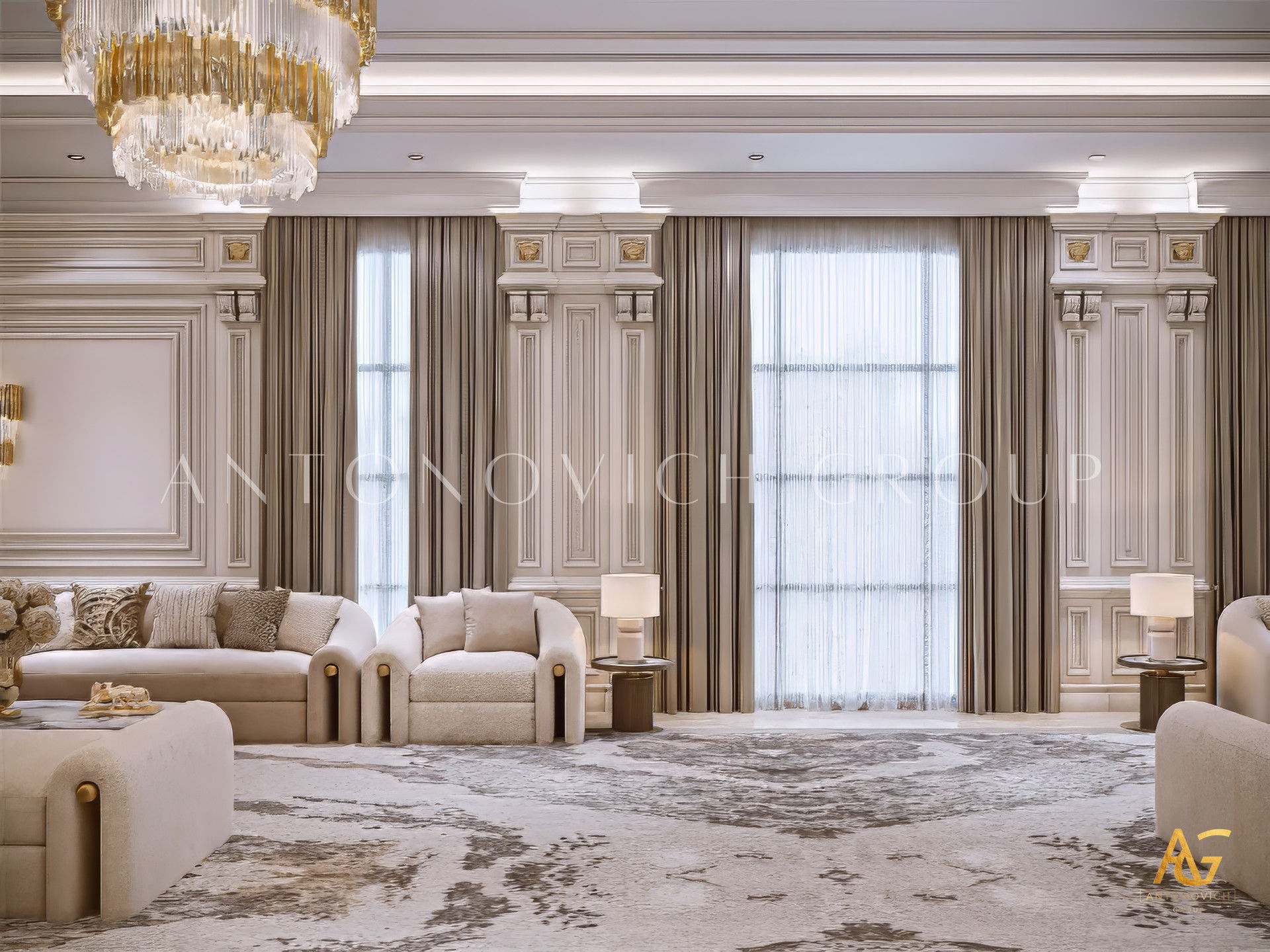 Роскошная Антонович Дизайн (Antonovich Design) создаёт великолепные интерьеры, уникальные по своей природе. Как культурное пространство, преимущественно используемое для общественных встреч, маджлис — одна из самых востребованных услуг по дизайну интерьера. Мы предлагаем дизайн маджлиса в арабском стиле и другие решения, и наш роскошный дизайн интерьера подчёркивает индивидуальность каждого проекта. Стиль может варьироваться — классика или современность — какой бы стиль вы ни выбрали, мы реализуем лучшие идеи. Пример модели выше выполнен в более современном образе с премиальным дизайном интерьера. При этом сохраняются классические элементы в виде богатых текстур. Вдохновение интерьера — уют и декоративность. Вы заметите роскошные стены с золотыми линиями, создающие красивую фокальную точку. Эти стены станут темой для обсуждения, когда гости войдут в ваш маджлис. В интерьере также предусмотрен нейтральный диван с тёмной подушкой для контраста, и шторы от пола до потолка создают иллюзию вытянутого пространства.
