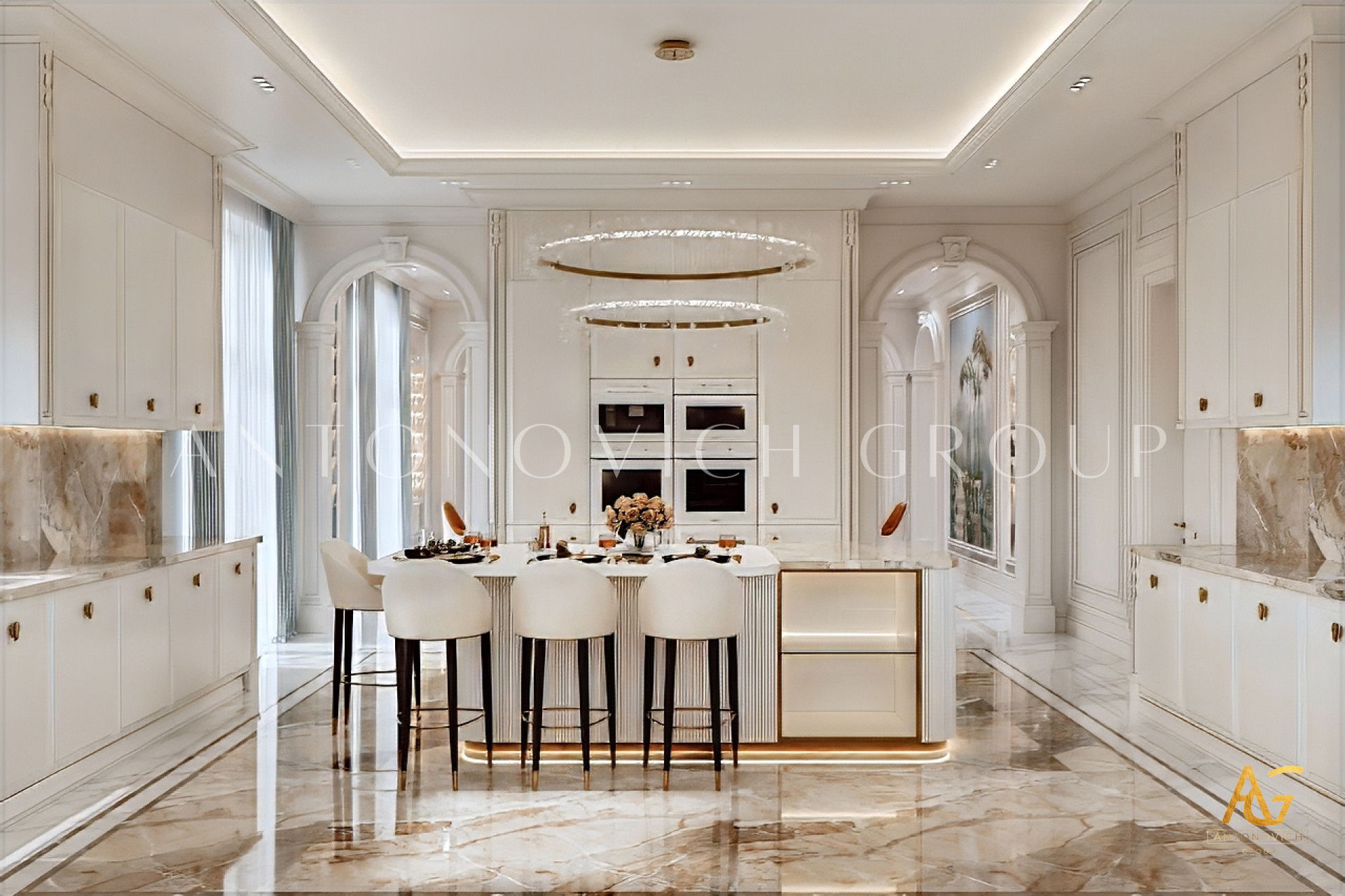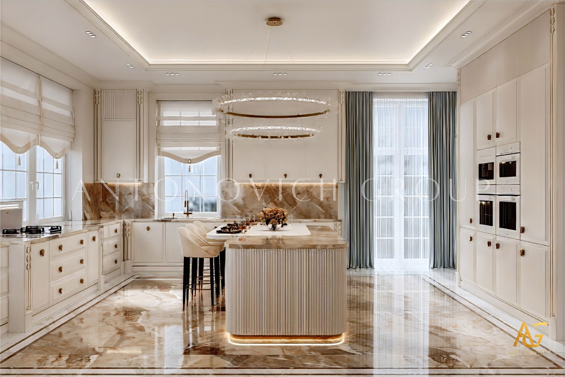 Кухня может стать не только любимым местом для всей семьи, но и главным украшением дома. Этот дизайн кухни в классическом стиле с акцентами прованса — идеальное тому подтверждение. Дизайнеры работали с большой площадью, что дало простор фантазии и позволило создать уникальную красоту интерьера. Кухонный гарнитур у окна расположен так, чтобы максимально использовать естественный свет. Дерево, окрашенное в нежно-голубой цвет с тонким эффектом старения, наполняет пространство свежим и романтичным настроением. Две небольшие рамы окна украшены шторы из натурального шелка для кухни с цветочным орнаментом; занавеси дополнены мягкими ламбрекенами и голубой бахромой. Невероятно красивый потолочный декор и лепнина в кухне задают атмосферу королевской роскоши, а лепной декор играет светотенью под дополнительной подсветкой. Роскошная люстра с крупными хрустальными подвесками вносит праздничное настроение — это кухня с кристальной люстрой и подсветкой. Художественная роспись в нежных тонах усиливает романтический акцент интерьера. Проект демонстрирует интерьер кухни в стиле прованс. Дизайнеры создали полностью комфортное пространство: так, кухня с островом из натурального мрамора может при необходимости служить небольшим обеденным столом, образуя уютную столовую зона с островом. Пол отделан марморовой плиткой для пола кухни в бежевых тонах с полосами цветочных орнаментов. Для оформления стен дизайнеры студии интерьера Антонович Дизайн (Antonovich Design) предложили обои с лаконичным рисунком для кухни и другие текстильные решения. Этот проект — пример классический интерьер кухни с провансом и элегантный дизайн кухни, объединённые в гармоничную композицию. дизайн больничных зданий, дизайнерские фирмы гостиничных интерьеров, планы архитектуры домов