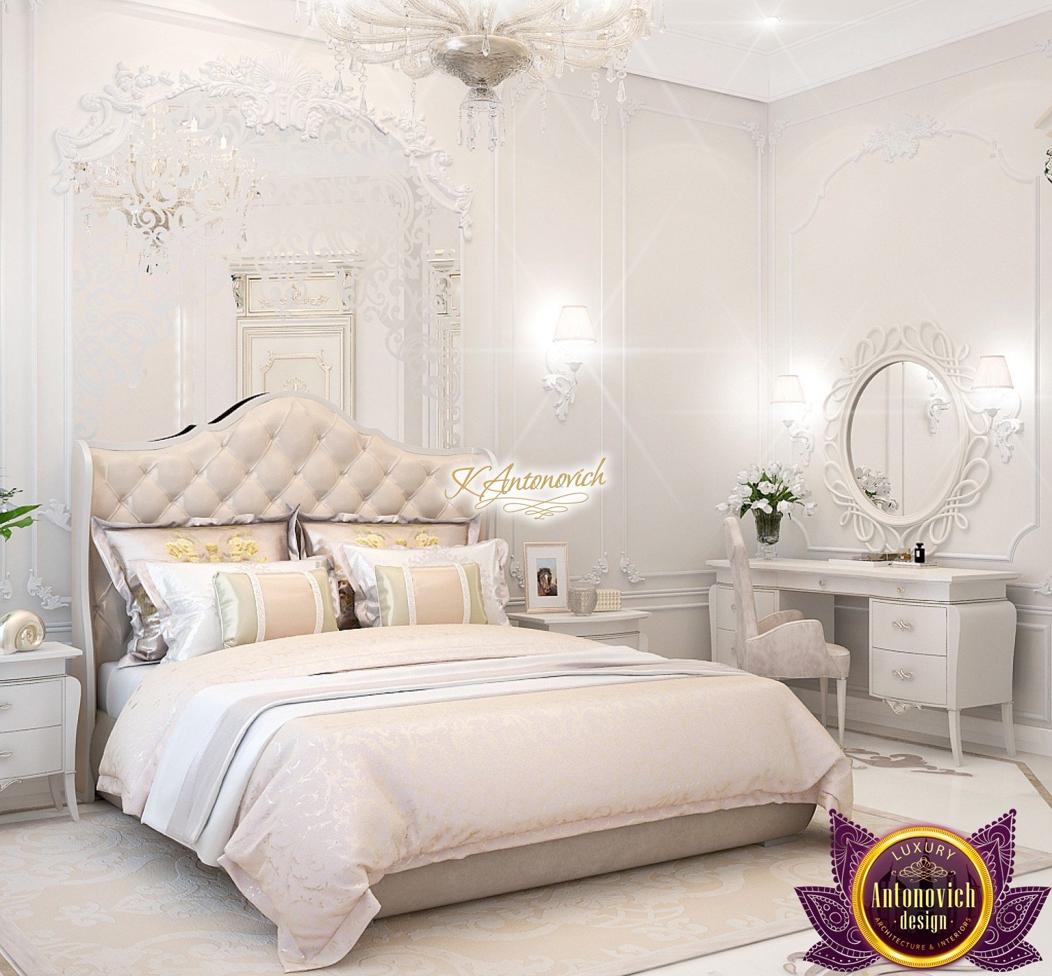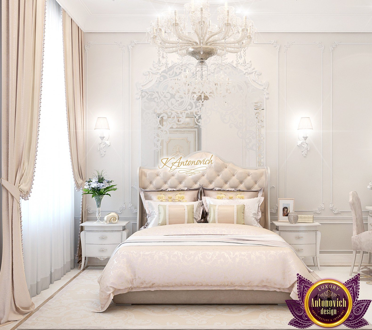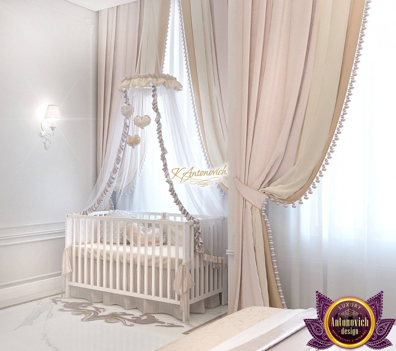 Интерьер этой спальни отличается особым характером истинного счастья и нежности. Работа над такими проектами чрезвычайно интересна: дизайнерам пришлось объединить шарм роскошной спальни и мягкую детскую зону — речь о спальне с детской зоной, идеальном решении для молодых родителей. Дизайн спальни с колыбелью подчёркивает близость родителей и ребёнка, поэтому так важно, чтобы все чувствовали себя уютно: комфортная спальня для родителей и ребенка создаётся продуманными решениями. Это классическая спальня с элементами арт-деко. Пастельная цветовая палитра для спальни идеально подходит для помещений, где малыш проводит много времени. Особое внимание уделено освещению — освещение для детской зоны в спальне продумано особенно тщательно. Чтобы визуально расширить относительно небольшую площадь, в проекте использованы проверенные и роскошные приёмы: зеркальные панели в интерьере спальни. Панель за изголовьем большого комфортного ложа выполнена из крупного зеркала с деликатным ажурным орнаментом. В интерьер гармонично вписалась красивая кровать с высоким мягким изголовьем: изголовье с кожаной обивкой кремово-розового оттенка. Такое решение также даёт дополнительный комфорт для малыша, поскольку кожа не собирает много пыли. На фоне жемчужно-белых стен особенно выразительно смотрятся классические настенные бра и изящный туалетный столик с круглым зеркалом. Шторы из натурального шелка бледно-персикового оттенка стали изящной завершающей деталью — шелковые шторы для спальни придают интерьеру законченный вид и создают уютную спальню для новорожденного.