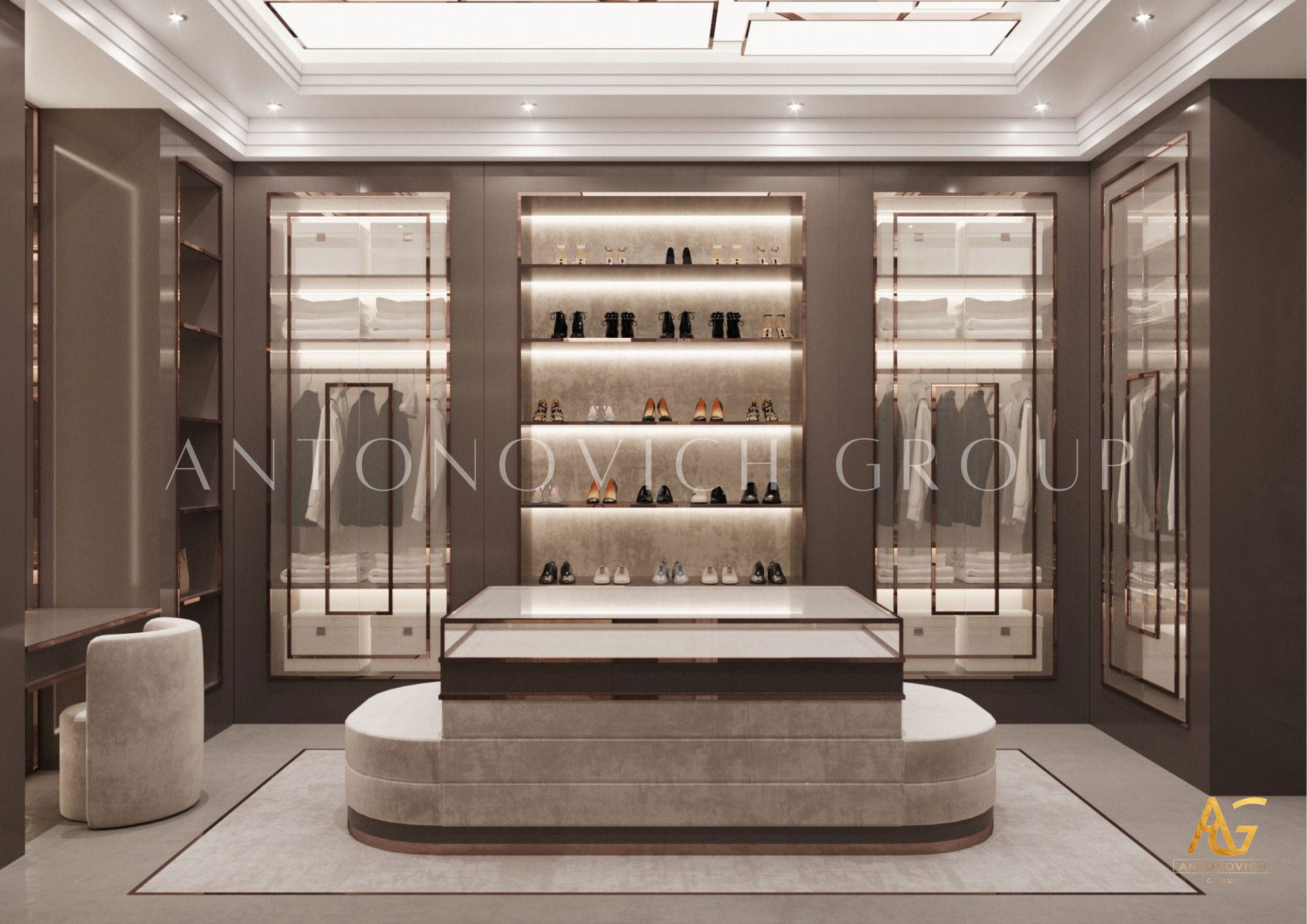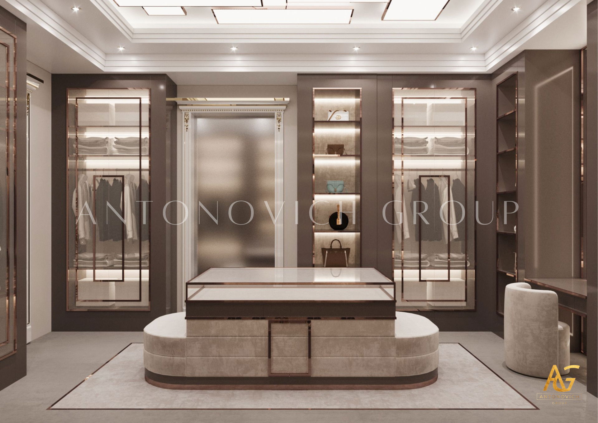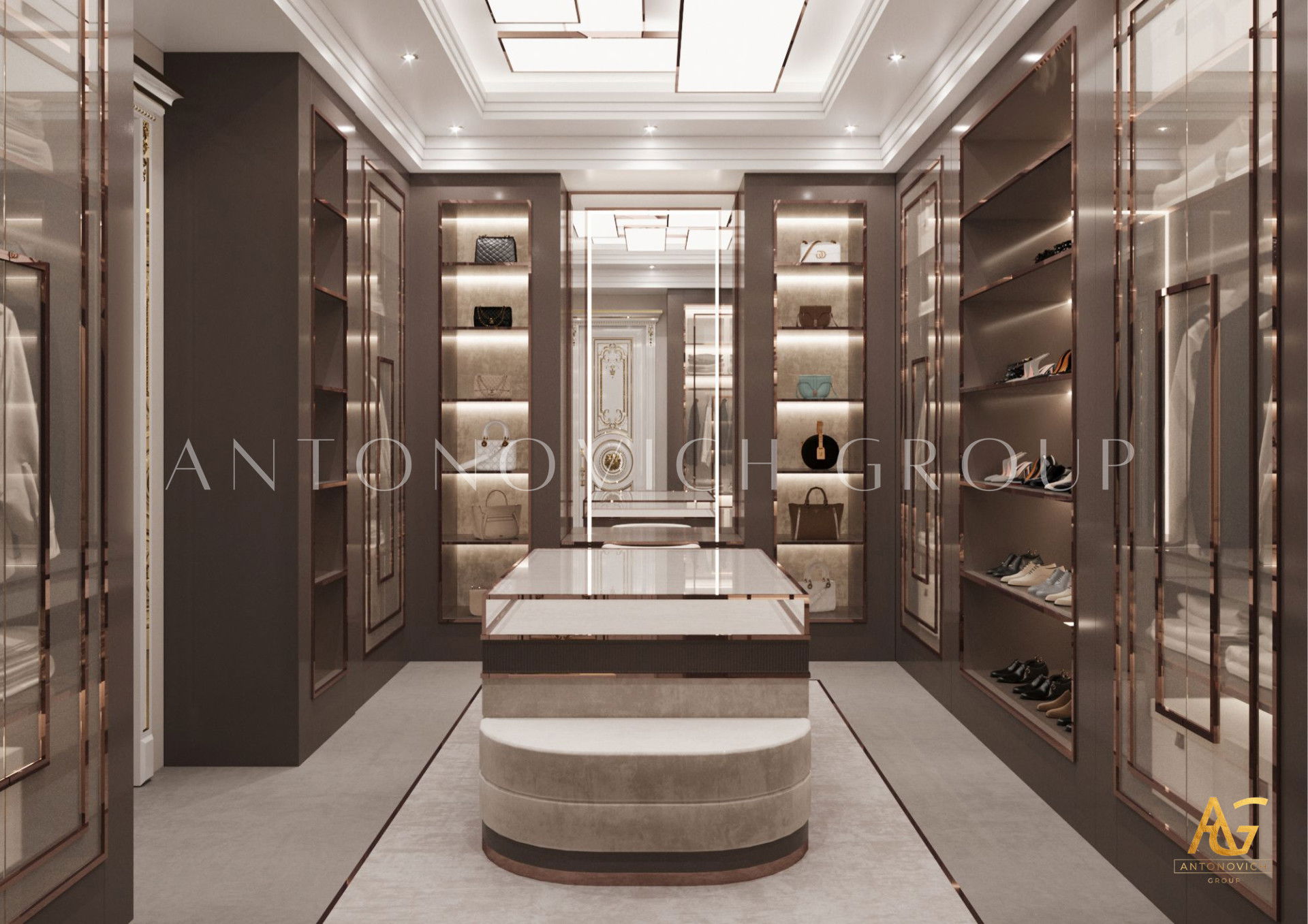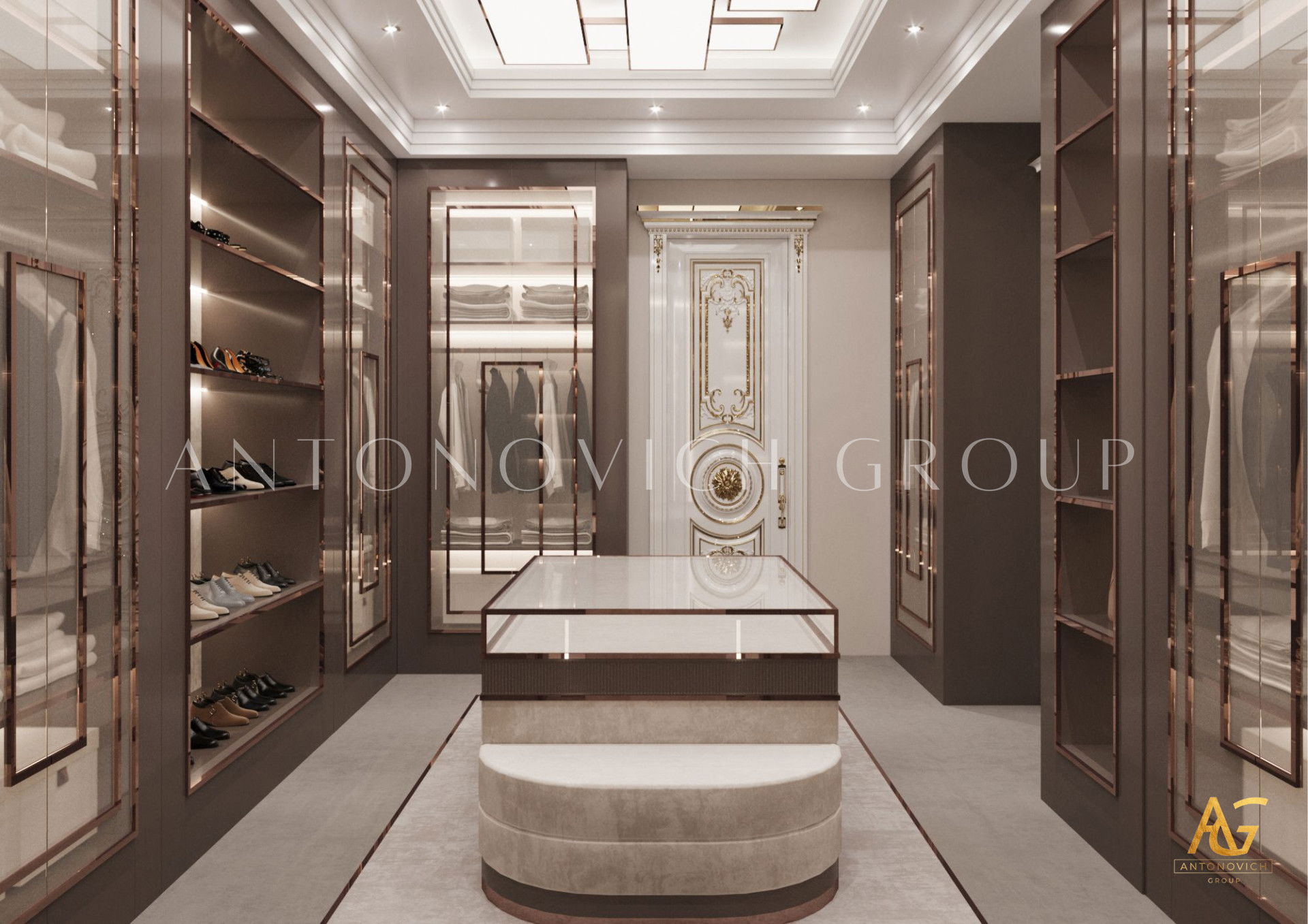 Многие мечтают о роскошной гардеробной. В этом проекте от Luxury Антонович Дизайн (Antonovich Design) роскошная гардеробная комната выполнена идеально: продуманные предметы мебели и идеальный гардеробный шкаф с ящиками обеспечивают порядок и удобство. В гардеробной с большим зеркалом вы сможете примерять повседневные образы с классом и элегантностью. Одеваться здесь вам не составит труда — планировка оставляет достаточно пространства.