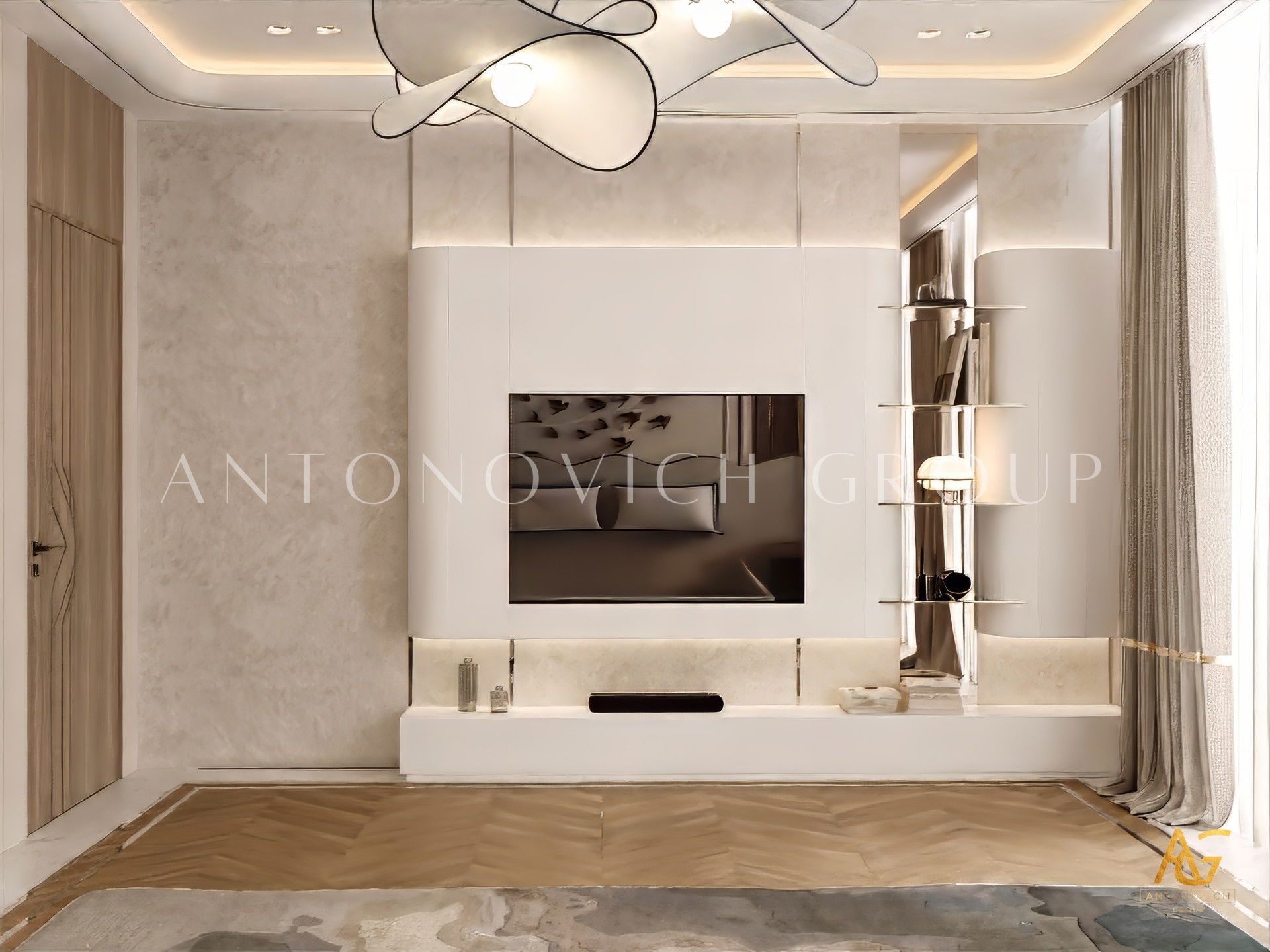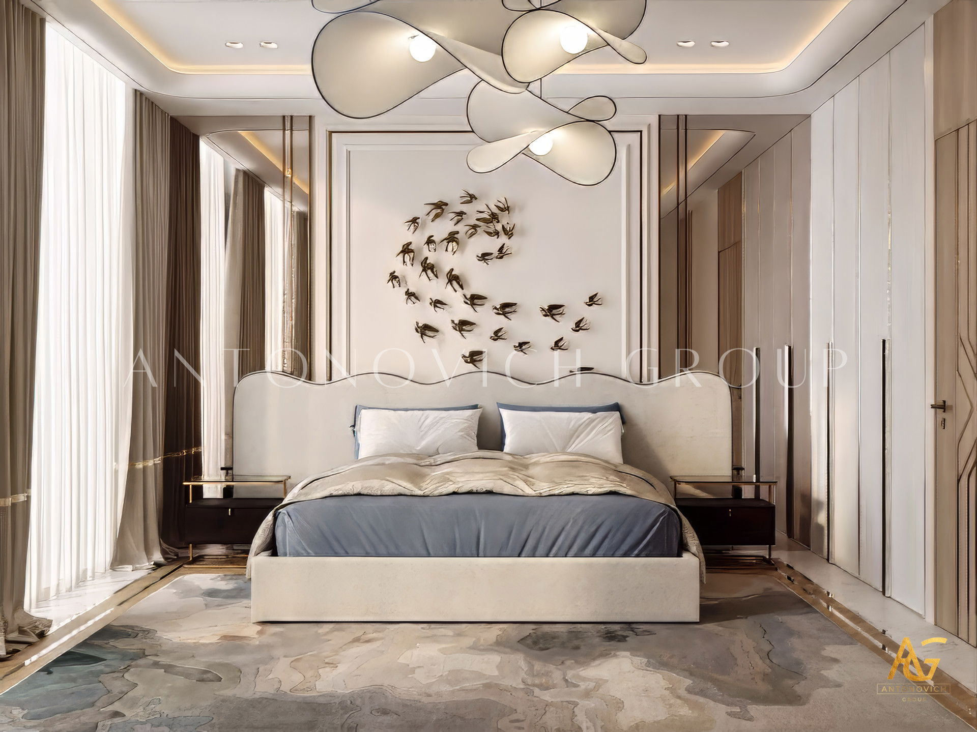 Это относительно небольшое пространство дизайнеры студии Антонович Дизайн (Antonovich Design) сумели превратить в уютный оазис для комфортной жизни — пример дизайн спальни для уютной жизни и прослеживается роскошный дизайн спальни, основанный на продуманной работе с фактурами и светом.