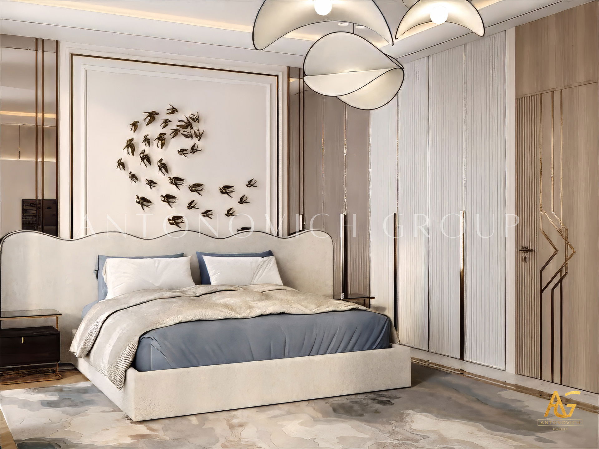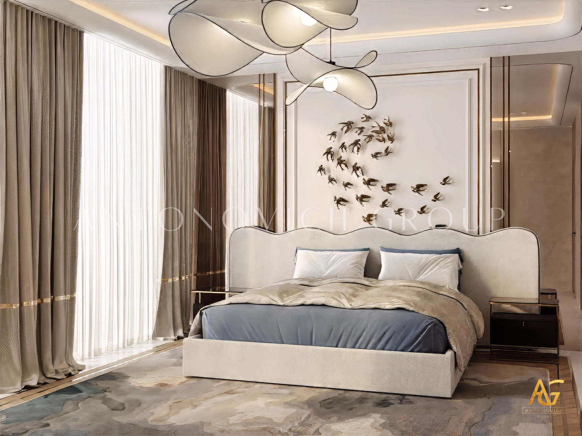 Знакомство с любым интерьером начинается с первого взгляда и первых эмоций. С первого взгляда эта спальня дарит приятное ощущение спокойствия — это пример дизайн интерьера спальни, где лёгкие черты неоклассики органично переплетены с современным стилем, формируя неоклассический дизайн спальни.