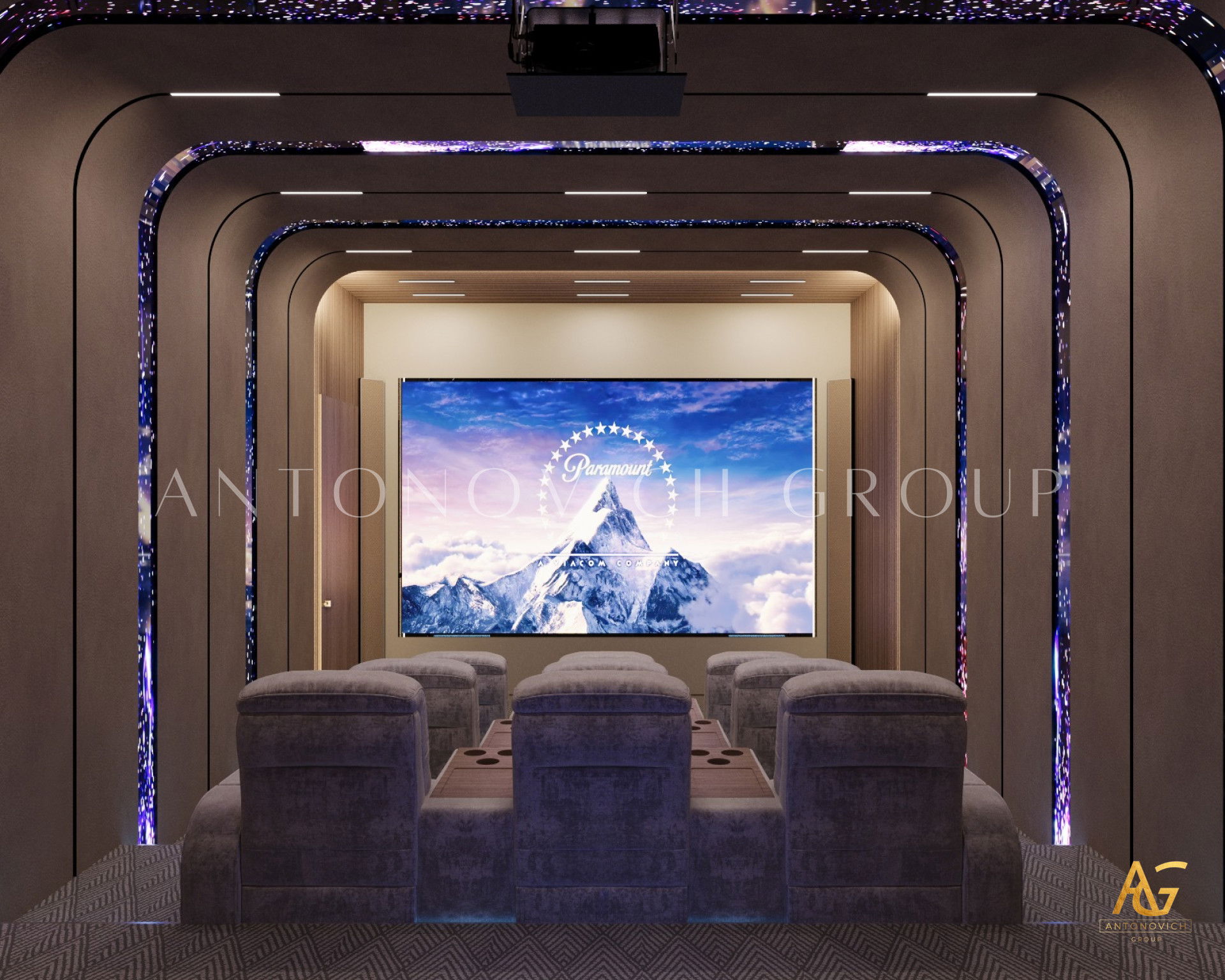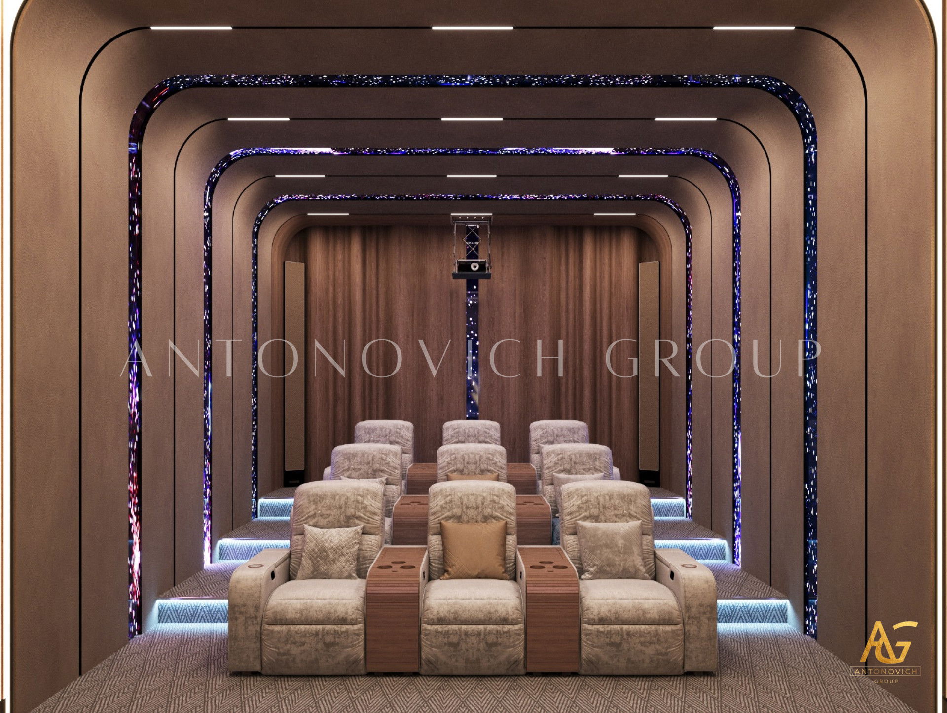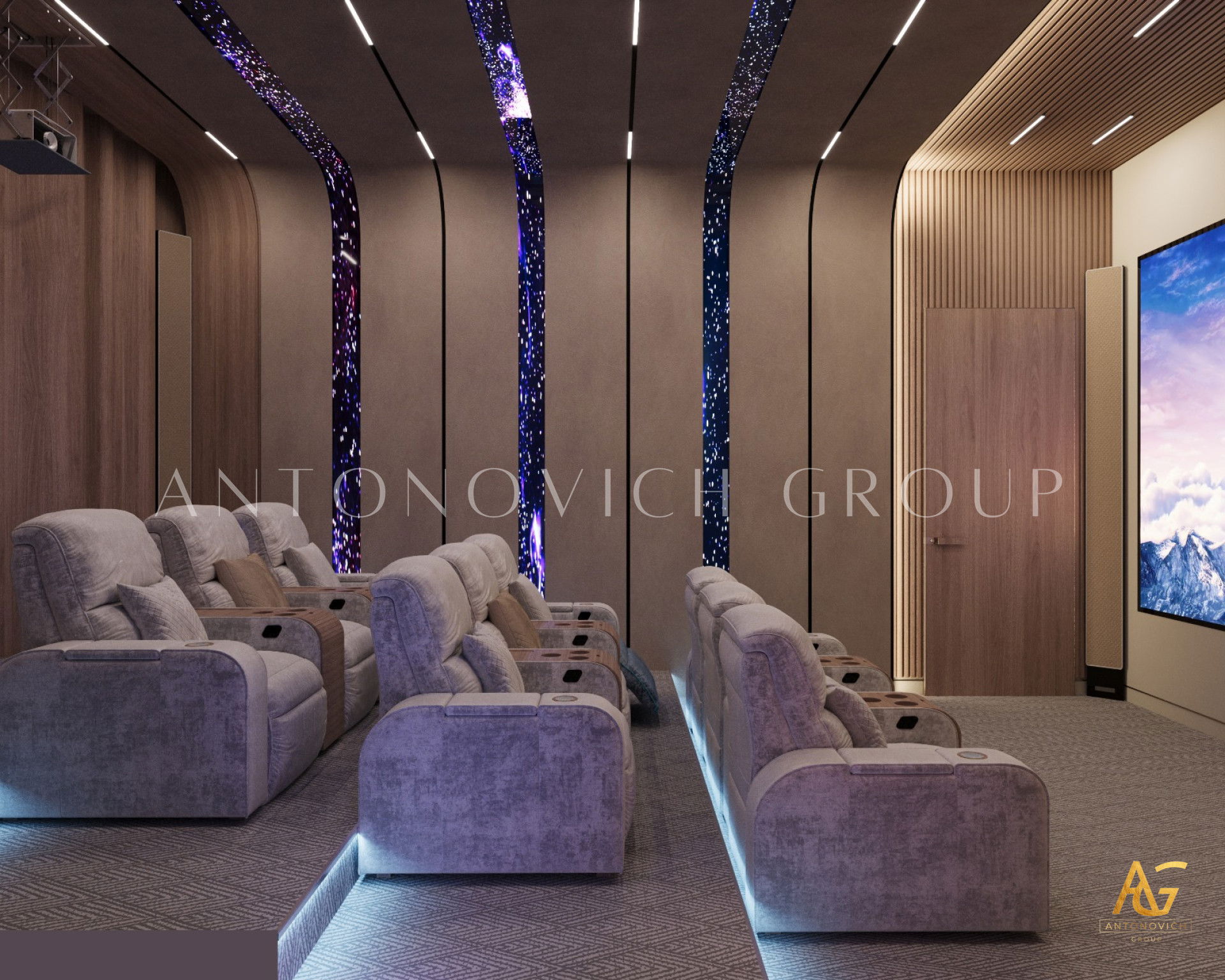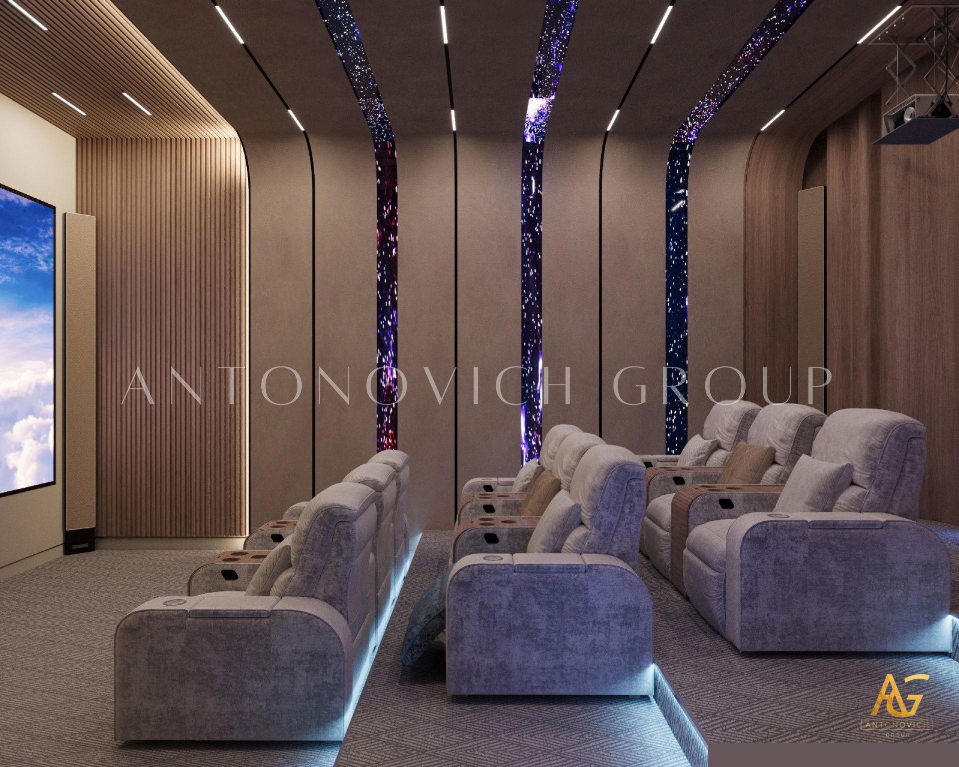 Мы оснащаем дом новейшими технологиями, создавая комфорт и удобство. Домашний кинотеатр уже не просто роскошь — это часть жизни. Сложность проектирования кинотеатра в доме в том, что необходимо учитывать отражение и поглощение звуковой волны и правильно расставить колонки для объёмного звучания. Студия Антонович Дизайн (Antonovich Design) заботится о звукоизоляции помещения и гармонично сочетает внешний вид интерьера с техническими требованиями.