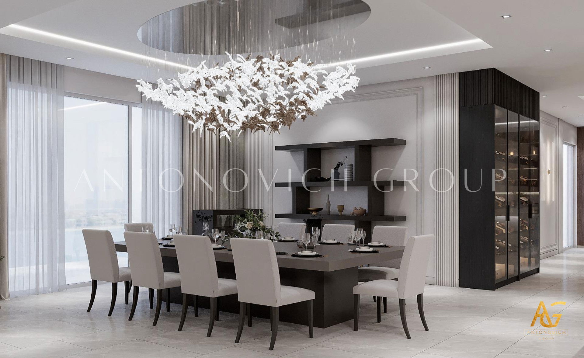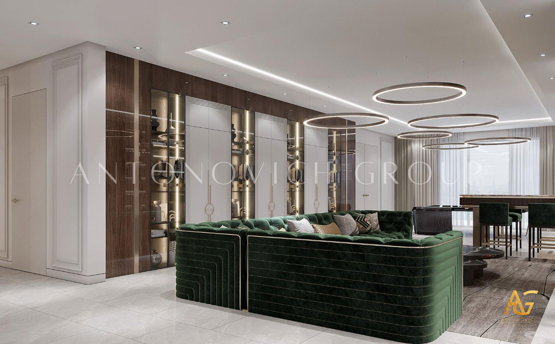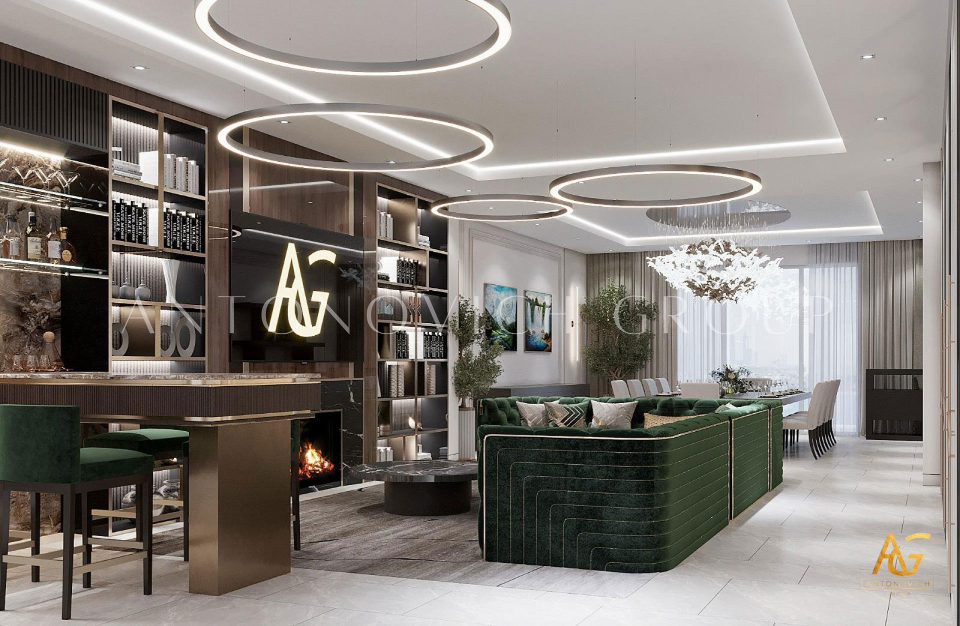 Открытость миру и гостеприимный характер владельца полностью отразились в интерьере. Эти черты дизайнеры и архитекторы студии Антонович Дизайн (Antonovich Design) заложили ещё на этапе проектирования элитного дома. По проекту здание заполнилось большими просторными помещениями с высокими потолками. В этом решении классический дизайн с современными мотивами обрел новое, свежее дыхание: несколько традиций классики плавно переходят в современные акценты. Большая высокая потолочная гостиная с медальоном стала эпицентром красоты и роскоши проекта. Высокий потолок, украшенный изысканным лепным медальоном, и ниша на потолке обеспечивают визуальное расширение пространства нишей на потолке. Освещение интерьера — освещение с геометрической люстрой и потолочными светильниками, а также мягкая LED-подсветка — гостиная с мягкой LED-подсветкой. Стены отделаны кремовым раствором с шелковистой фактурой. Здесь видны пилястры со снежно-белым лепным декором и вставками из натурального мрамора. Это гостиная с мраморными панелями и картинами, а зеркальные вставки придают интерьеру глубину. Мягкая мебель в обивке из бархата серебристо-голубого оттенка гармонирует с высокими шторами — интерьер с бархатной обивкой диванов. В комнате есть традиционный очаг: гостиная с камином и светлым ковром. Светлый натуральный ковёр почти сливается со светлым мрамором и усиливает другие яркие акценты интерьера. Результат — роскошный дизайн гостиной.