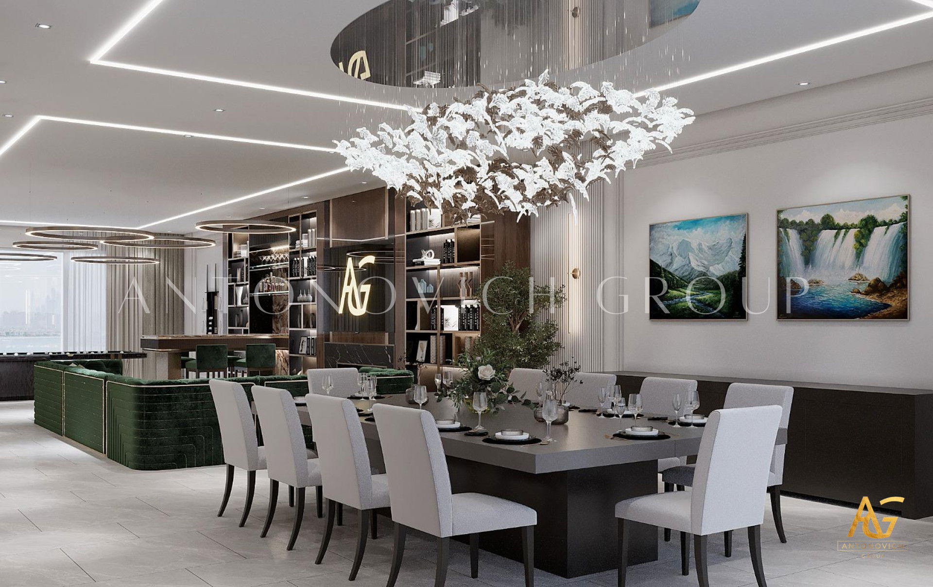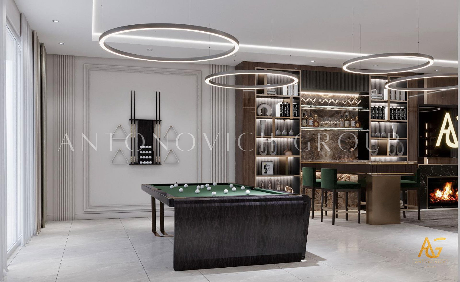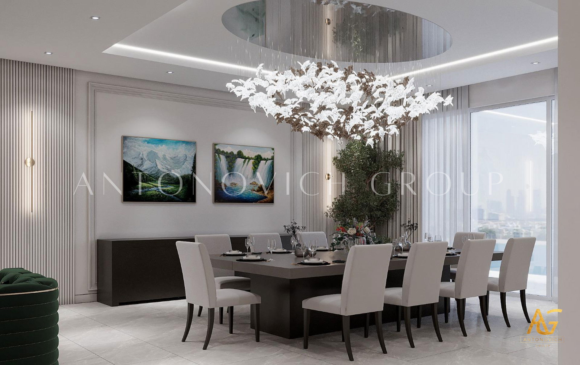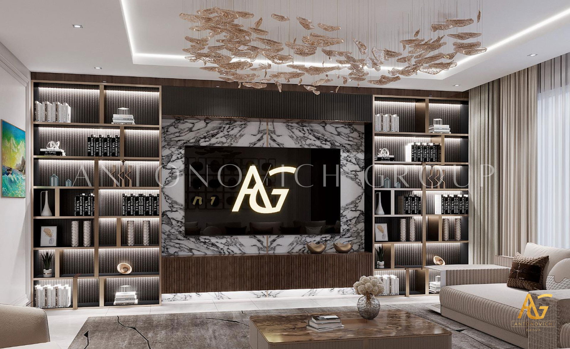 Открытость миру и гостеприимный характер владельца полностью отразились в интерьере. Эти черты дизайнеры и архитекторы студии Антонович Дизайн (Antonovich Design) заложили ещё на этапе проектирования элитного дома. По проекту здание заполнилось большими просторными помещениями с высокими потолками. В этом решении классический дизайн с современными мотивами обрел новое, свежее дыхание: несколько традиций классики плавно переходят в современные акценты. Большая высокая потолочная гостиная с медальоном стала эпицентром красоты и роскоши проекта. Высокий потолок, украшенный изысканным лепным медальоном, и ниша на потолке обеспечивают визуальное расширение пространства нишей на потолке. Освещение интерьера — освещение с геометрической люстрой и потолочными светильниками, а также мягкая LED-подсветка — гостиная с мягкой LED-подсветкой. Стены отделаны кремовым раствором с шелковистой фактурой. Здесь видны пилястры со снежно-белым лепным декором и вставками из натурального мрамора. Это гостиная с мраморными панелями и картинами, а зеркальные вставки придают интерьеру глубину. Мягкая мебель в обивке из бархата серебристо-голубого оттенка гармонирует с высокими шторами — интерьер с бархатной обивкой диванов. В комнате есть традиционный очаг: гостиная с камином и светлым ковром. Светлый натуральный ковёр почти сливается со светлым мрамором и усиливает другие яркие акценты интерьера. Результат — роскошный дизайн гостиной.