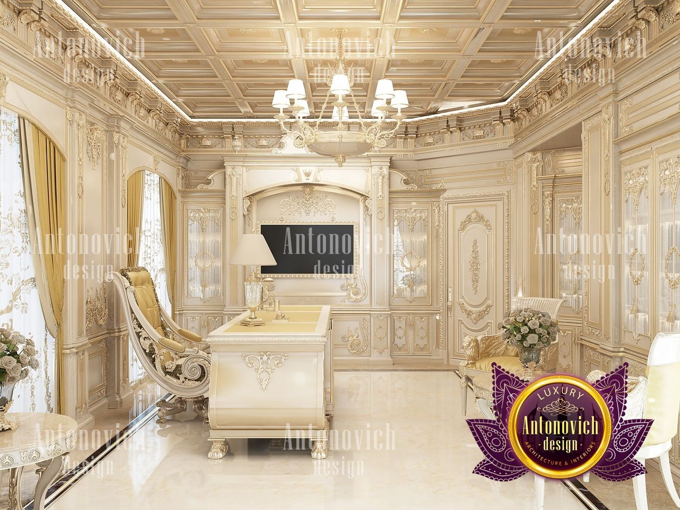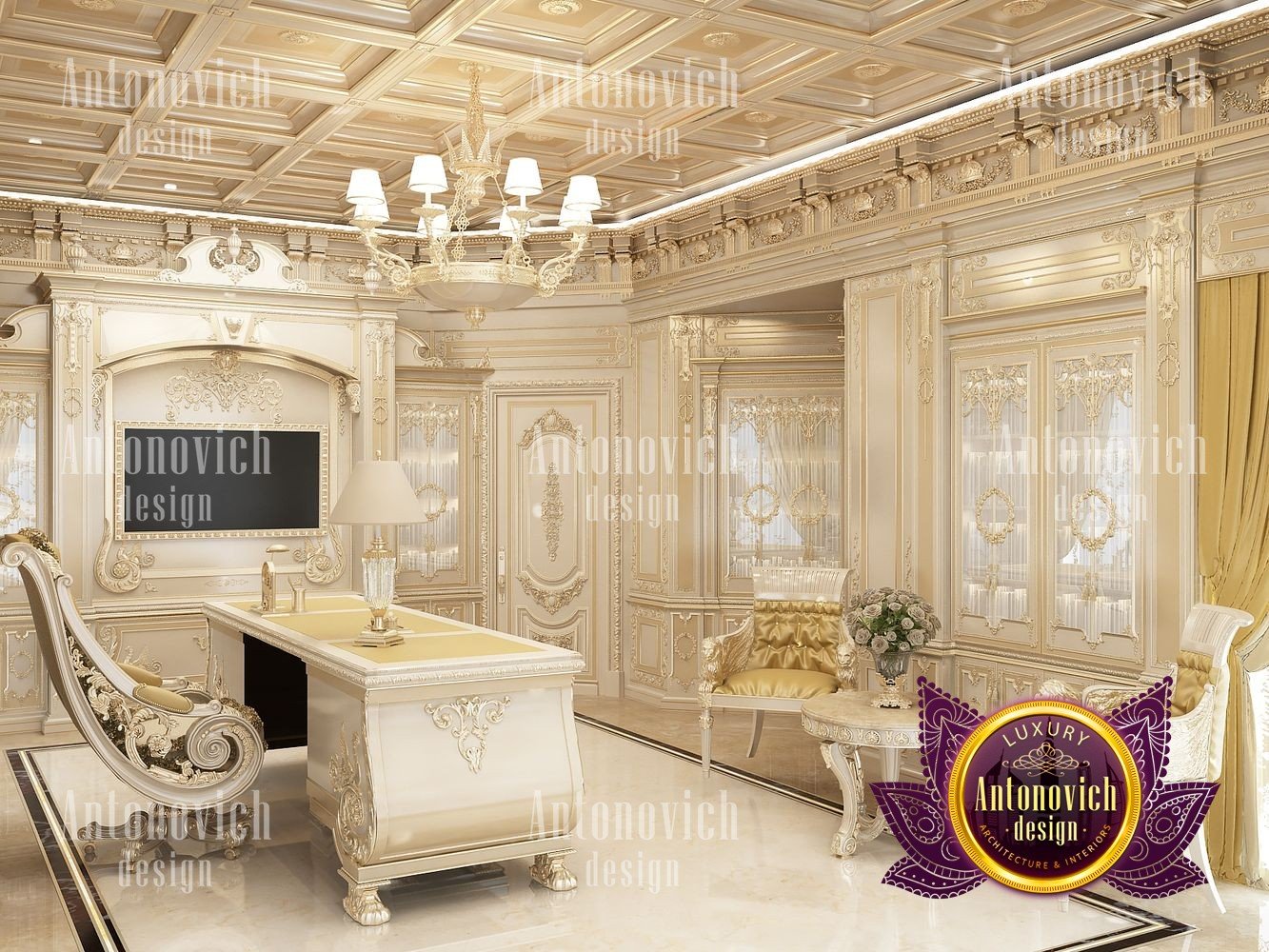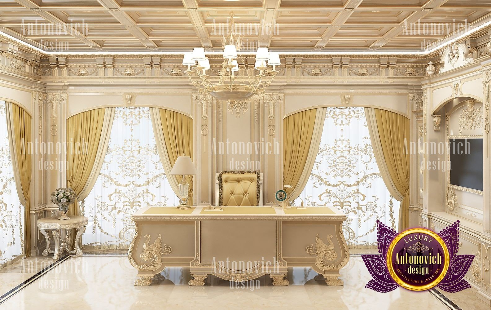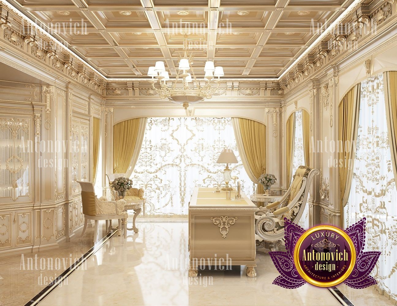 Путь к успеху всегда начинается с упорного труда, вдохновения и таланта. Здесь представлен дизайн офиса в Нигерии: роскошный дизайн офиса в Нигерии и классический интерьер офиса в Нигерии, воплощённые в одном проекте. Для владельца этого пространства успех выражается в ежедневной работе над проектами. Чтобы каждая идея быстро оформлялась, чтобы деловые встречи проходили в нужной атмосфере, а рабочие и свободные минуты были максимально эффективны, владелец заказал проект элитный офис в частной вилле у одного из лучших дизайнеров мира, Катрин Антонович (Katrina Antonovich). Этот интерьер офиса для бизнесвумен учитывает все нюансы деловой жизни и статусных ожиданий. Эта талантливая бизнесвумен знает лучше всех, как важен интерьер офиса для побед и достижений. Главную роль в создании образа сыграл офисный интерьер с итальянской мебелью и декором из натурального дерева. В проекте использована мебель из редких пород дерева, а резная мебель с позолотой и офисный дизайн с деревянной отделкой придают пространству монументальность. В проекте кабинет в классическом стиле отсылает к эпохе Империи, и оформление кабинета в стиле Наполеона читается в деталях — кресла с резными фигурами золотых львов возвращают дух той эпохи. Всё в этом интерьере создано для успеха: витрины для документов и книг органично вписаны в общую композицию, а декор для премиального офиса дополнен изящной резьбой. Домашний уют и комфорт добавляют красивые классические шторы.
