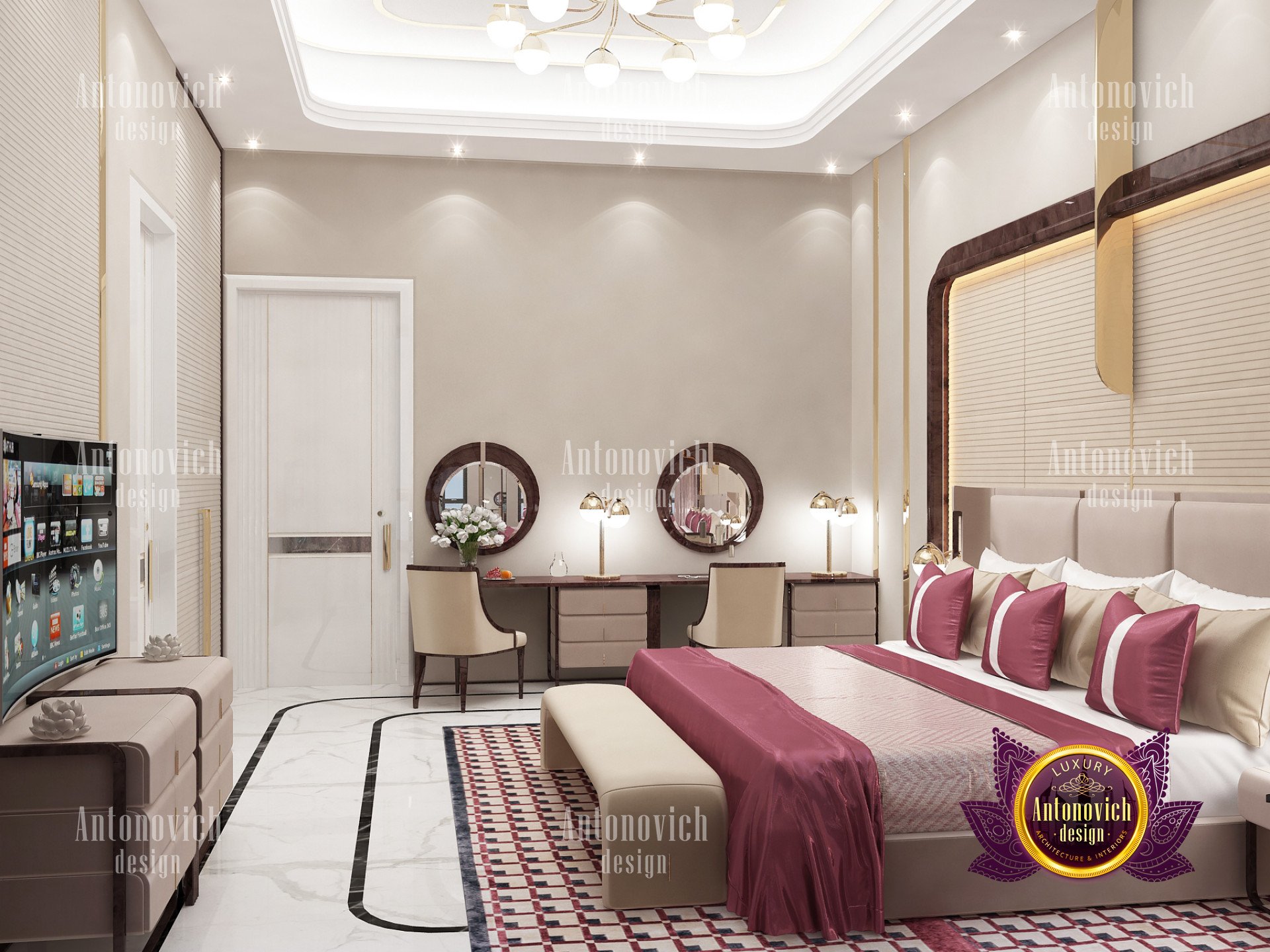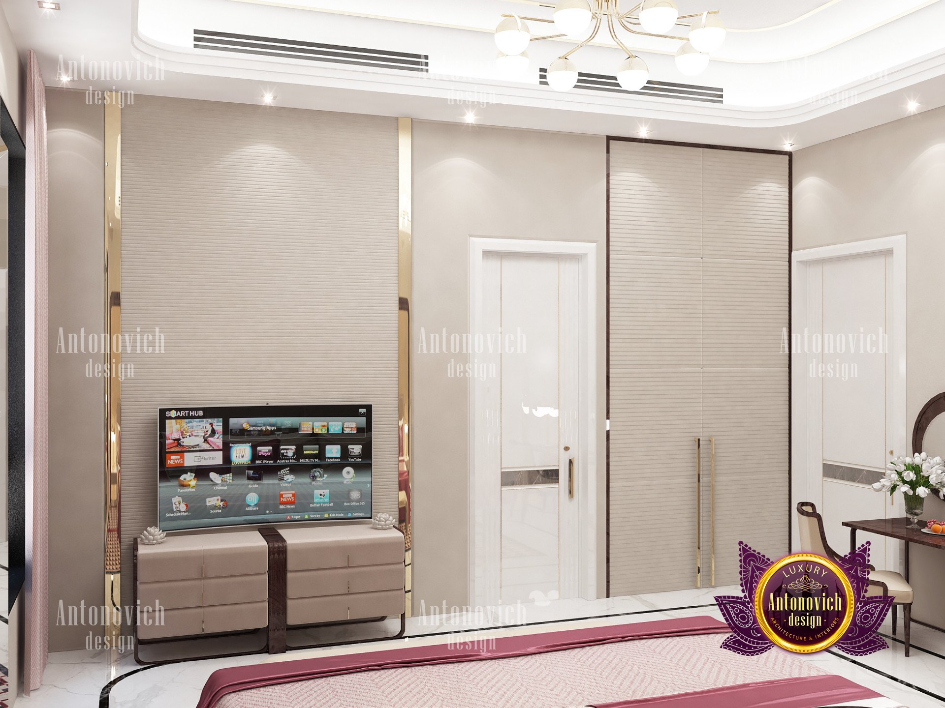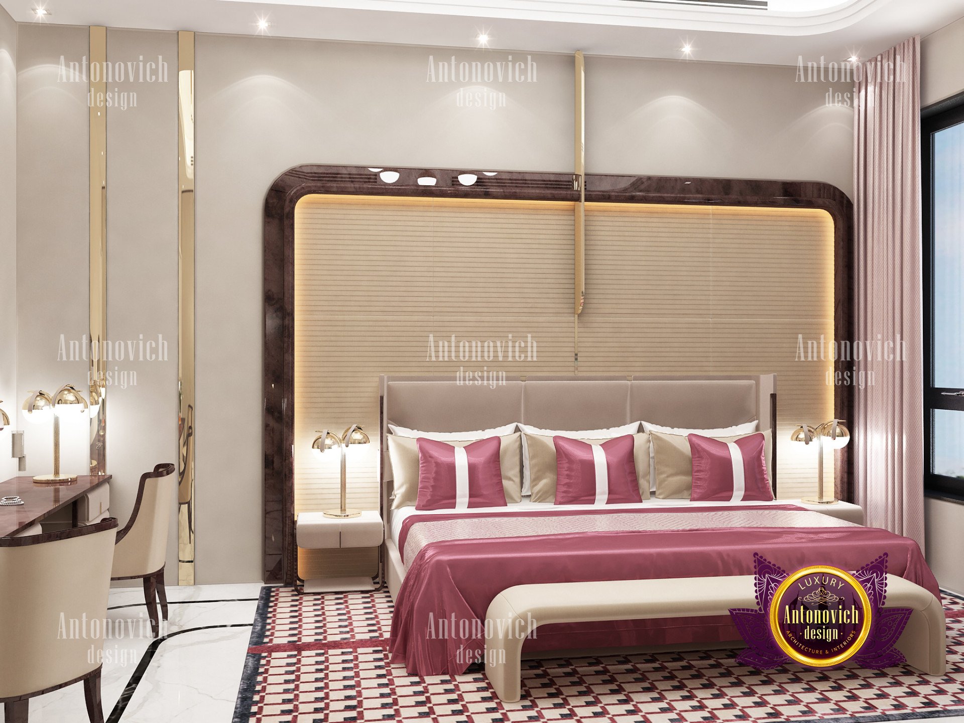 Этот проект — дизайн яркой спальни для виллы, реализованный командой Антонович Дизайн (Antonovich Design), подтвердил способность выполнять самые сложные решения в престижных проектах. Этот яркий интерьер спальни создан посредством тщательного подбора наиболее привлекательной мебели и материалов, что делает его похожим на гостиничную спальню. Подушки и постельное бельё — текстиль ярко-розового и бежевого оттенка в блестящем шёлке. Элегантность изголовья кровати подчеркнута роскошной стеновой панелью и декором из материалов премиум-класса. В проекте использована мебель для спальни премиум-класса, а стены с декоративными панелями премиум-класса подчёркивают статус комнаты. Помимо привлекательных прикроватных тумб, применена эффектная LED-подсветка для создания уюта в спальне, которая делает пространство ещё более тёплым и комфортным. Входя в комнату, вы ощутите атмосферу спальни как в отеле с подсветкой.