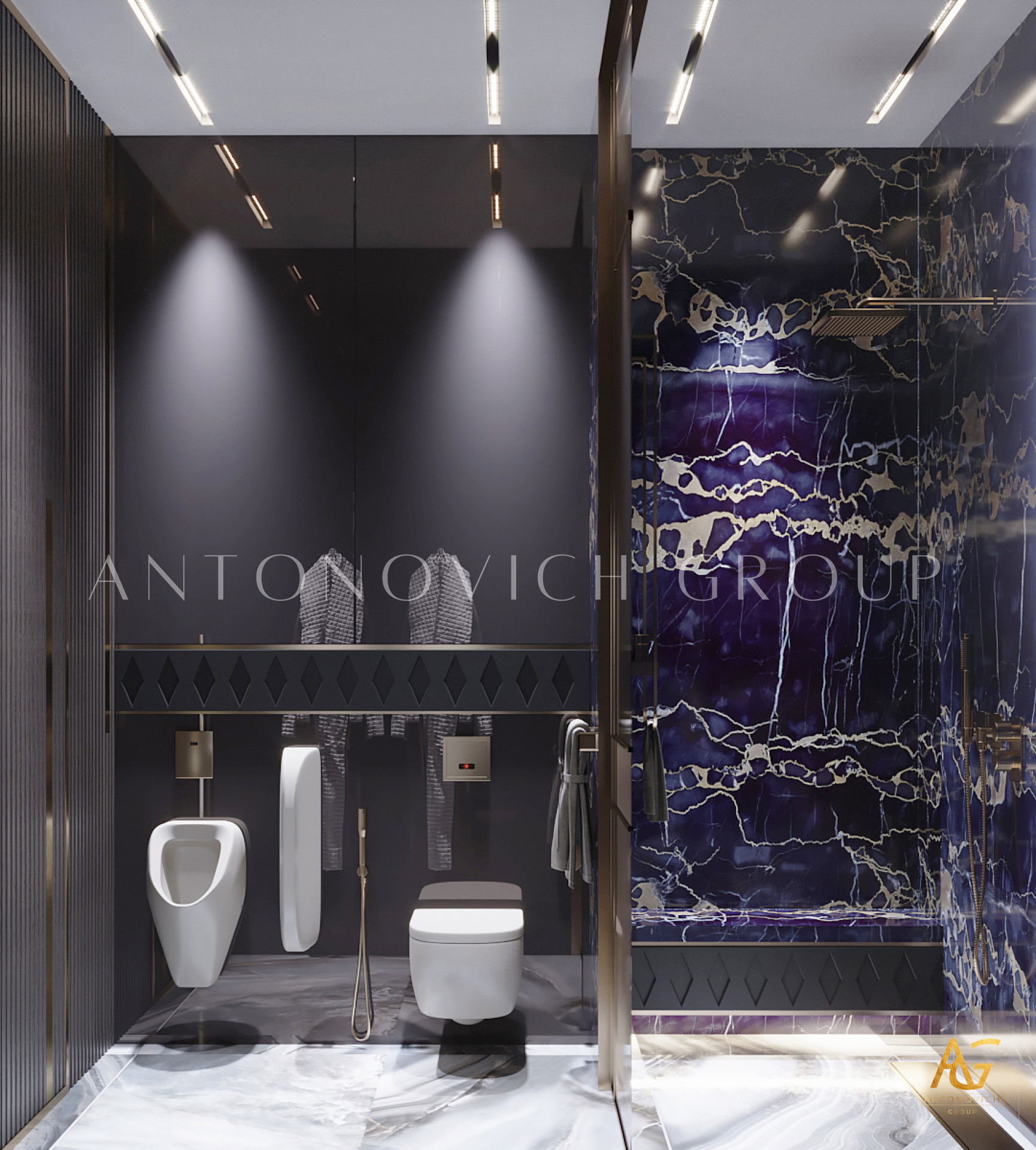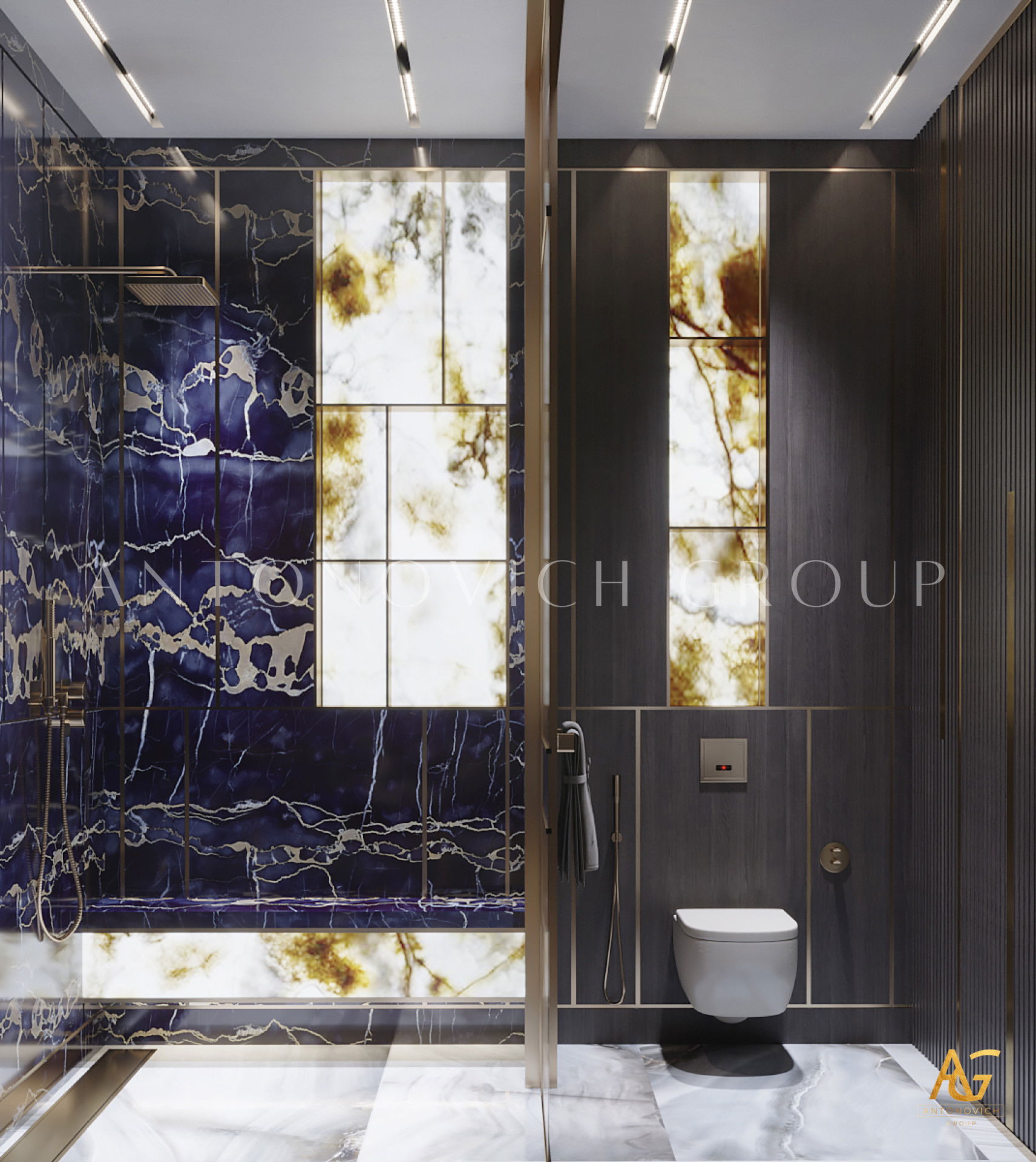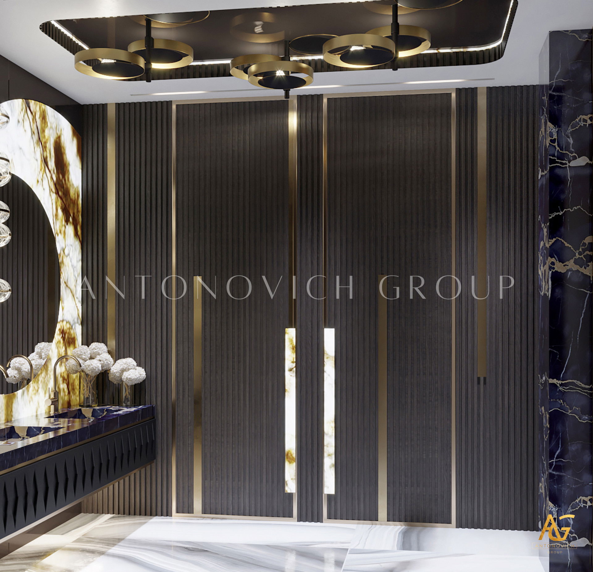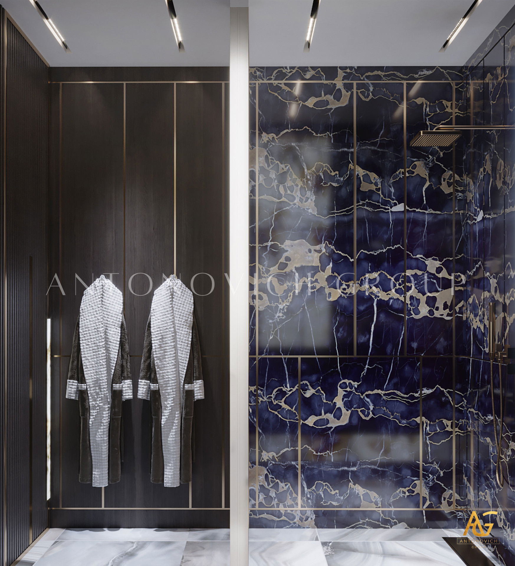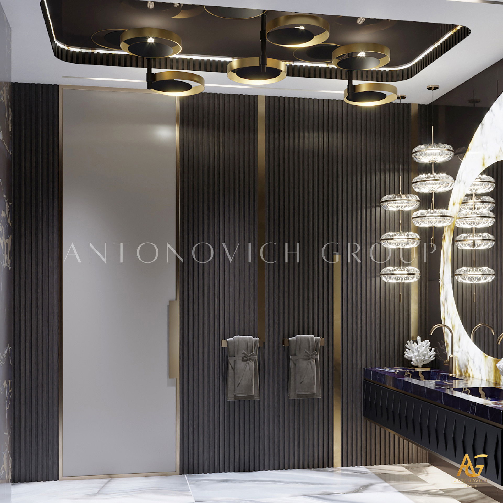 Идеи дизайнеров студии Антонович Дизайн (Antonovich Design) не перестают удивлять и радовать клиентов своей уникальностью и красивыми решениями. В этом проекте дизайн ванной комнаты воплощён как истинная королевская роскошь. Это роскошный дизайн ванной комнаты, где каждая деталь продумана. Проект выполнен как дизайн ванной комнаты в стиле люкс. Когда к подиуму с красивой лестницей и кованой балюстрадой ведёт путь к ванной, интерьер приобретает торжественный характер. Этот приём стал возможен благодаря очень обдуманной организации пространства. В практически обычной комнате с окном специалистам удалось создать королевский оазис. Предлагаем рассмотреть главную зону подробнее. На подиуме установлена снег-белая овальная ванна — ванная комната с овальной ванной. Это проект ванной комнаты с подиумом. Ванная с мозаичной отделкой размещена по периметру подиума. Подиум облицован светло-коричневым мрамором — мраморная отделка ванной комнаты подчёркивает её статус. Небольшая лестница с очень красивой кованой балюстрадой ведёт к ванне, поэтому это дизайн ванной с кованой балюстрадой особенно эффектен. Две высокие прямоугольные консоли украшены шторами из натурального шелка бронзового цвета с особой пропиткой. Шторы из натурального шелка с двусторонней основой собраны в идеально ровные складки и мягко приподняты, открывая бледно-молочный лицевой слой. В декоре стен предложены две зеркальные панели, которые отражаются друг в друге. Комфорт организован с помощью открытых полок с подсветкой, на которых хранятся косметика и аксессуары. Эта элегантная и торжественная красота увенчана небольшая потолочная ниша с люстрой. Сочетание золотой и жемчужной мозаичной плитки в отделке стен придаёт интерьеру ванной комнаты чарующую выразительность.