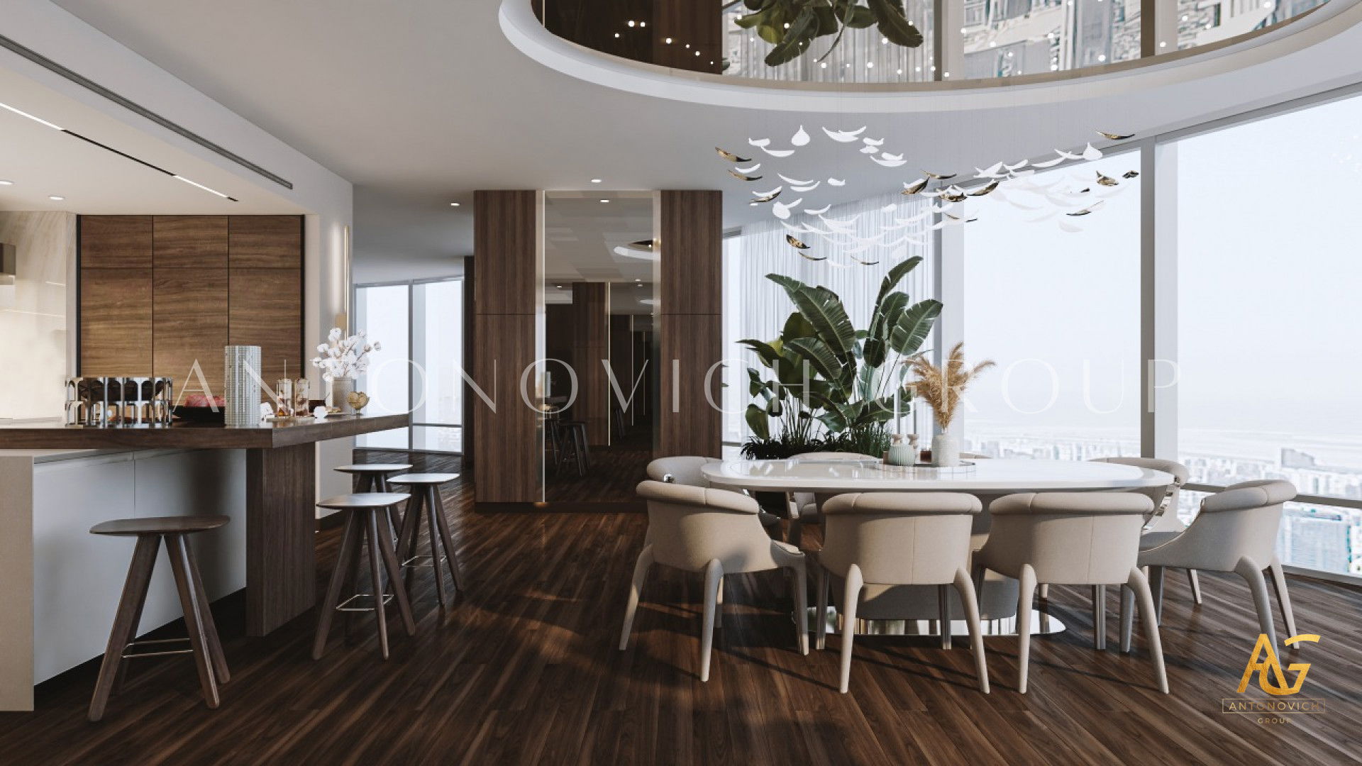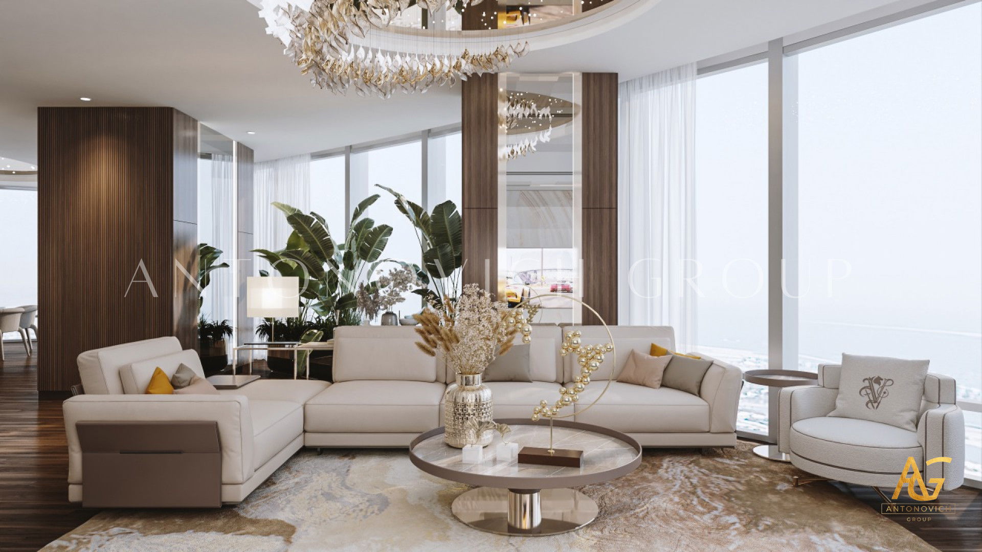 Это масштабный проект роскошного жилья в Бурдж-Халифа от Антонович Дизайн (Antonovich Design). дизайн квартиры в Бурдж-Халифа был построен вокруг идеи величия и комфорта: простор позволил дизайнерам раскрыть творческий замысел. Центром этой впечатляющей резиденции стала сферическая гостиная. Пол украшен отделка пола мрамором и декоративной резьбой. Потолок венчает крупная хрустальная люстра с каскадом подвесок. Крупные сферические колонны ярких оттенков сформировали фокусный элемент интерьера гостиной.