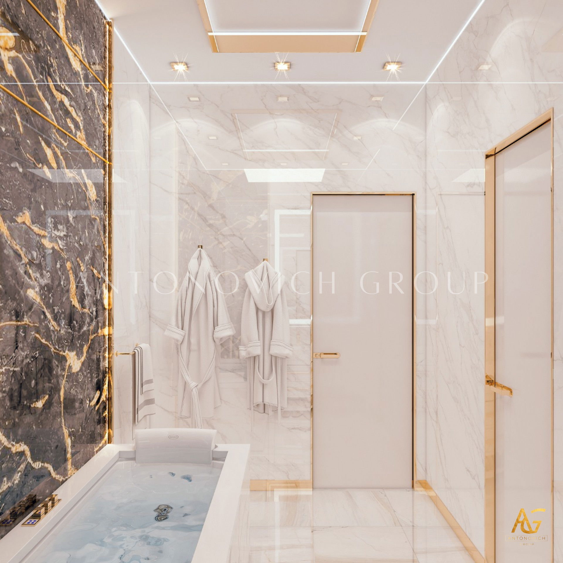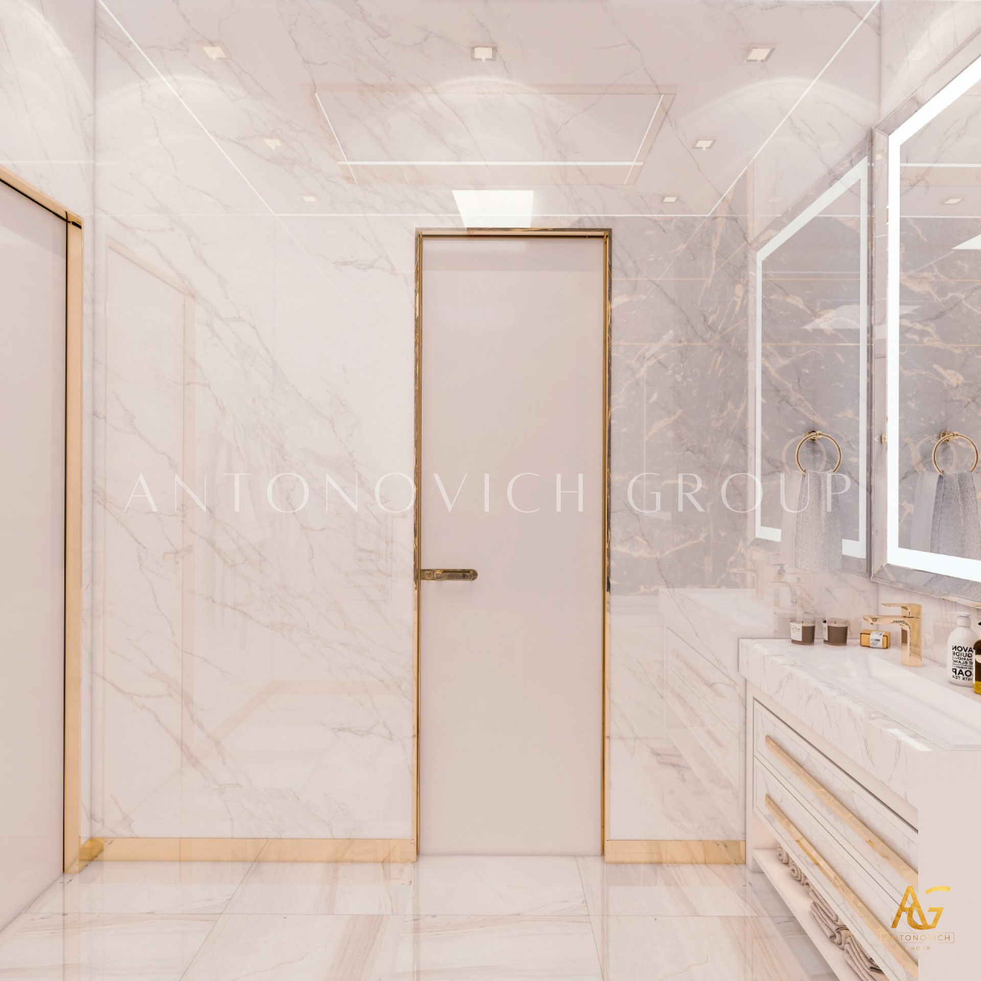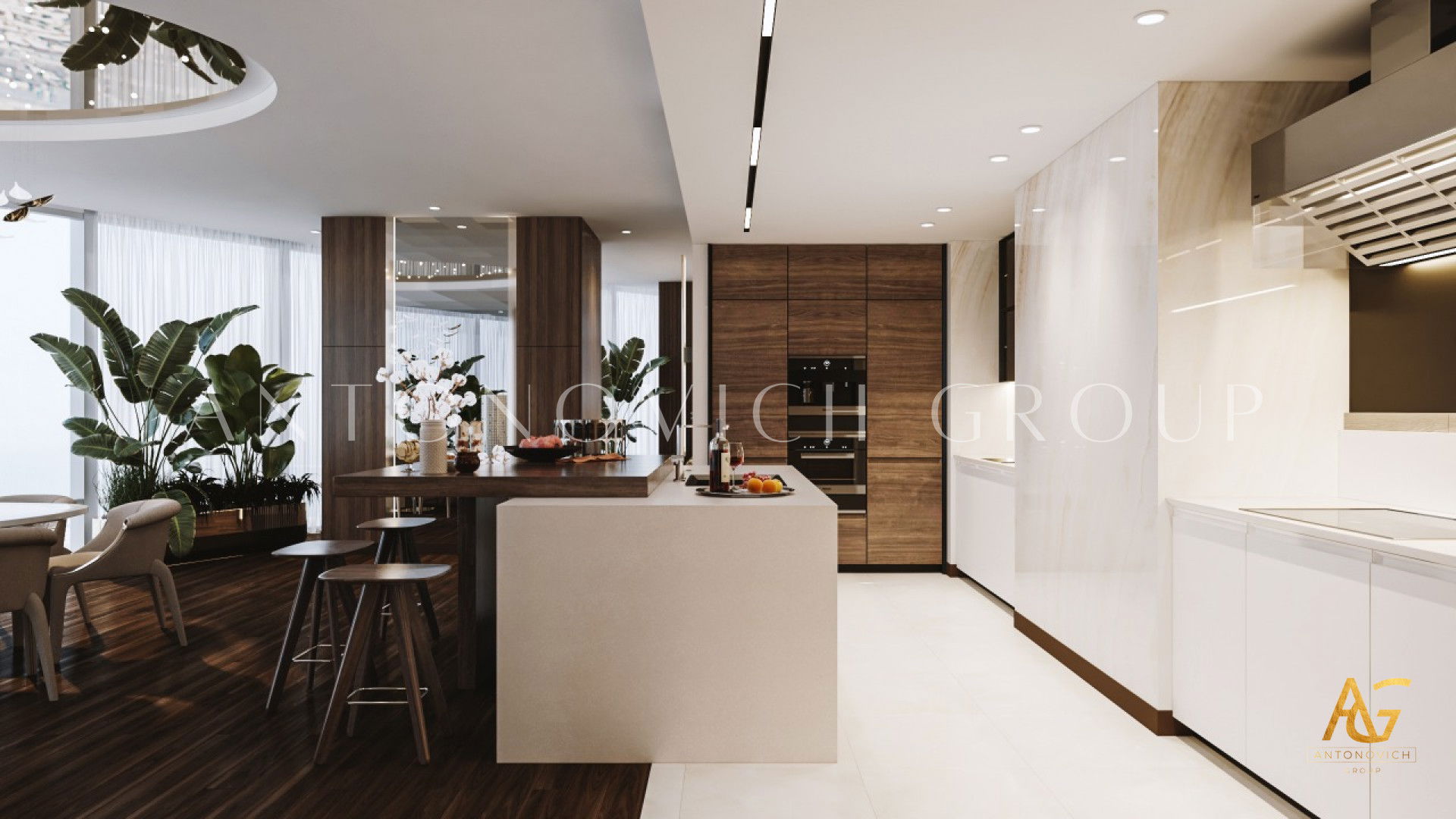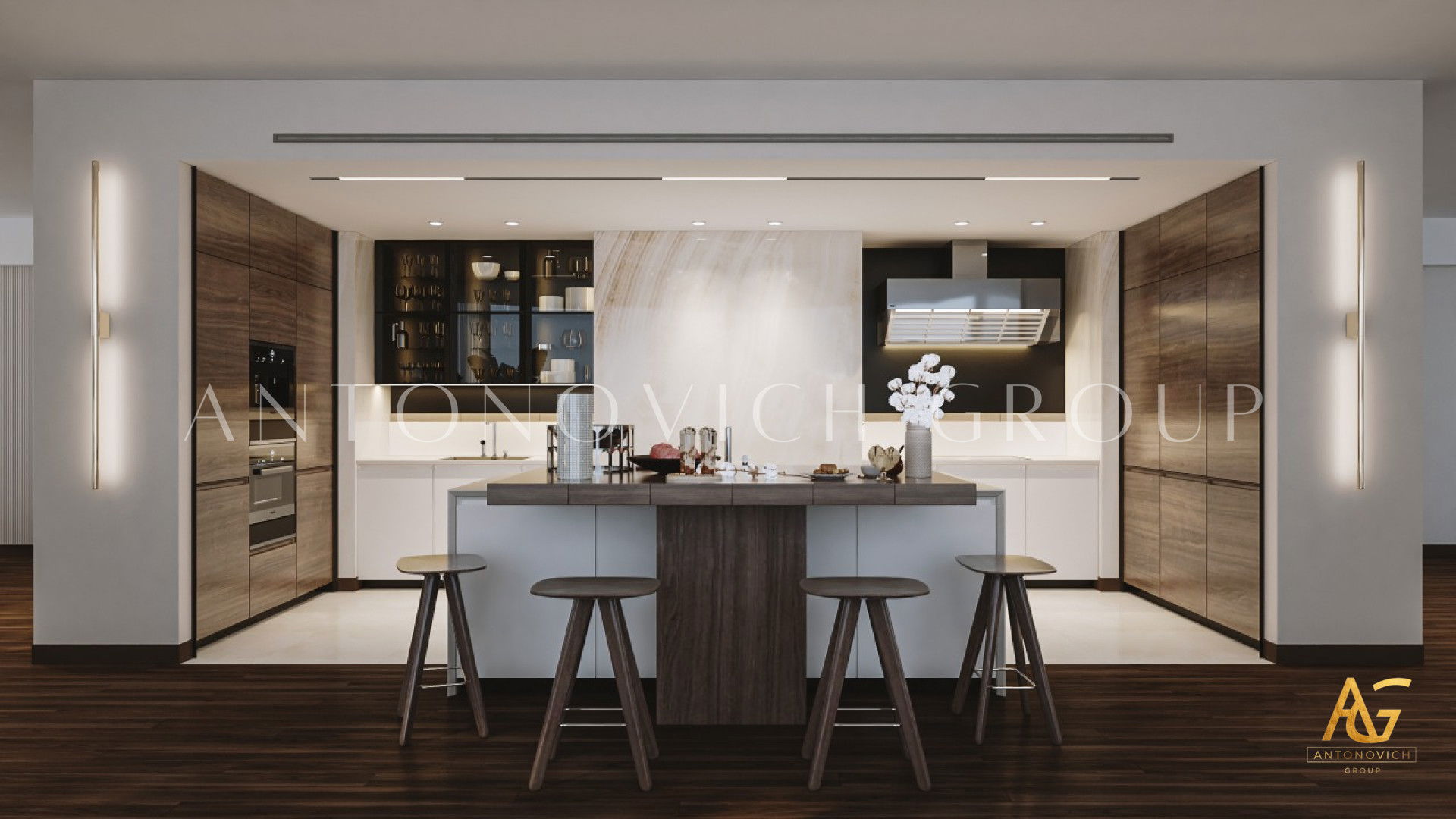 Антонович Дизайн основан на идее создания идеальной атмосферы для каждого клиента. Оформление интерьера в стиле современной роскоши заметно в каждом решении. Авторы проекта грамотно отражают стремление к открытому пространству, присущему привлекательным домам. Интерьер совмещает узнаваемые декоративные элементы и смелые прийомы в подсветке. Гостиная соединена с фантастической столовой зоной и кухней. Дизайнеры предложили оригинальные концепты — встроенные перегородки с аквариумом для гостиной, которые отделяют пространство, не лишая его воздуха. В доме царит тёплая и радостная атмосфера.