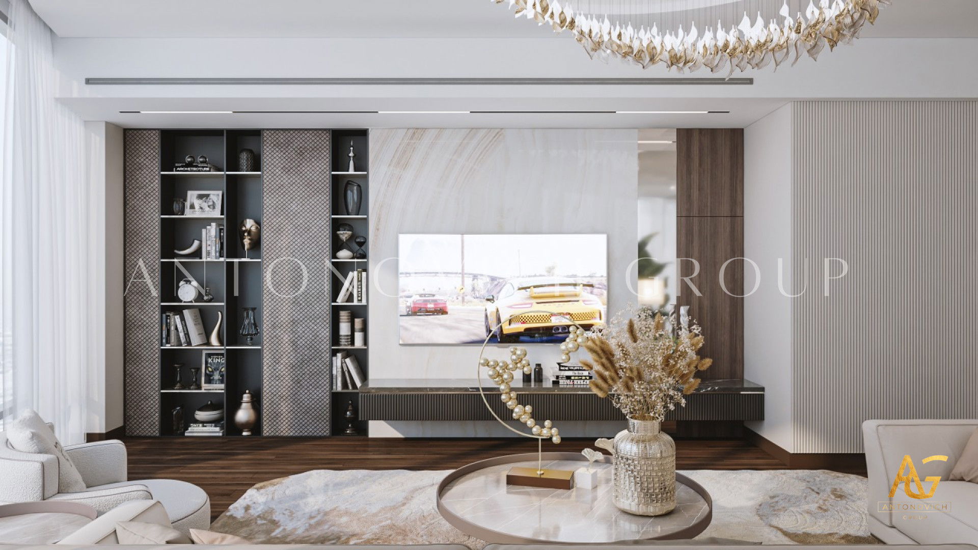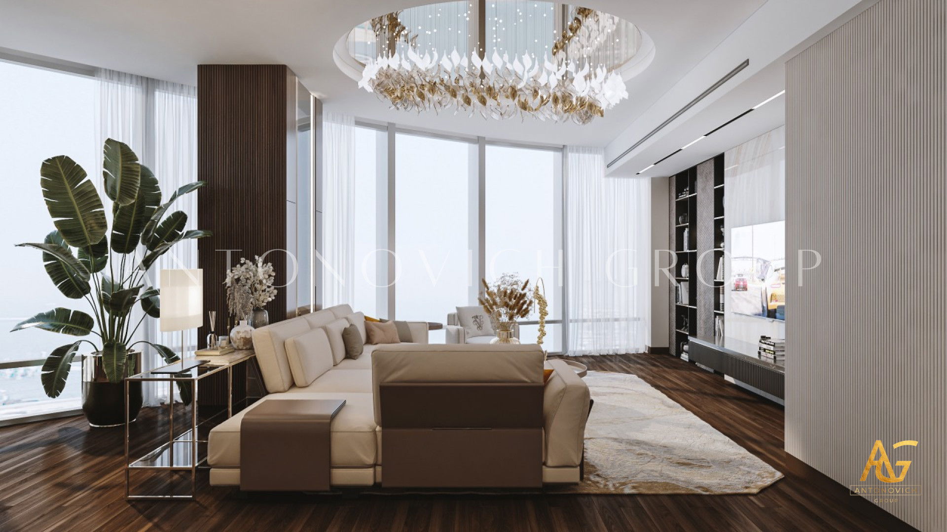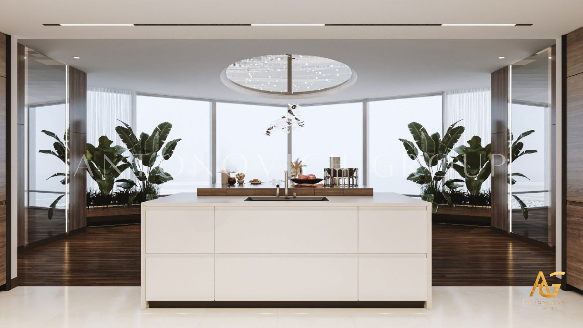 Антонович Дизайн основан на идее создания идеальной атмосферы для каждого клиента. Оформление интерьера в стиле современной роскоши заметно в каждом решении. Авторы проекта грамотно отражают стремление к открытому пространству, присущему привлекательным домам. Интерьер совмещает узнаваемые декоративные элементы и смелые прийомы в подсветке. Гостиная соединена с фантастической столовой зоной и кухней. Дизайнеры предложили оригинальные концепты — встроенные перегородки с аквариумом для гостиной, которые отделяют пространство, не лишая его воздуха. В доме царит тёплая и радостная атмосфера.