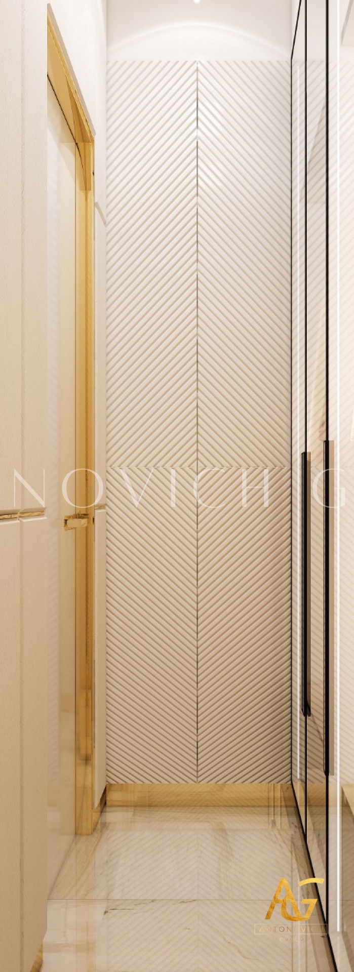 Эта часть интерьера задаёт ощущение защищённости и монументальности, а приятное знакомство начинается в роскошной прихожей. Впечатляющий геометрический рисунок на полу повторяется в элегантном настенном декоре. Яркие акценты в оформлении прихожей переросли в роскошную мебель футуристического характера. Мотив потолочного оформления продолжается на полу в гостиной. Полукруглый вход с окном украшен воздушными шторами — шторы и текстиль ручной работы для апартаментов. Полукруглые диваны в бархатной молочной обивке идеально вписываются в образ релакса и роскоши. В оформлении кухни прослеживается величие и сдержанная благородность.