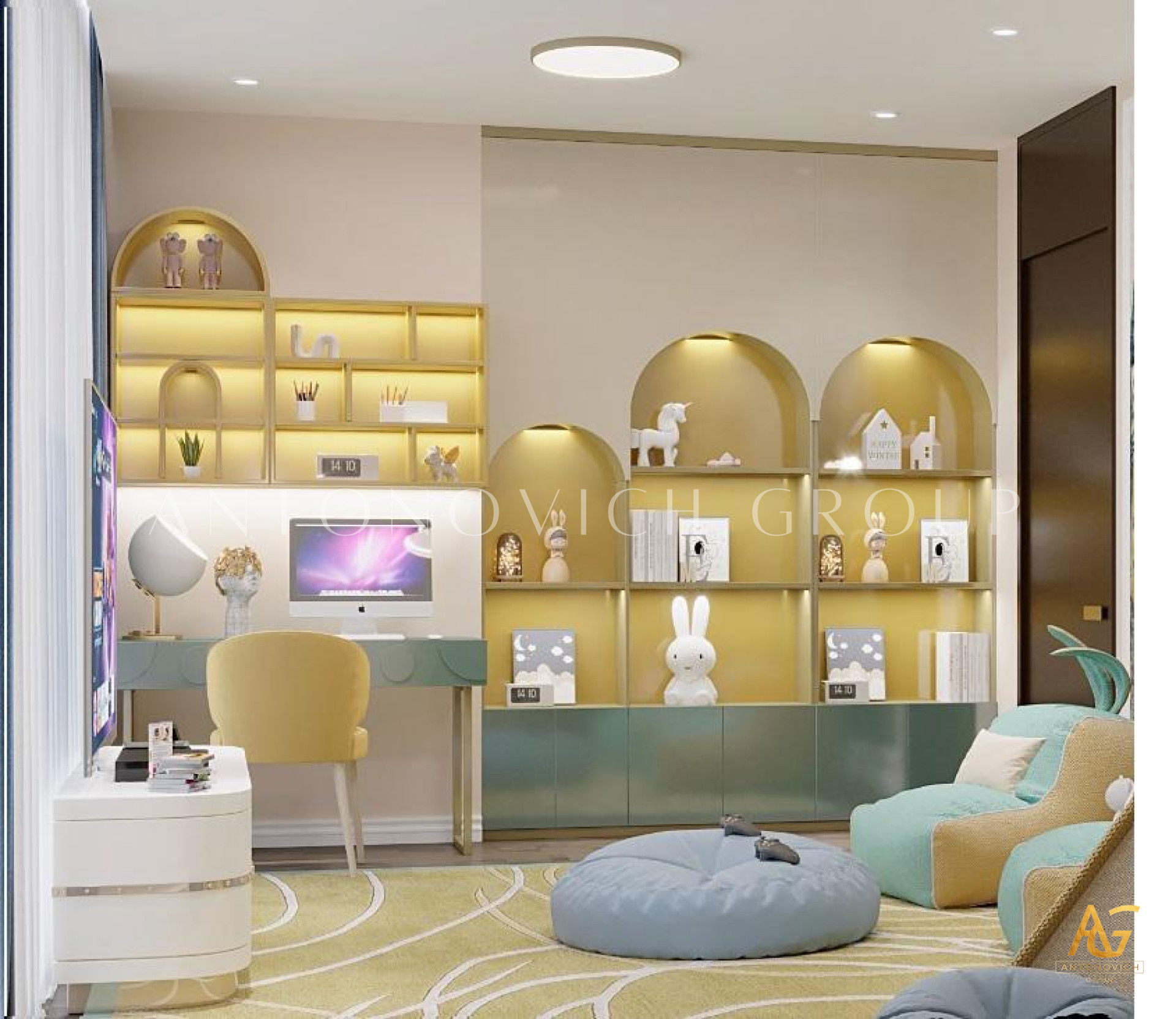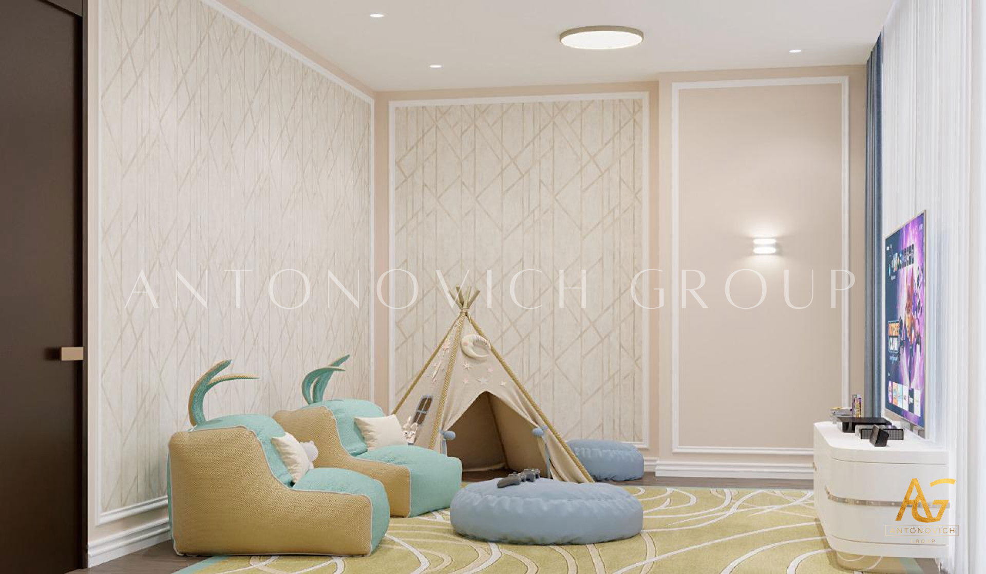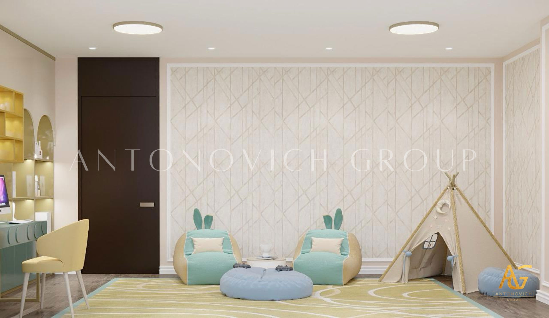 Прекрасная студия интерьерного дизайна в Дубае восхищает своей уникальной красотой. Этот роскошный интерьер детской комнаты так же прекрасен и очарователен, как и юная владелица. Интерьер очаровывает нежностью и теплотой. Приятные оттенки кремового, персикового, розового и молочного создают удивительное ощущение тепла летнего утра. Дизайн детской комнаты универсален и подходит для эффектных решений. Дизайн одновременно сложен и включает изысканные детали и гармоничное сочетание цветов и текстур. Потолок с нишами и подсветкой оформлен очертаниями бабочек и подсвечен линиями синего света. Роскошная люстра с прожекторами дополняет освещение. Удобная кровать с высоким изголовьем дополнена прозрачным шелковым балдахином, собранным бантом и образующим мягкие складки драпировки. В оформлении окон использована роскошная персиковая шелковая отделка с розовой тканью, декор окон с крупными кистями придаёт интерьеру изысканность. Теплоту домашнего уюта создаёт натуральный деревянный пол и мягкий круглый молочный ковер. Дизайн детской комнаты для девочки идеален и очарователен. Особенности оформления: интерьер детской комнаты, роскошный интерьер детской комнаты, дизайн детской комнаты для девочки, потолок с нишами и подсветкой, кровать с высоким изголовьем, прозрачный шелковый балдахин, шелковая драпировка персикового цвета, натуральный деревянный пол, круглый молочный ковер, люстра с прожекторами, декор окон с крупными кистями, гармоничное сочетание цветов и текстур.