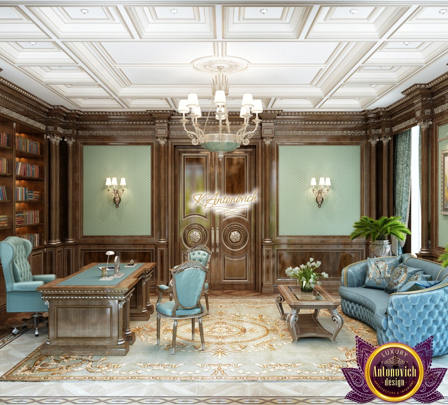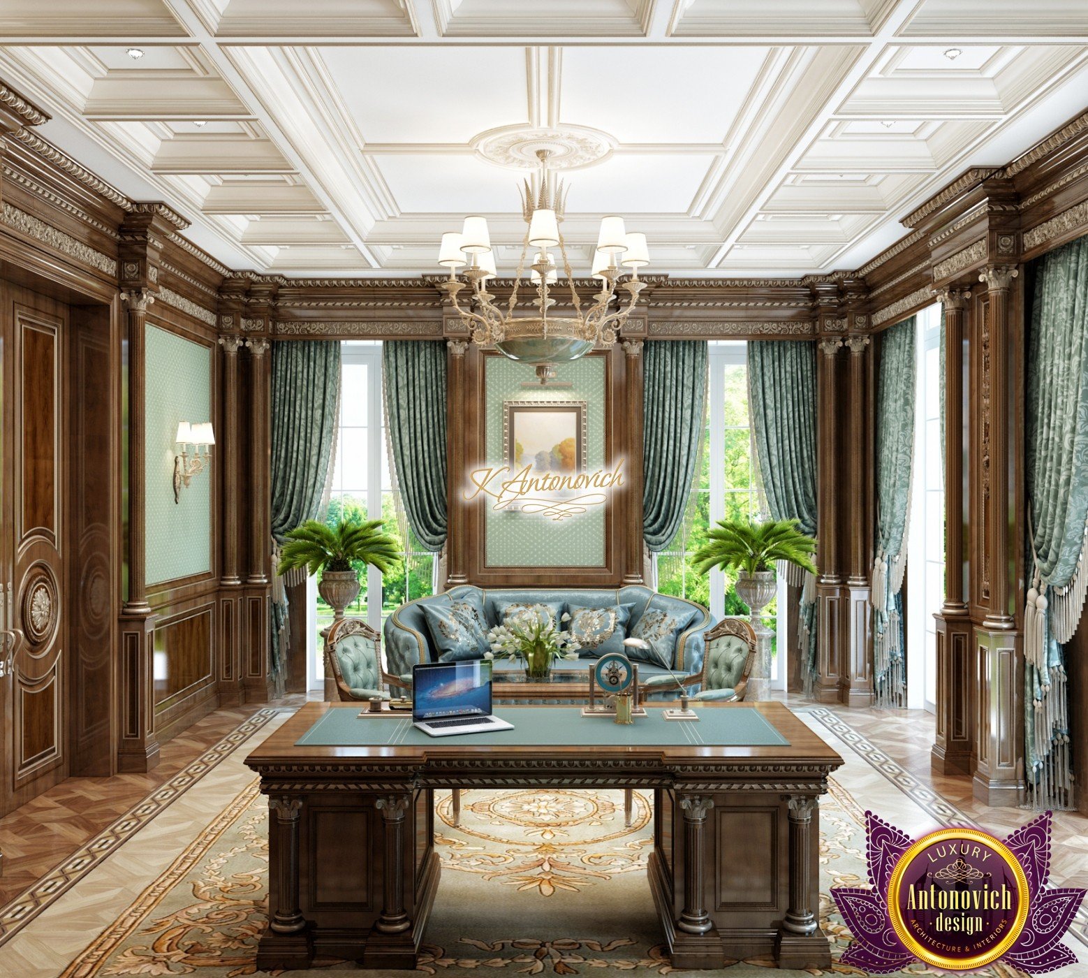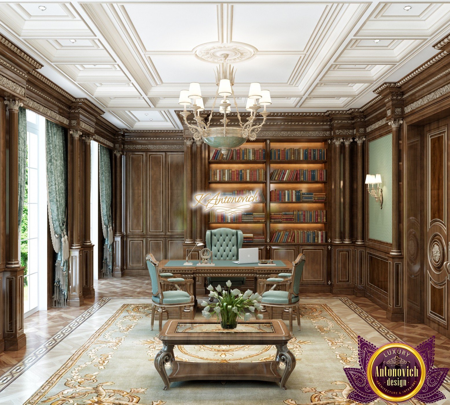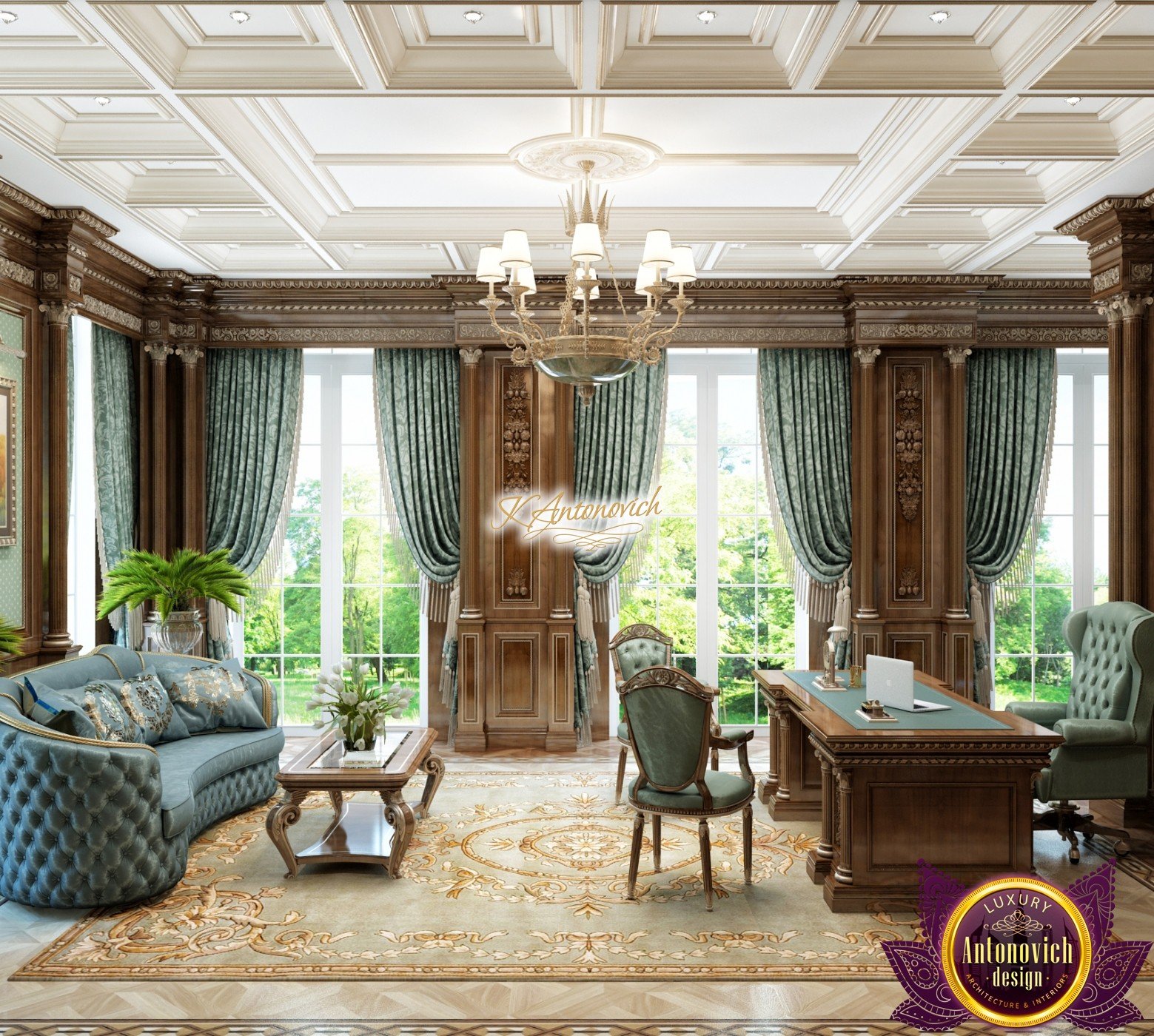 Производящий впечатление дизайн рабочего офиса в классическом стиле студии Антонович Дизайн (Antonovich Design) наполнен атмосферой солидности и благородства. Этот классический офисный интерьер сочетает натуральное дерево ценных пород, которое играет ведущую роль и задает тон представительной роскоши. Стены почти полностью отделаны этим благородным материалом.Буазери украшено красивыми тканевыми обоями с классическим орнаментом. В таких проектах тканевые обои для офиса успешно заменяют стандартные покрытия — это идеальный выбор для оформления элитных интерьеров. Такой офис в классическом стиле подчёркивает статус владельца. Интерьер рабочего кабинета становится ещё более стильным и комфортным благодаря продуманным деталям. Этот рабочий кабинет в классическом стиле сочетает деловую сдержанность и домашний уют. Особую роль в создании уюта играет оформление окон в кабинете. Особенность этой комнаты — несколько высоких окон.Шторы в кабинете органично соответствуют концепции дизайна в классическом стиле.Красивые шторы добавили деловой и сдержанной атмосфере нотки домашнего тепла. Конечно, важную роль здесь играет офисная мебель в классическом стиле: удобный стол и кресла дополняются мягкими диванами. Ведь важная часть эффективной работы — это комфортное и уютное пребывание. Дизайнеры студии Антонович Дизайн гармонично сочетают деловую атмосферу с теплом домашнего уюта, создавая элитный офисный интерьер. Для декора пола авторы проекта предложили паркет елочкой в кабинете и натуральный ковер. Паркет елочкой в кабинете идеально вписывается в классический дизайн офиса и всегда привносит оттенок благородства в помещение. Паркет в Дубае, который предлагает наша дизайн‑студия, позволяет создавать интерьеры, которые будут радовать не одно поколение семьи.И частный кабинет станет вдохновляющим пространством для владельца престижного дома.