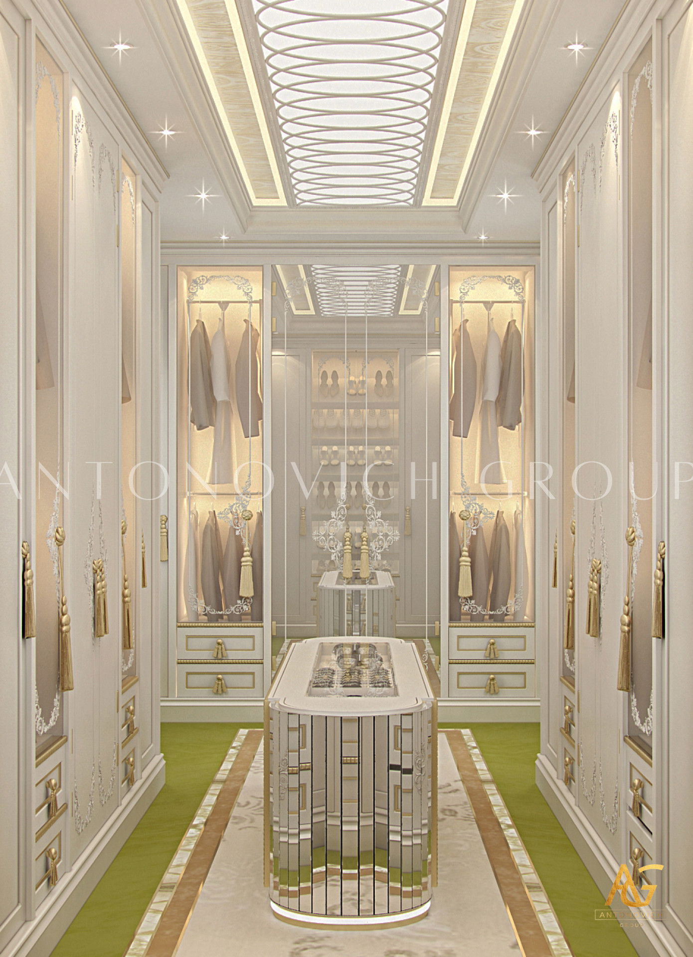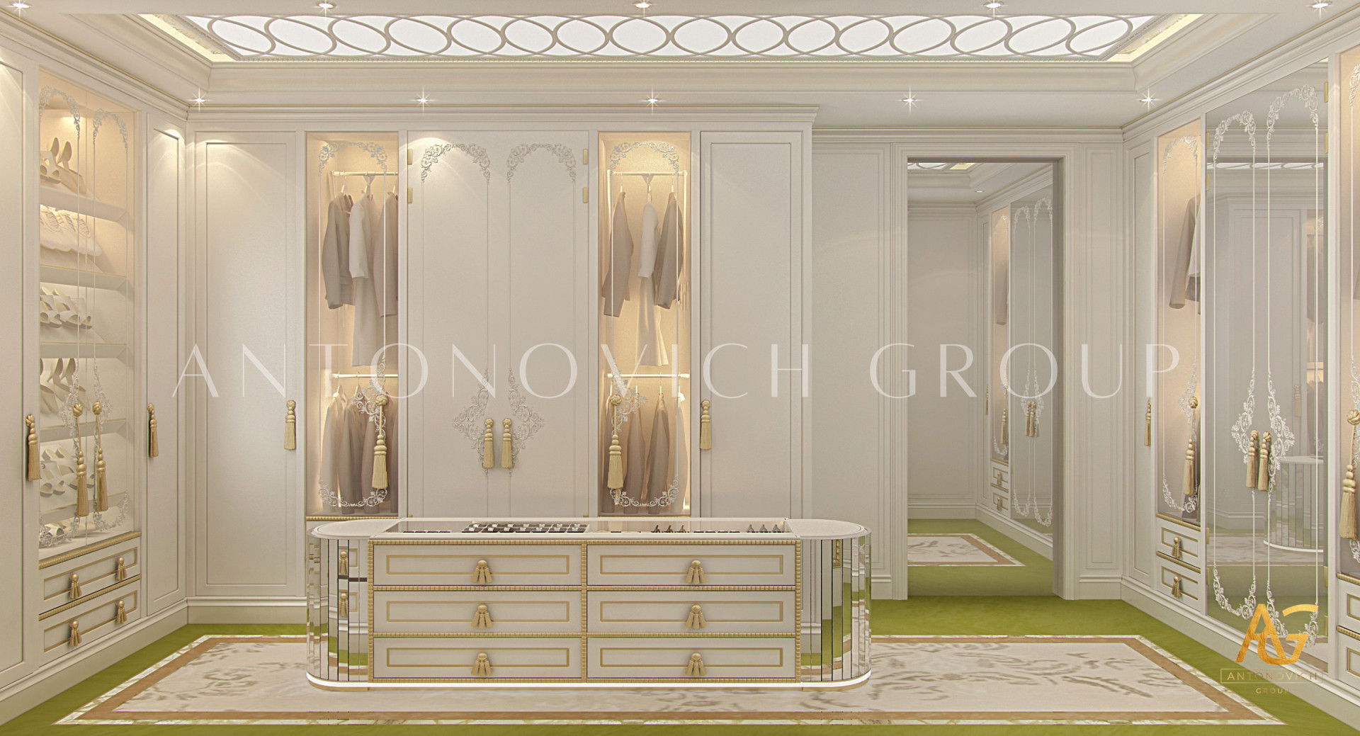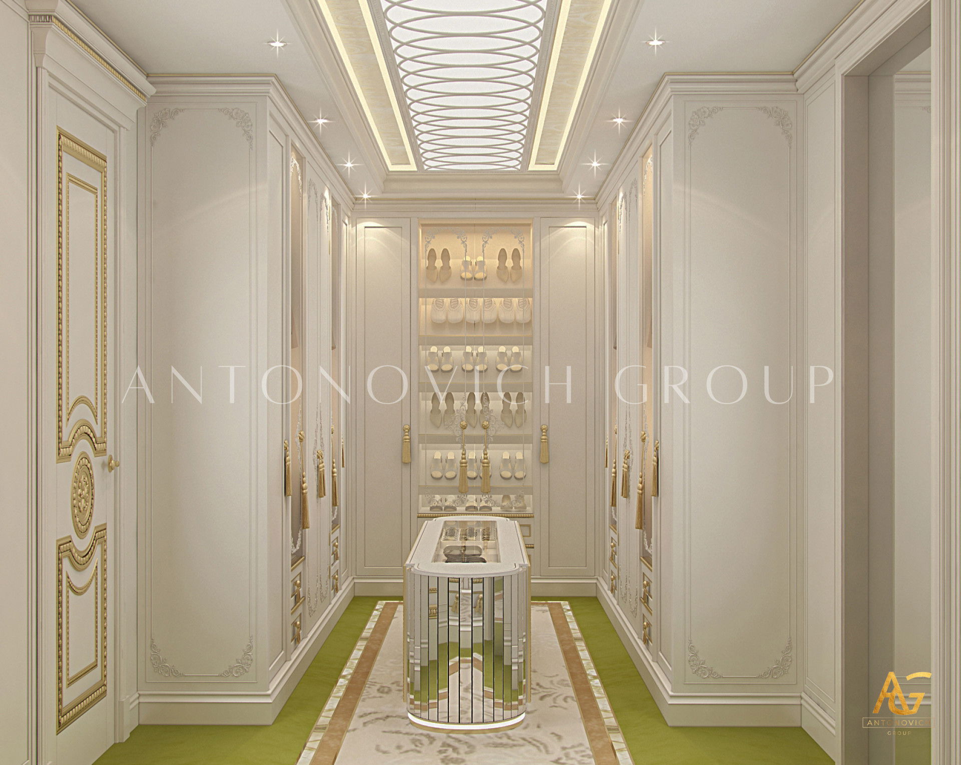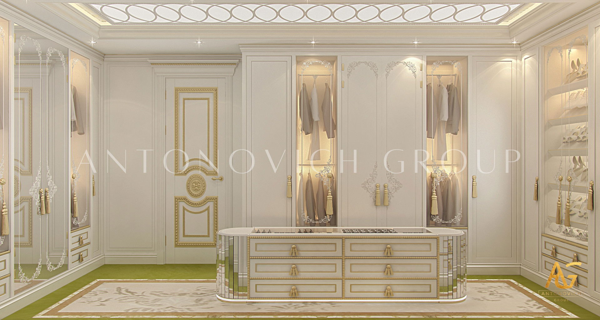 Важно выбрать благородный оттенок. Здесь представлен кремовый интерьер гардеробной, который сохраняет уют и не делает пространство монотонным — такой стиль ценят самые состоятельные в Дубае. Эта работа — дизайн гардеробной в Дубае. Этот проект гардеробной для квартиры демонстрирует продуманную планировку гардеробной комнаты и аккуратно организованы встроенный шкаф-гардероб и полки. Обращает на себя внимание планировка гардеробной комнаты. Здесь виден интерьер гардеробной комнаты. Результат — гардеробная мечты для женщин. Талантливые дизайнеры Антонович Дизайн (Antonovich Design) отвечают за привлекательность интерьер гардеробной комнаты.