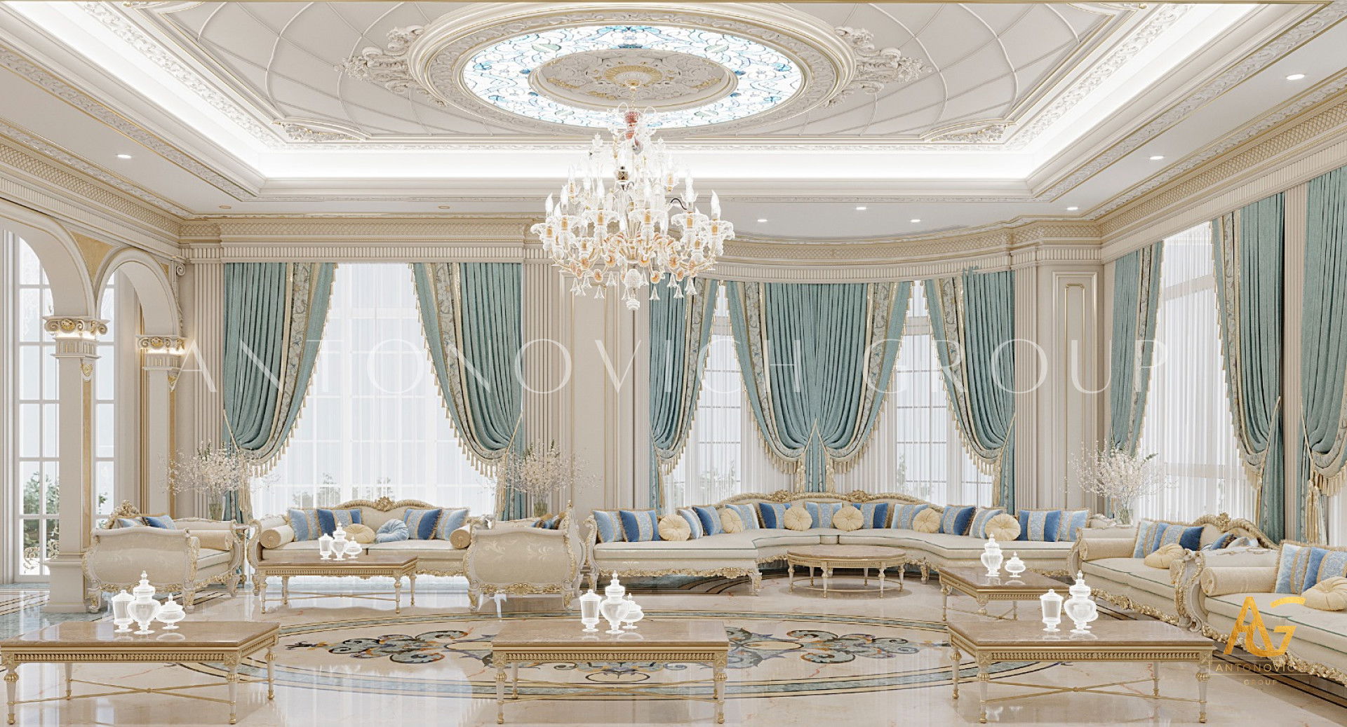 - Роскошные гостиные с мебелью на заказ, изысканными тканями и декоративными потолками.