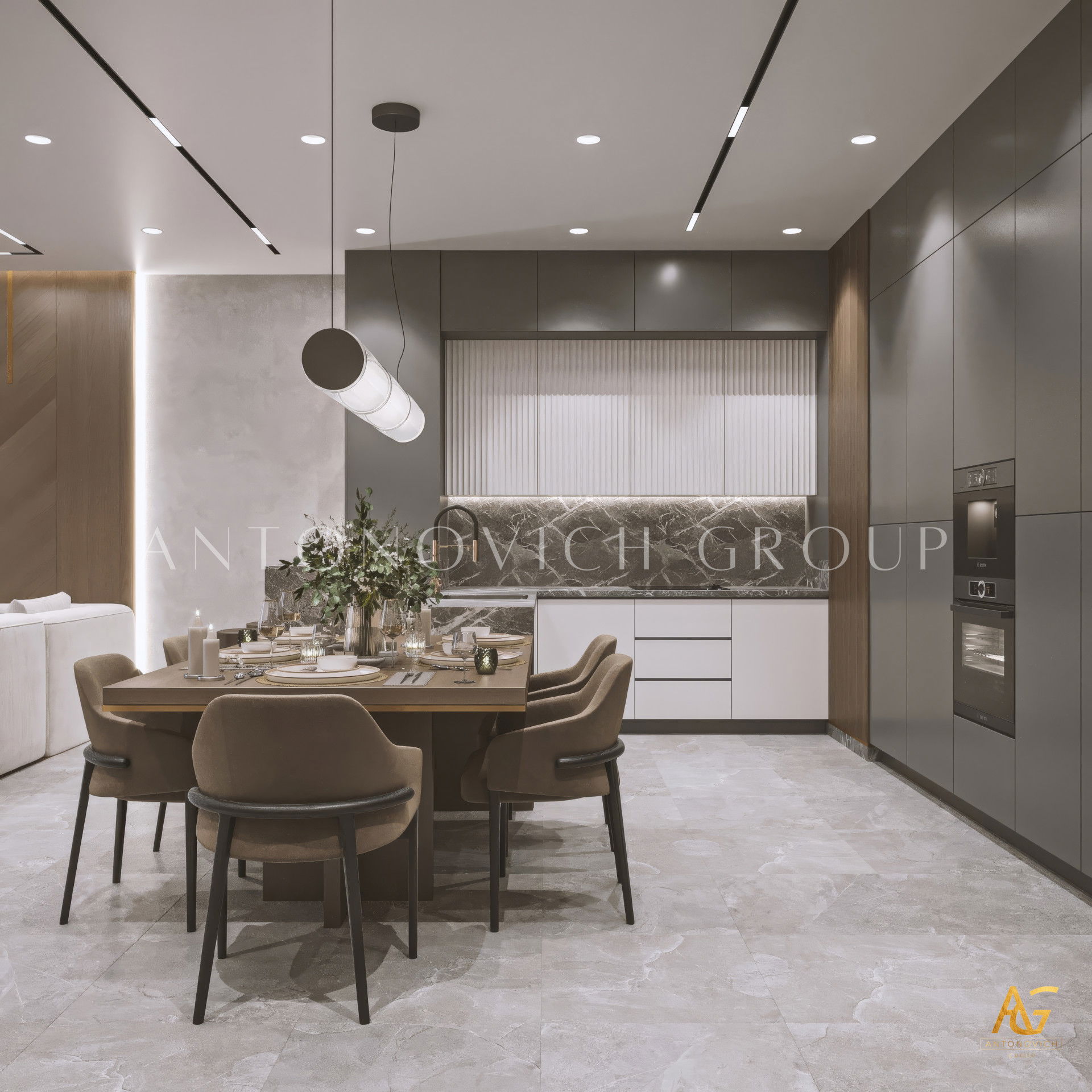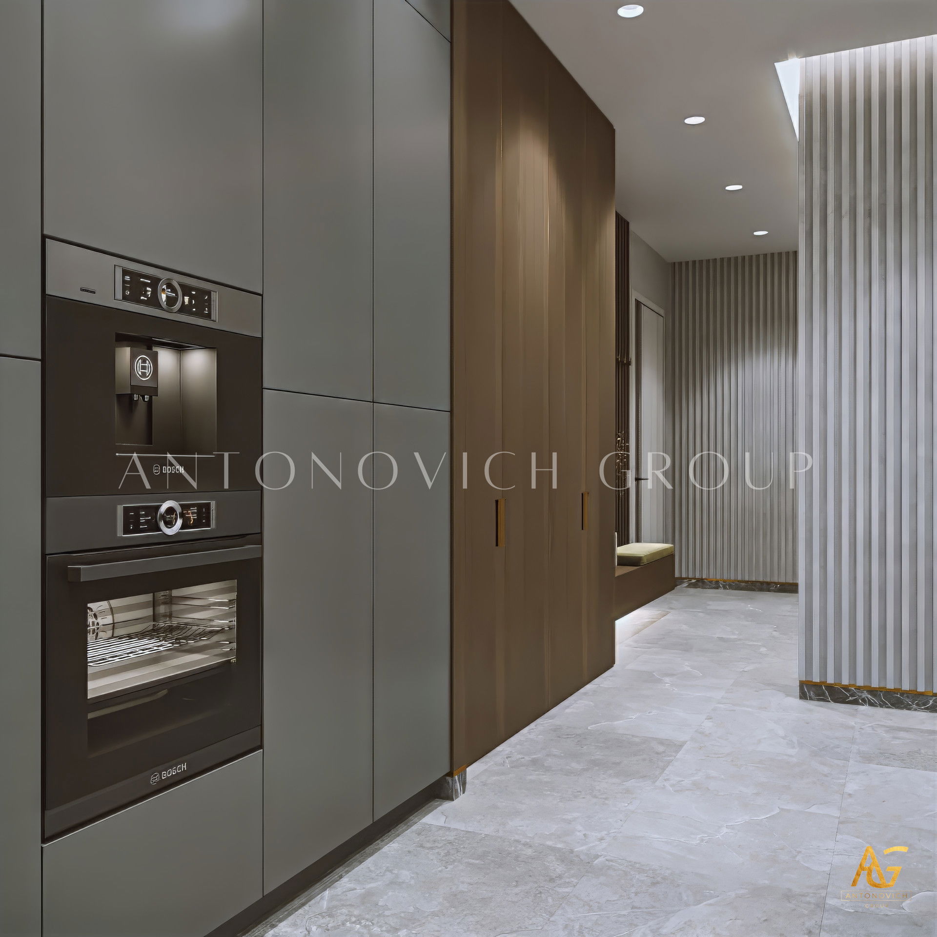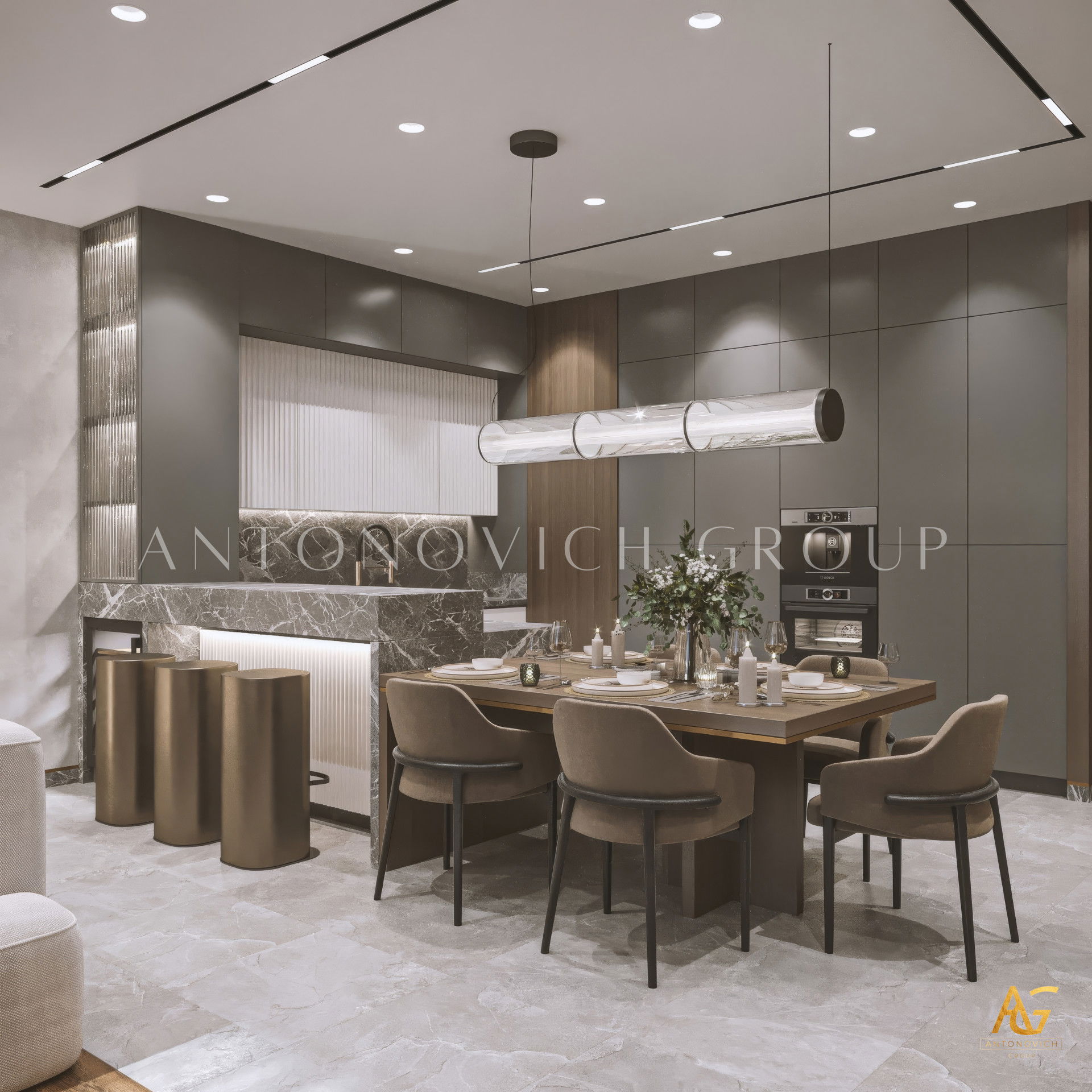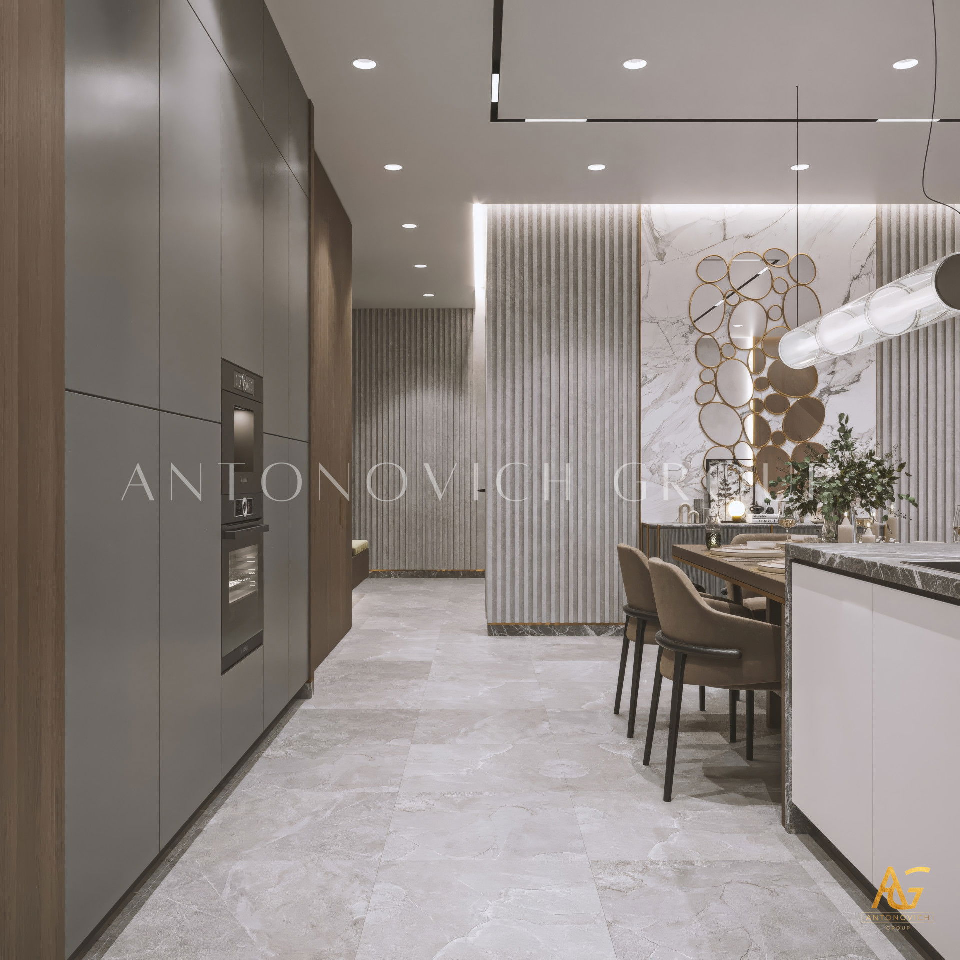 Профессионалы Антонович Дизайн умеют использовать серый как базовый цвет вместе с белым и бежевым. В итоге он доминирует в интерьере кухни и лишь оттеняется яркими акцентами других цветов. Серый прекрасно гармонирует с деревом, что облегчает подбор мебели для кухни. Цвет пепла в интерьере может создавать как эффектную роскошь, так и элегантную минималистичную простоту. Обилие декоративных элементов и массивная мебель не кажутся тяжёлыми на сером фоне. Важно правильно сделать выбор оттенков для кухонных стен и пола.